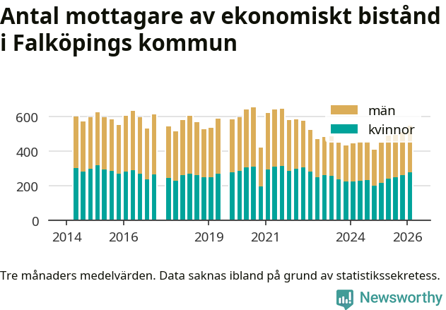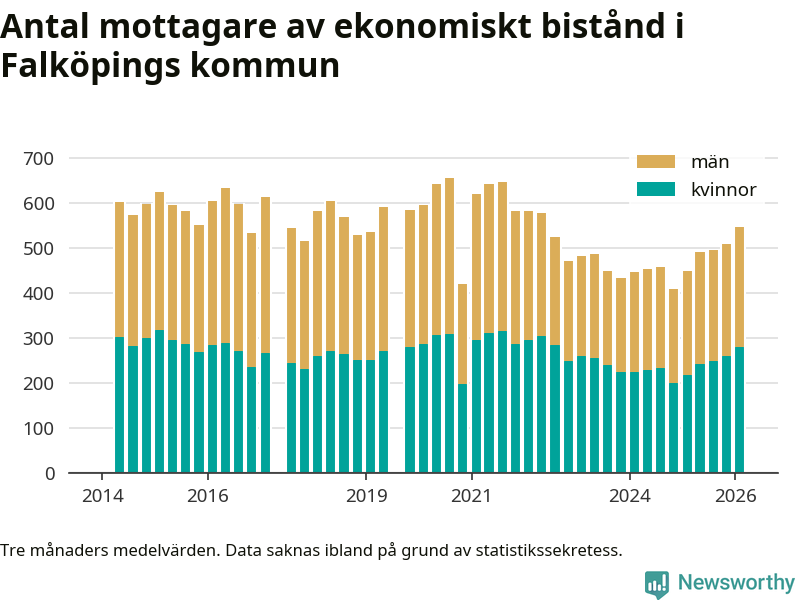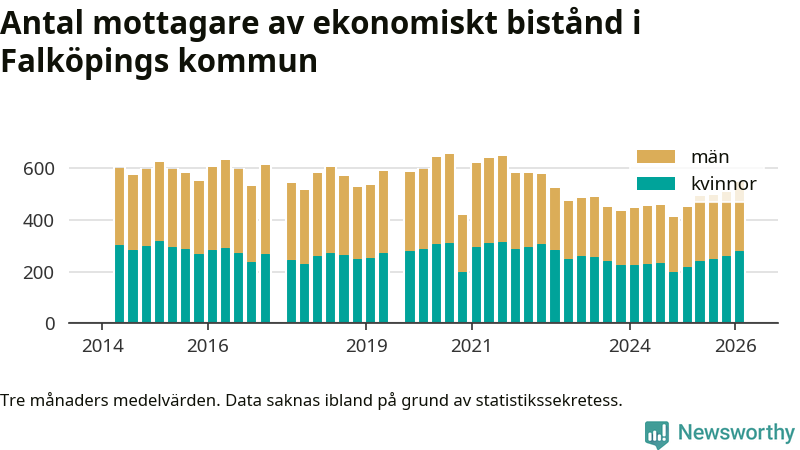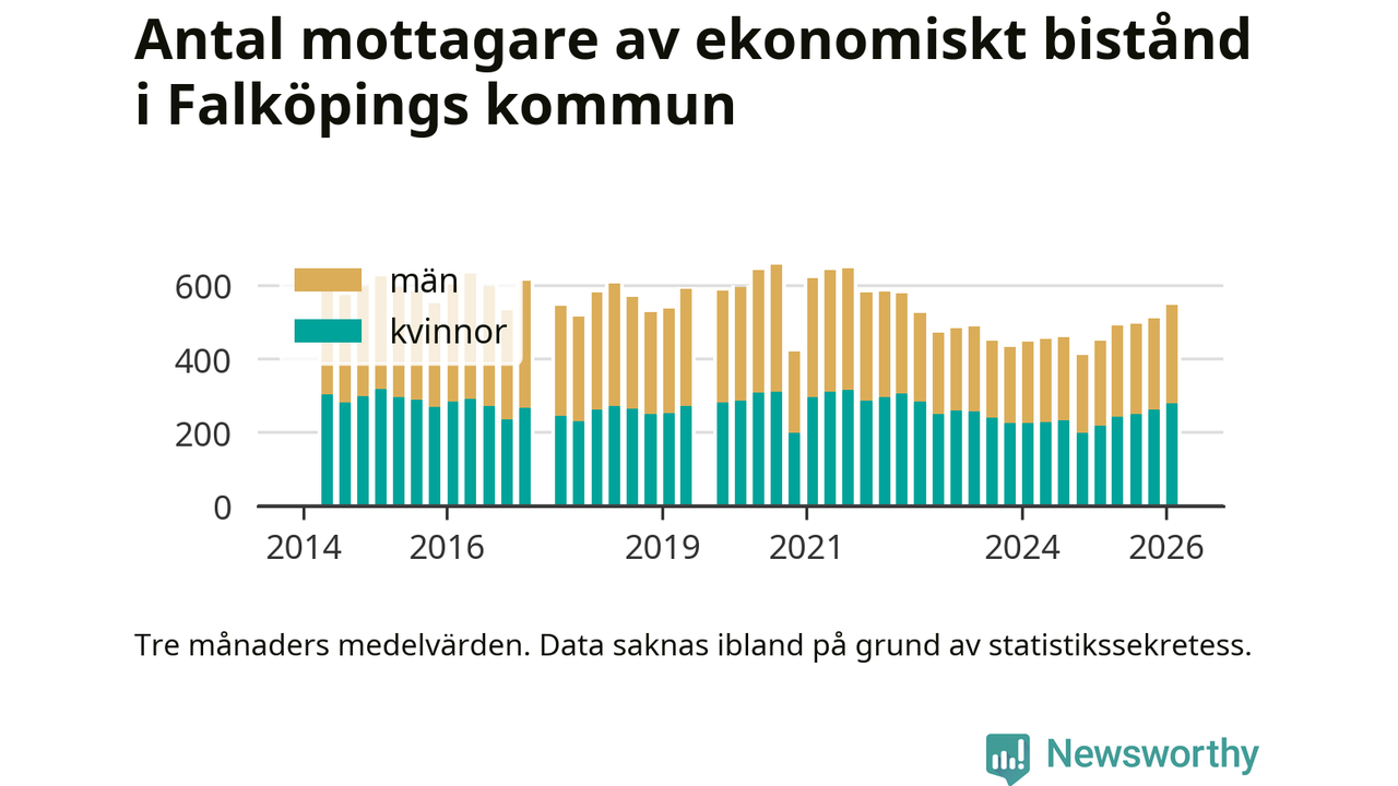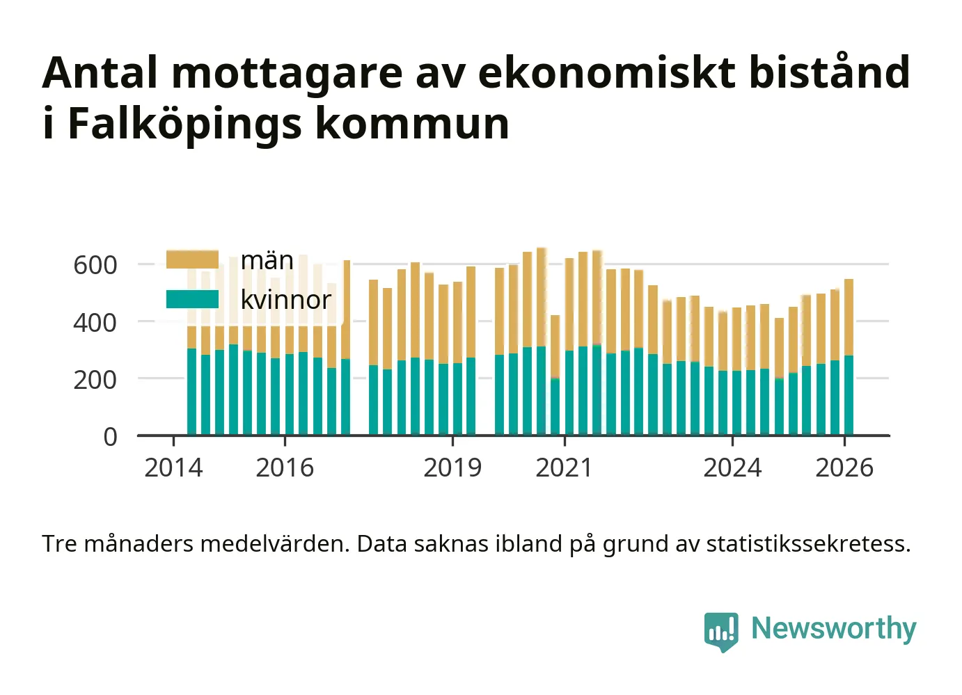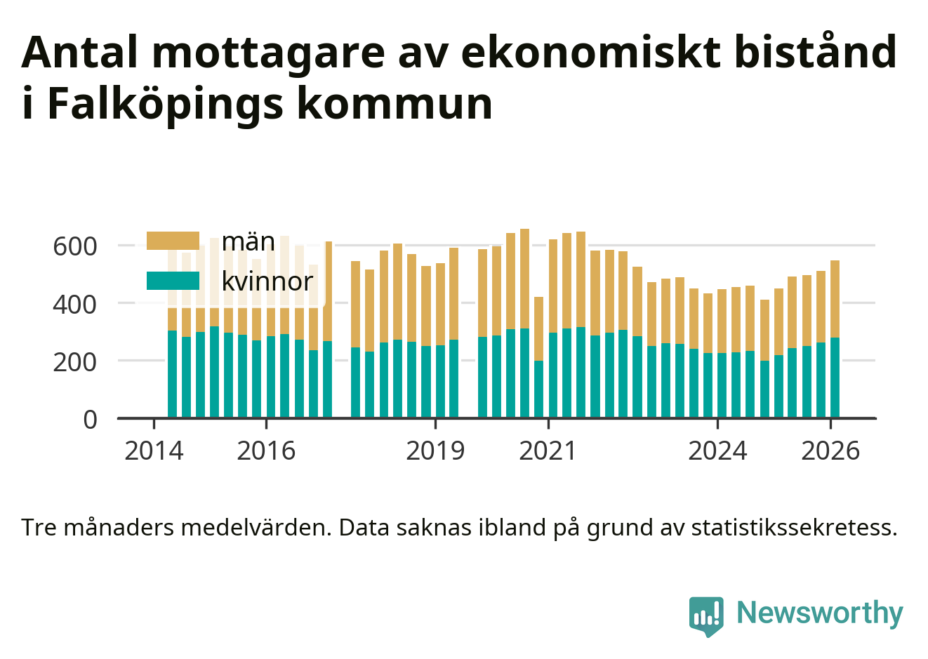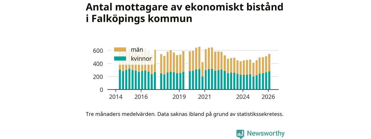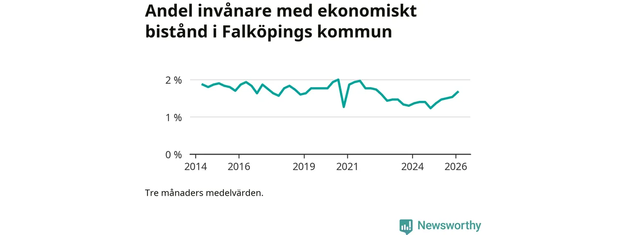 I genomsnitt 547 personer per månad fick ekonomiskt bistånd i Falköpings kommun under vintermånaderna (december till februari), vilket motsvarar 1,7 procent av den vuxna befolkningen. Det är en ökning med 0,1 procentenheter eller 38 personer jämfört med i höstas, och något större andel än under vintern för ett år sedan.