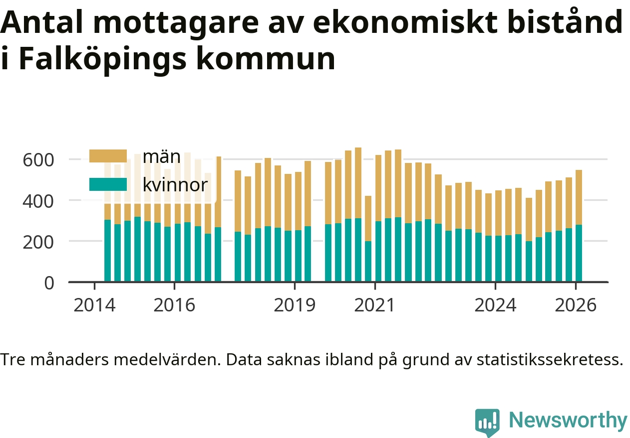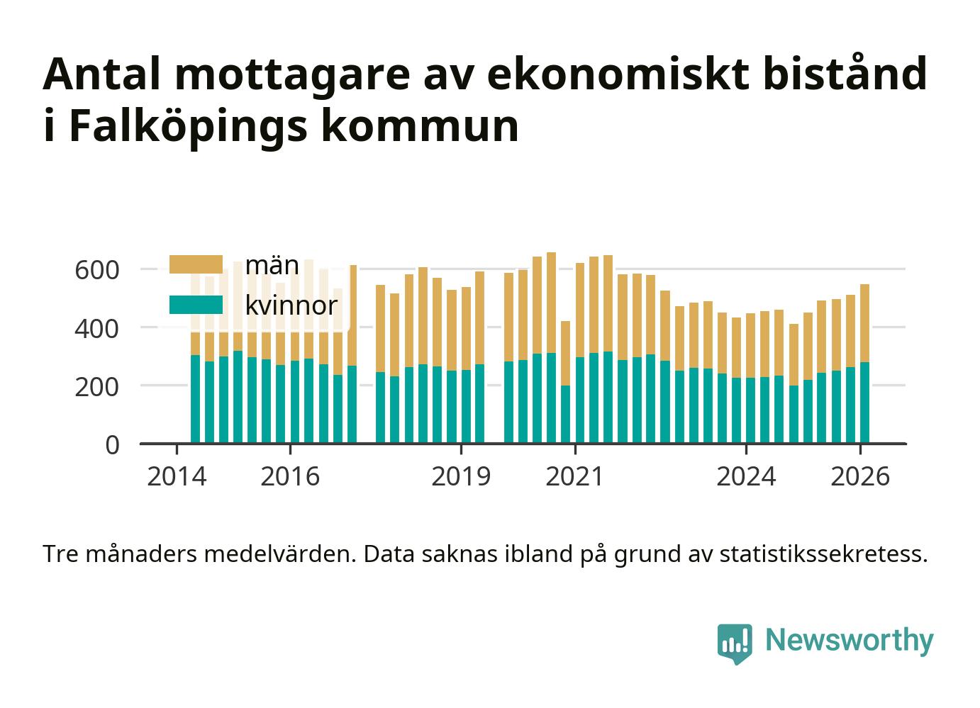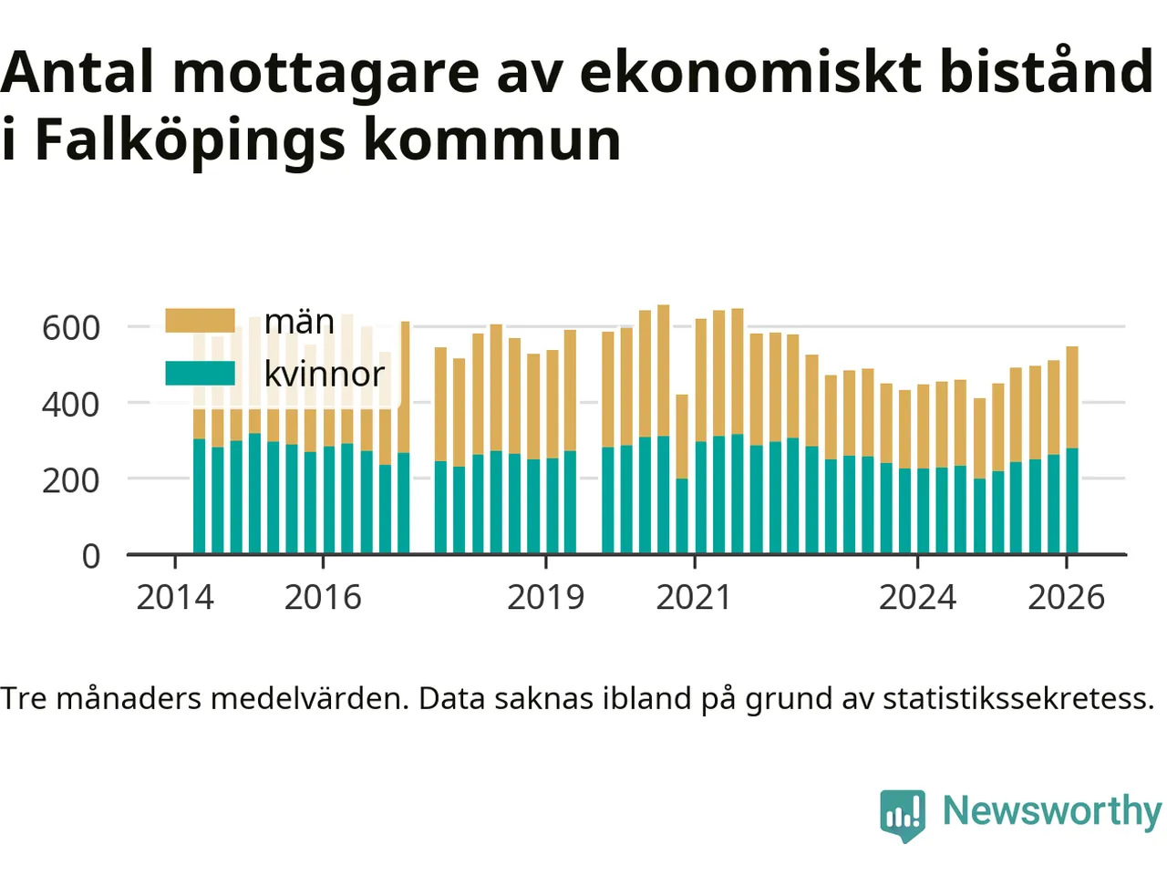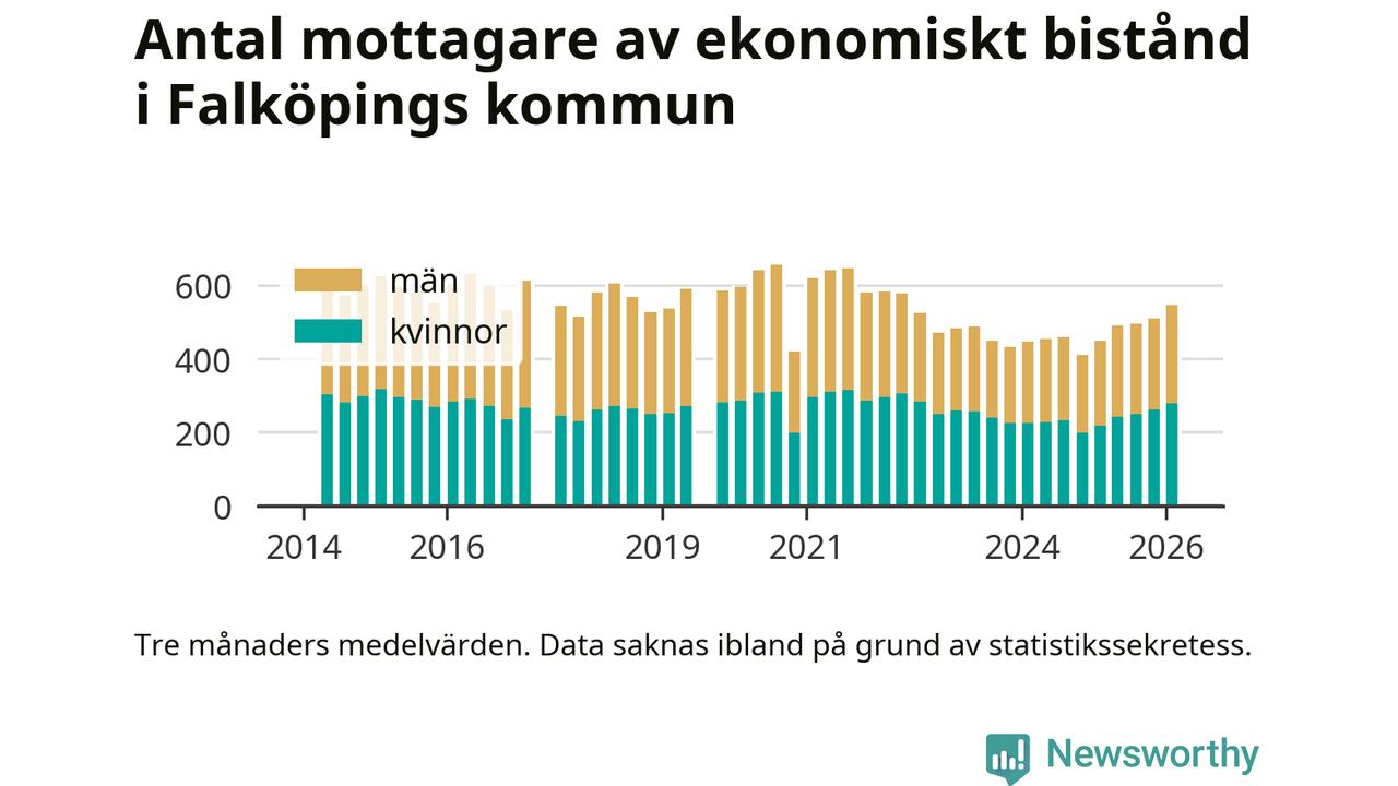 Andelen invånare med ekonomiskt bistånd i Falköpings kommun var högre under vintern än under tremånadersperioden innan. Det visar den senaste, preliminära statistiken från Socialstyrelsen.