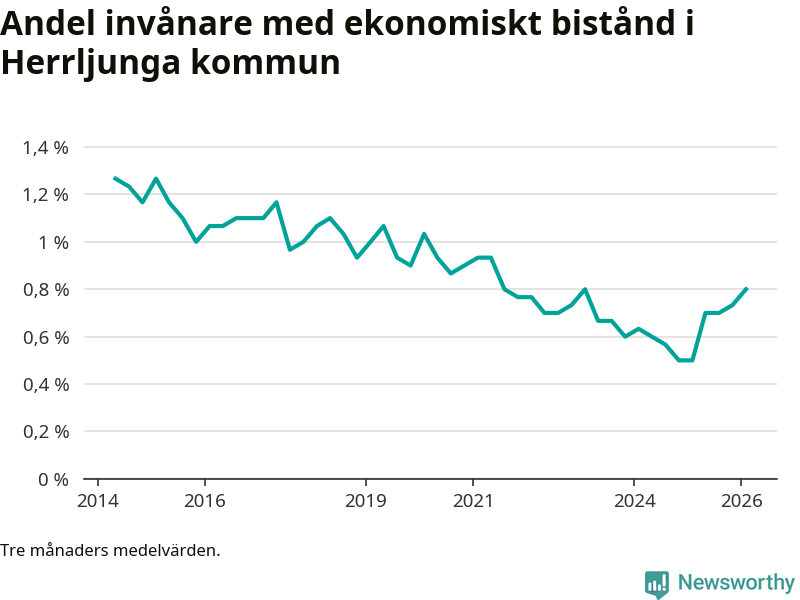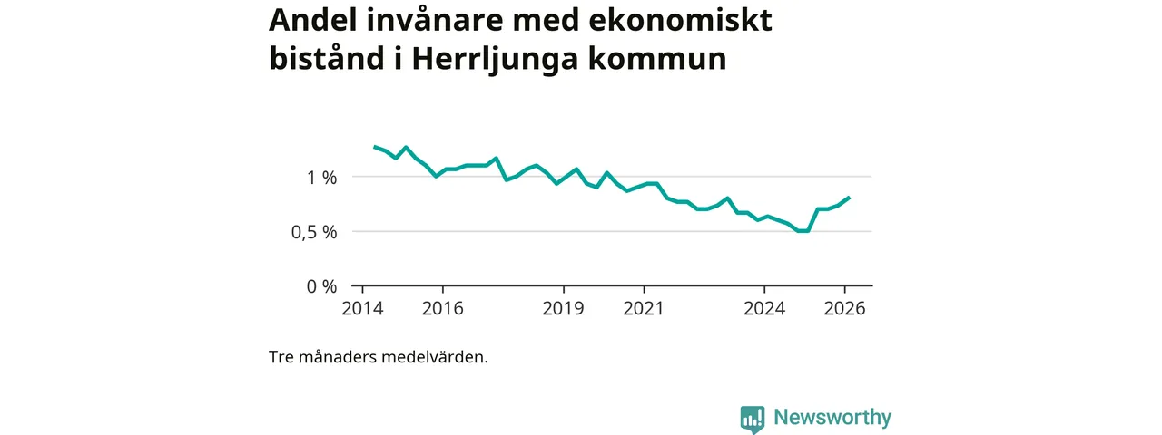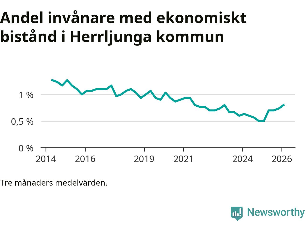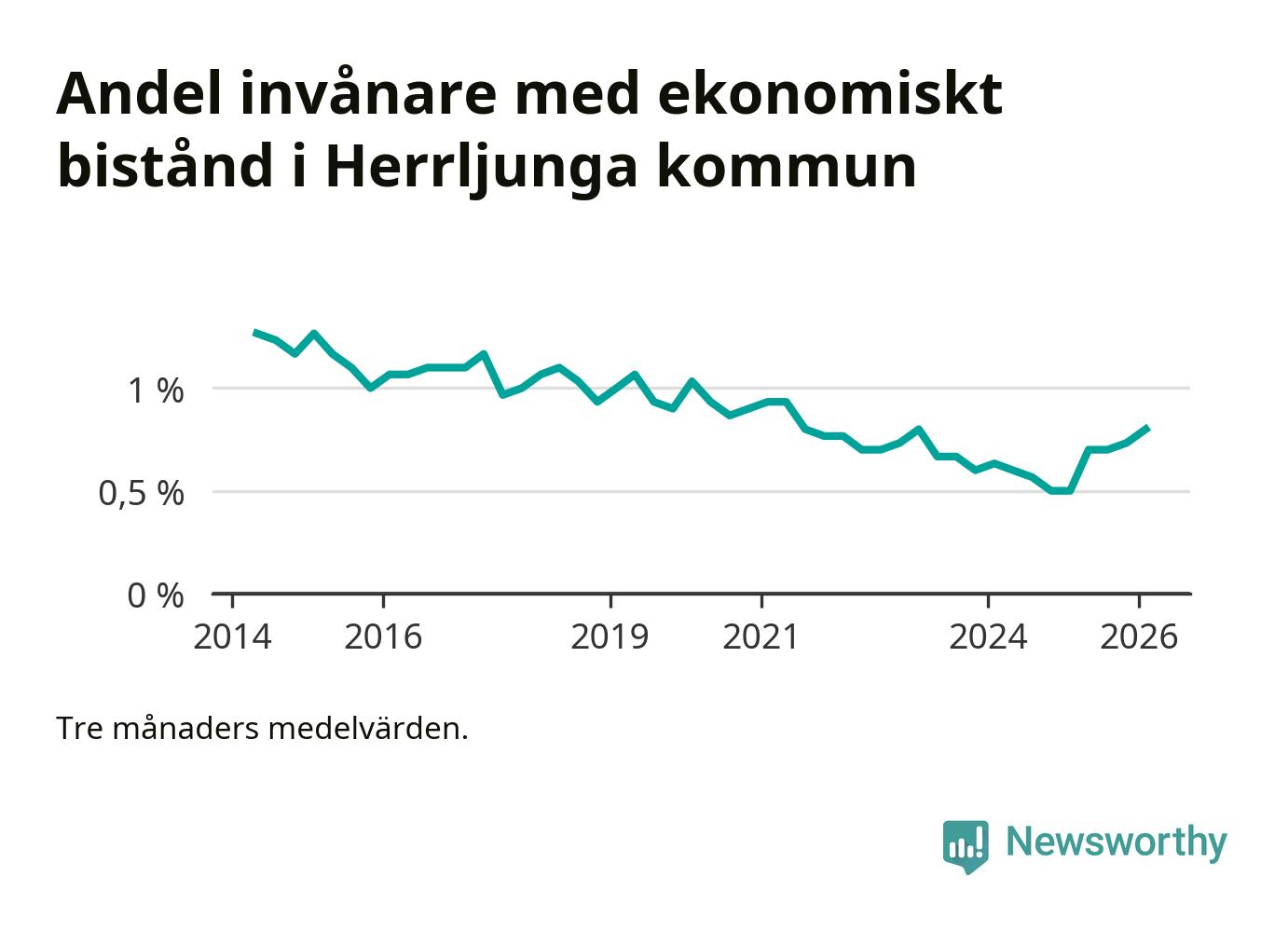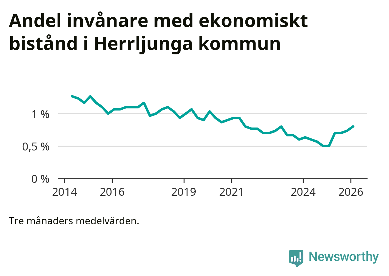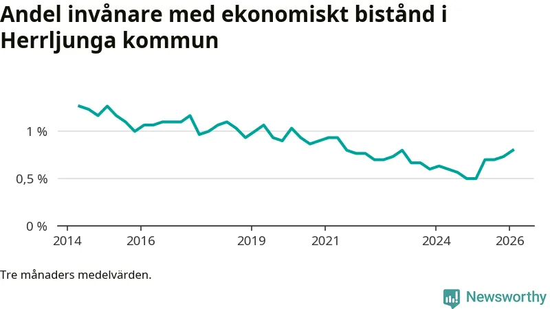 I genomsnitt 76 personer per månad fick ekonomiskt bistånd i Herrljunga kommun under vintermånaderna (december till februari), vilket motsvarar 0,8 procent av den vuxna befolkningen. Det är marginellt mer än i höstas, och något större andel än under vintern för ett år sedan.