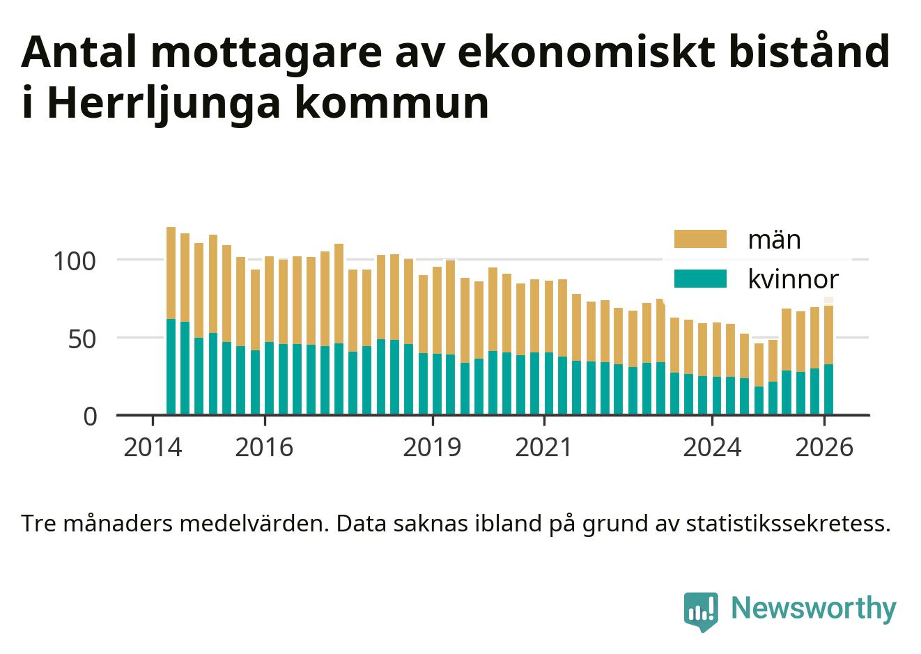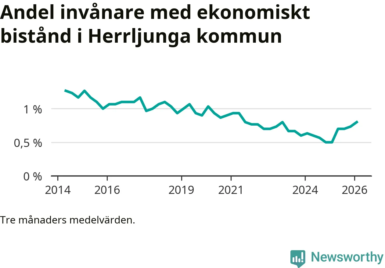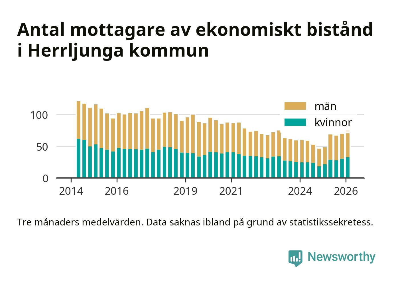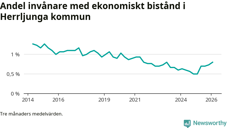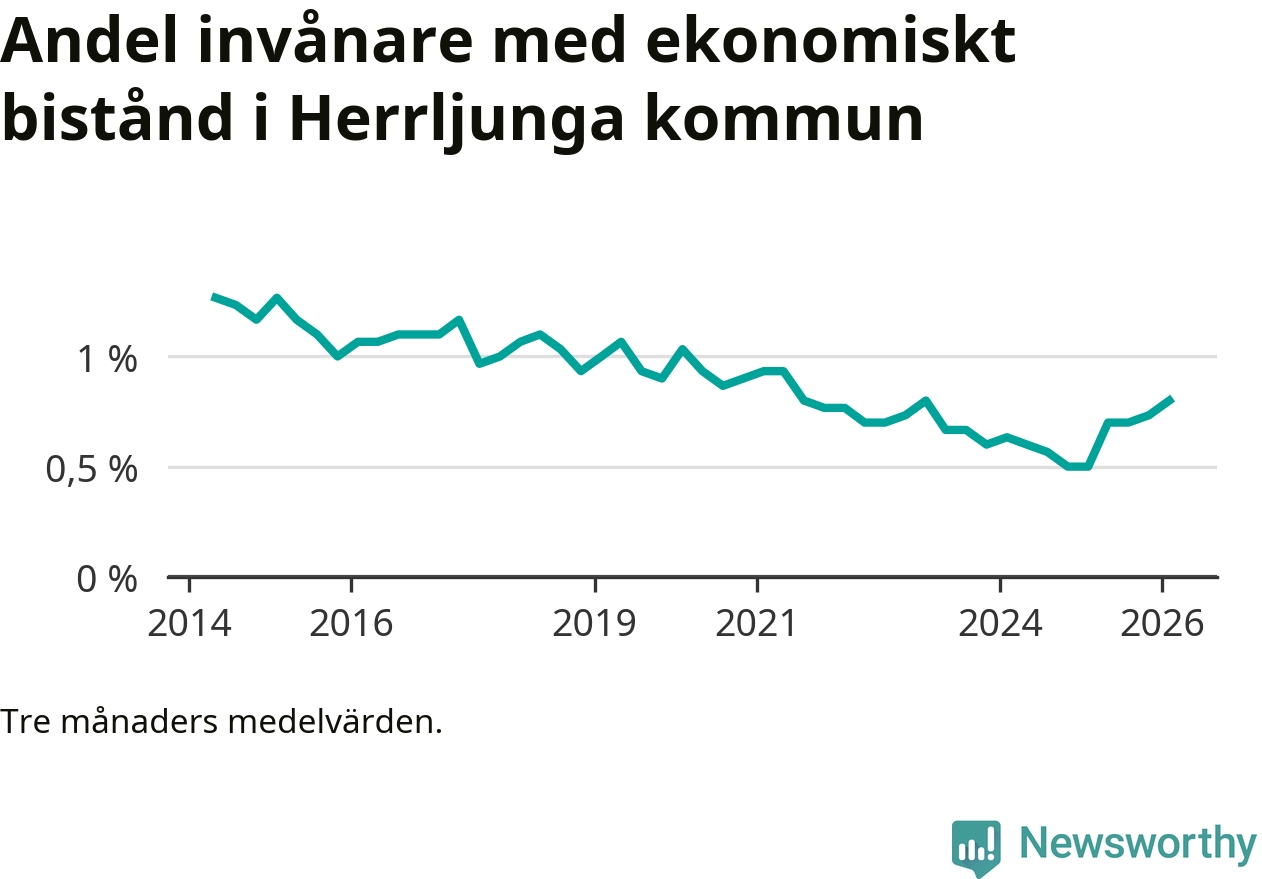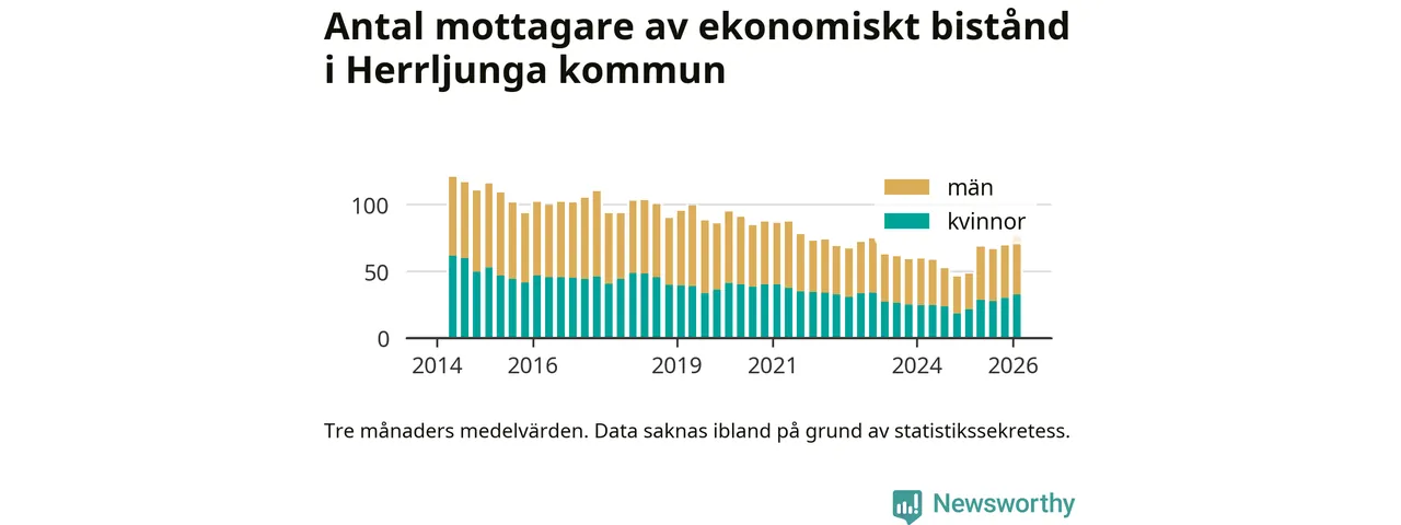 I genomsnitt 76 personer per månad fick ekonomiskt bistånd i Herrljunga kommun under vintermånaderna (december till februari), vilket motsvarar 0,8 procent av den vuxna befolkningen. Det är marginellt mer än i höstas, och något större andel än under vintern för ett år sedan.