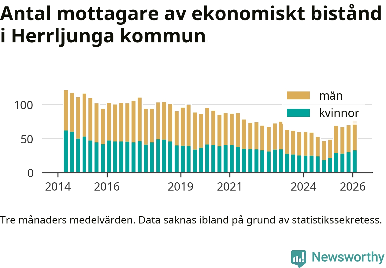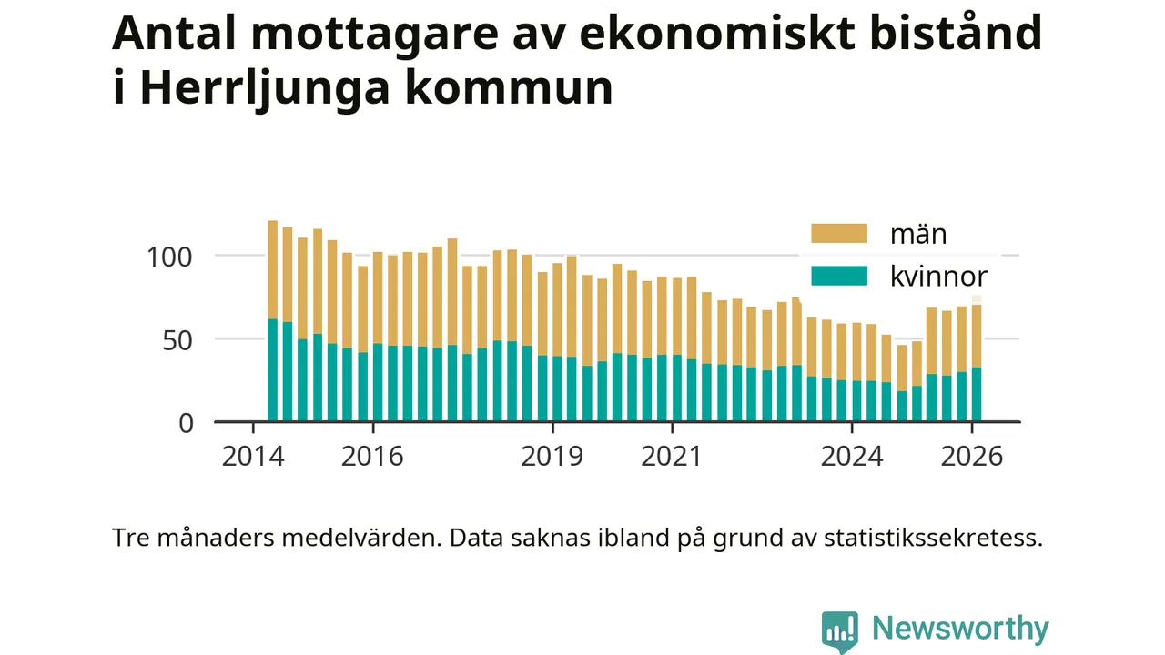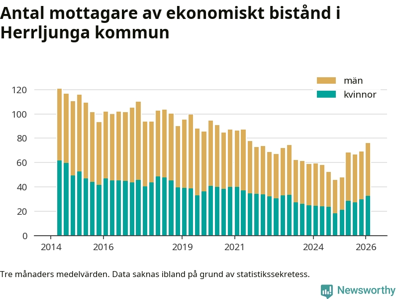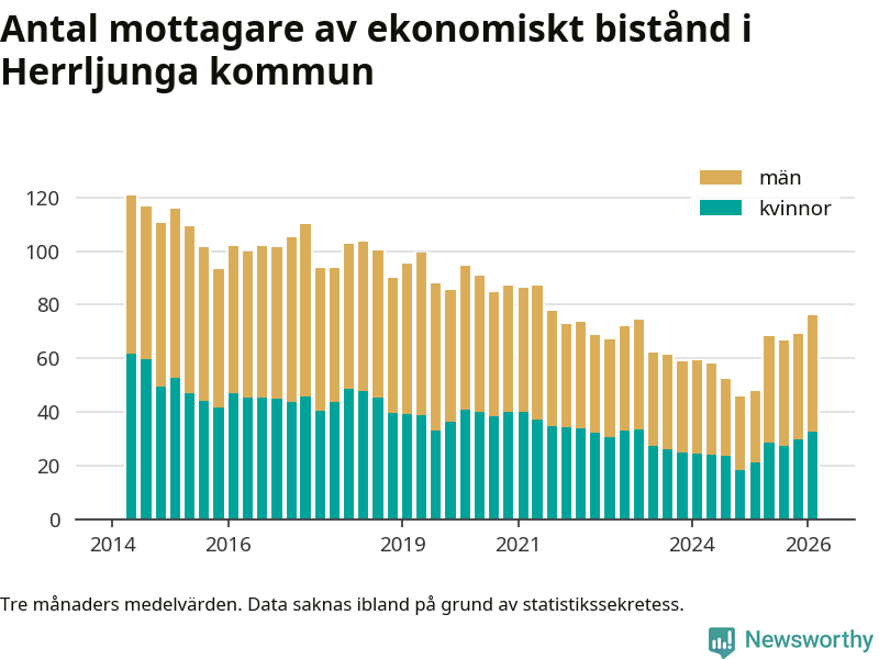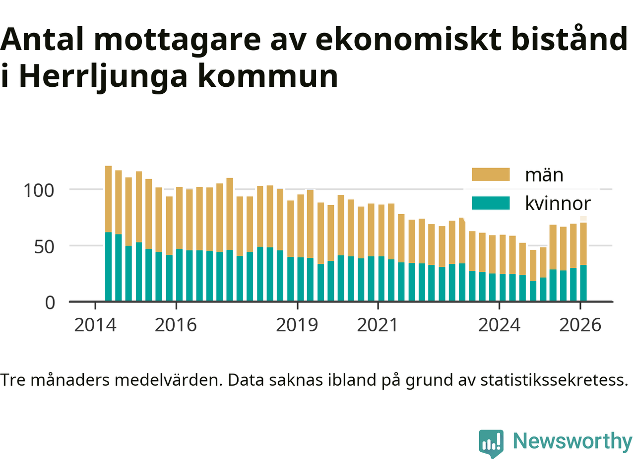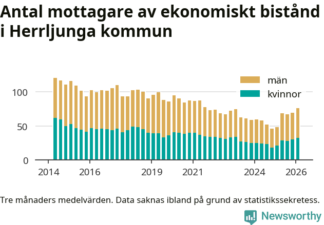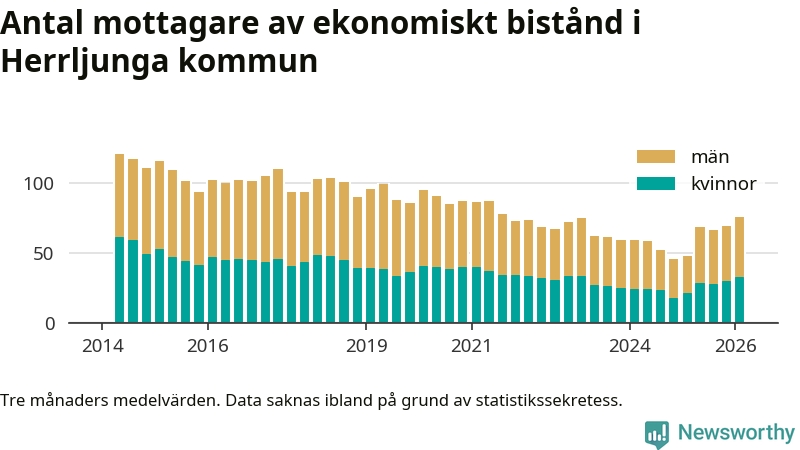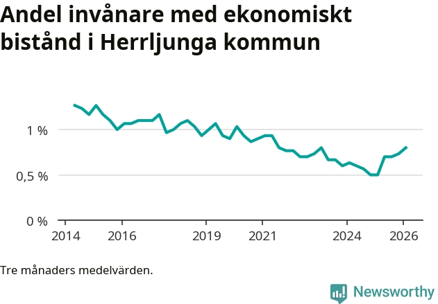 I genomsnitt 76 personer per månad fick ekonomiskt bistånd i Herrljunga kommun under vintermånaderna (december till februari), vilket motsvarar 0,8 procent av den vuxna befolkningen. Det är marginellt mer än i höstas, och något större andel än under vintern för ett år sedan.