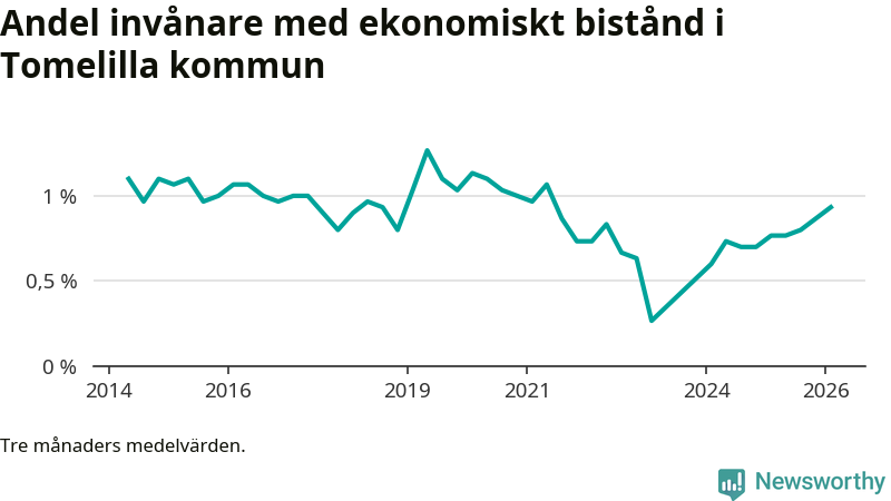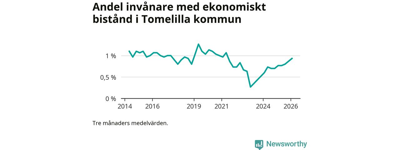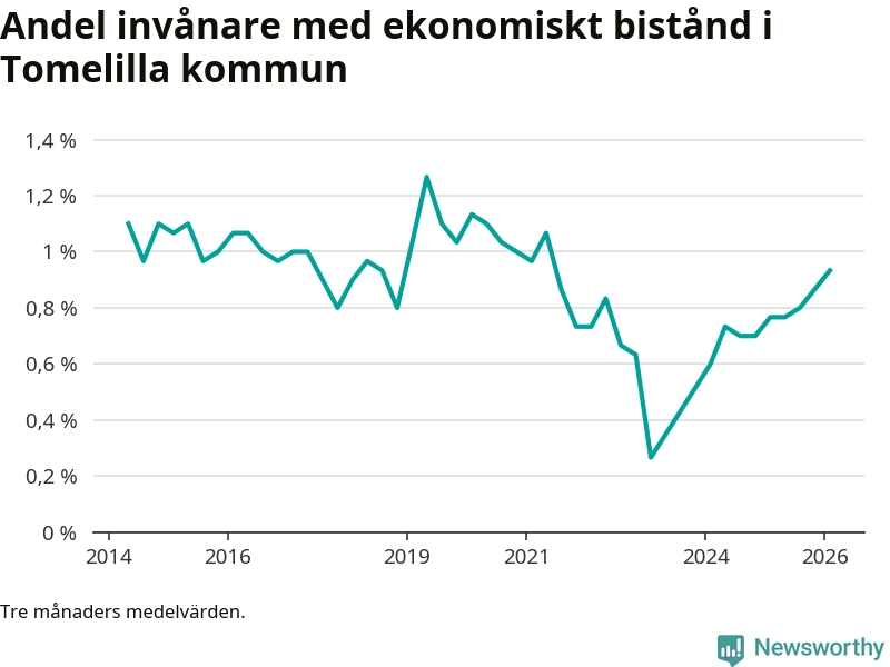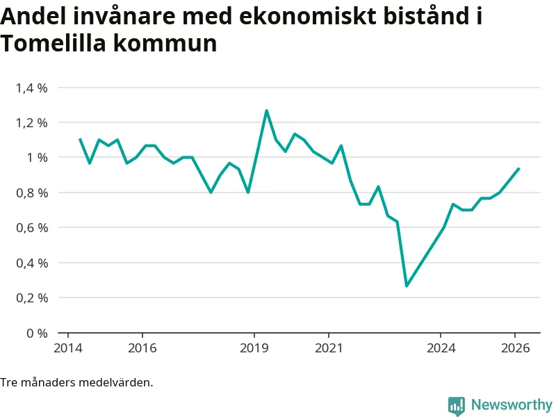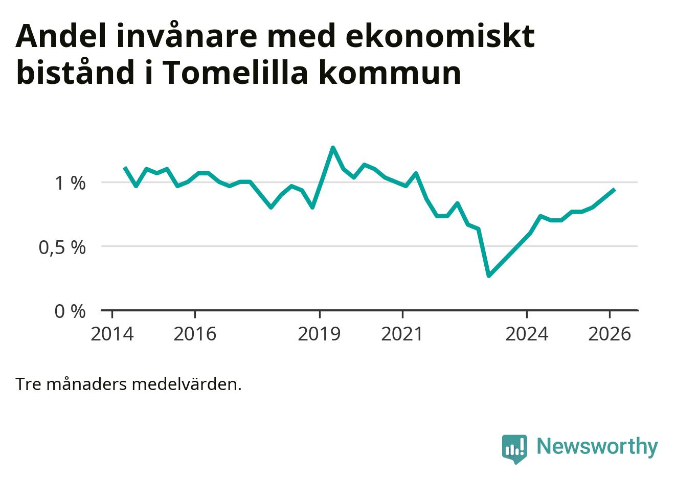 Den högsta andelen biståndstagare under det senaste decenniet hade kommunen under våren 2019 (1,3 procent), och den lägsta andelen under vintern 2023 (0,3 procent).