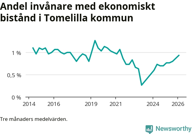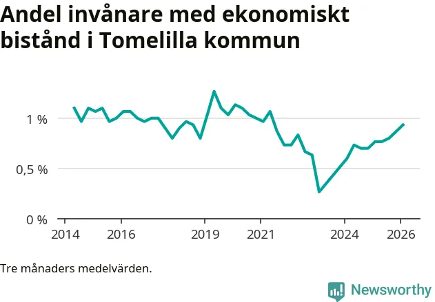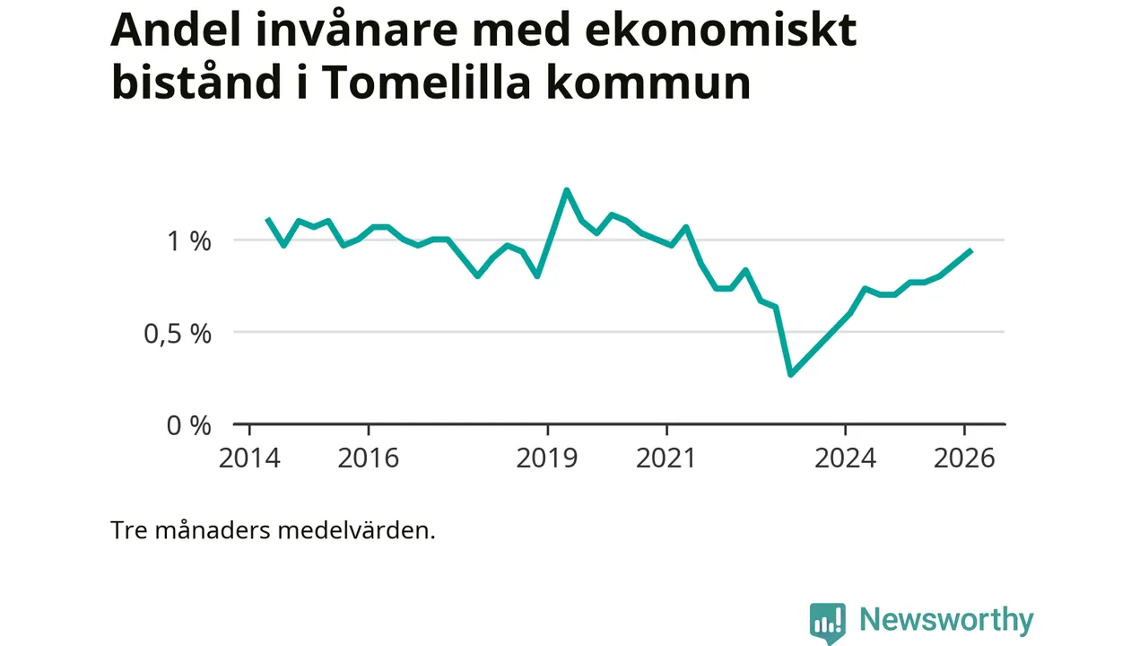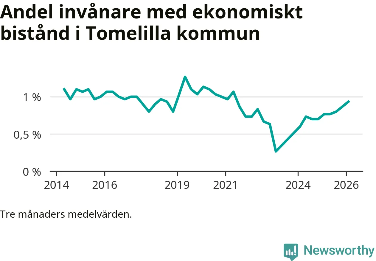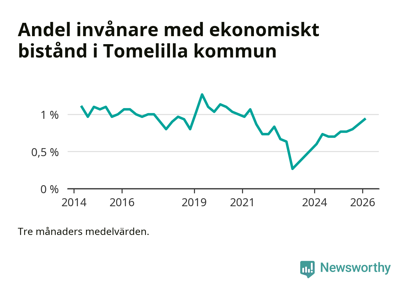 Den högsta andelen biståndstagare under det senaste decenniet hade kommunen under våren 2019 (1,3 procent), och den lägsta andelen under vintern 2023 (0,3 procent).