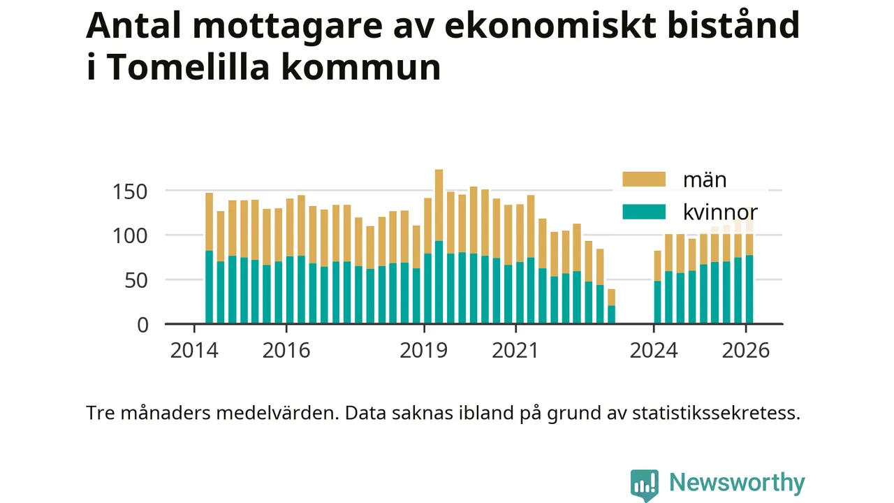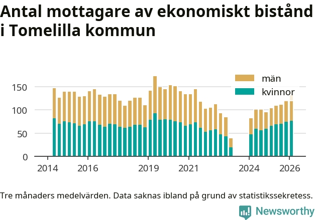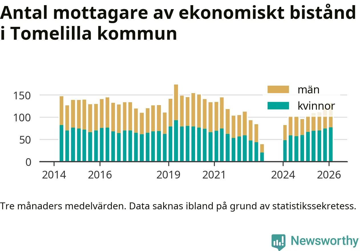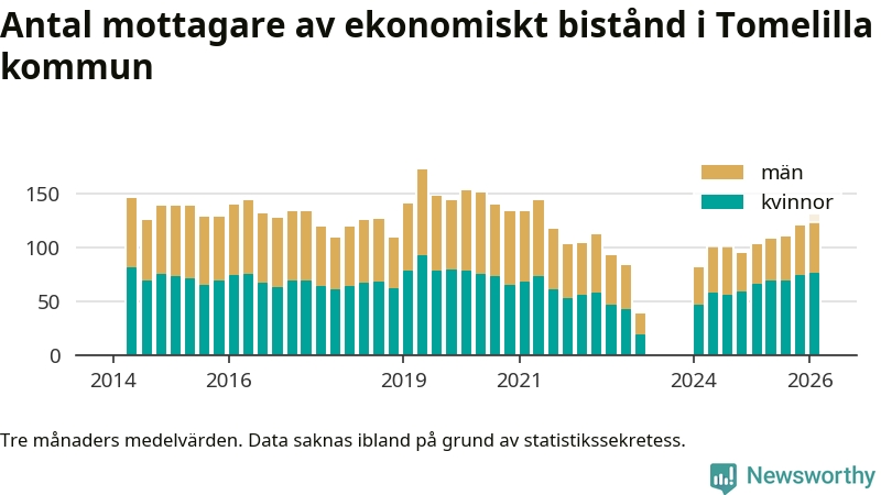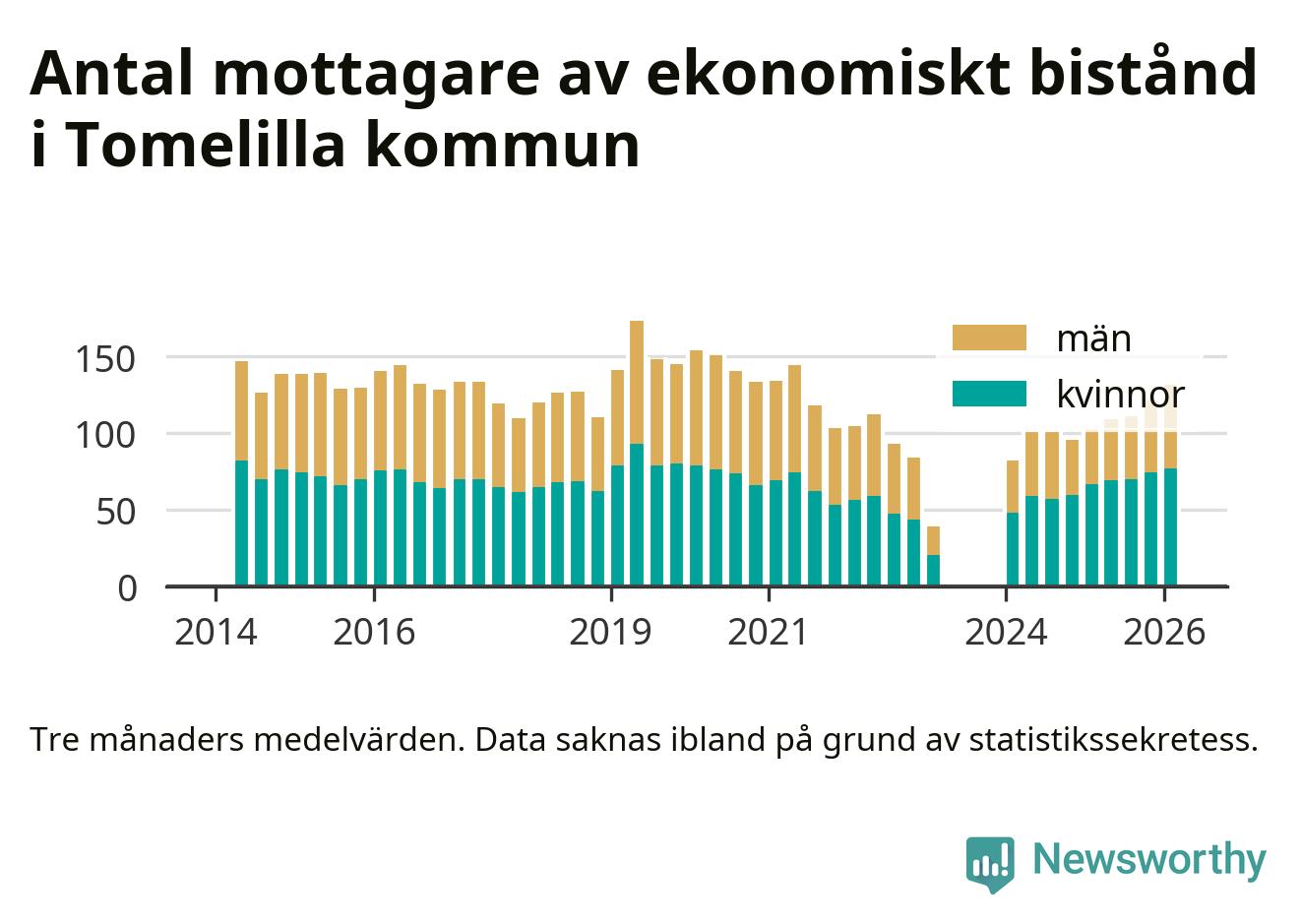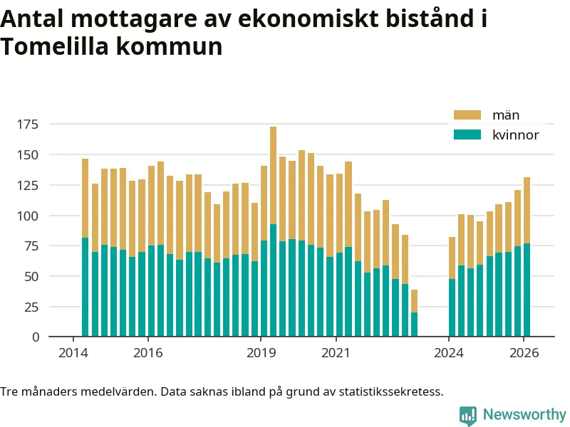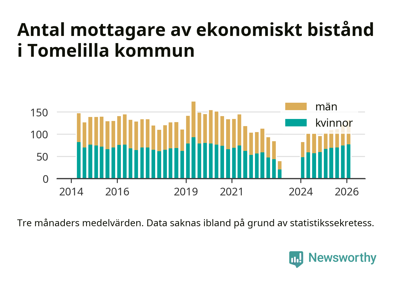 En majoritet av biståndstagarna var kvinnor: I genomsnitt 54 män och 77 kvinnor fick ekonomiskt bistånd varje månad under vintern.
