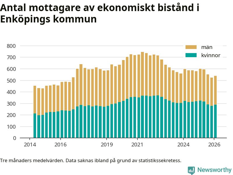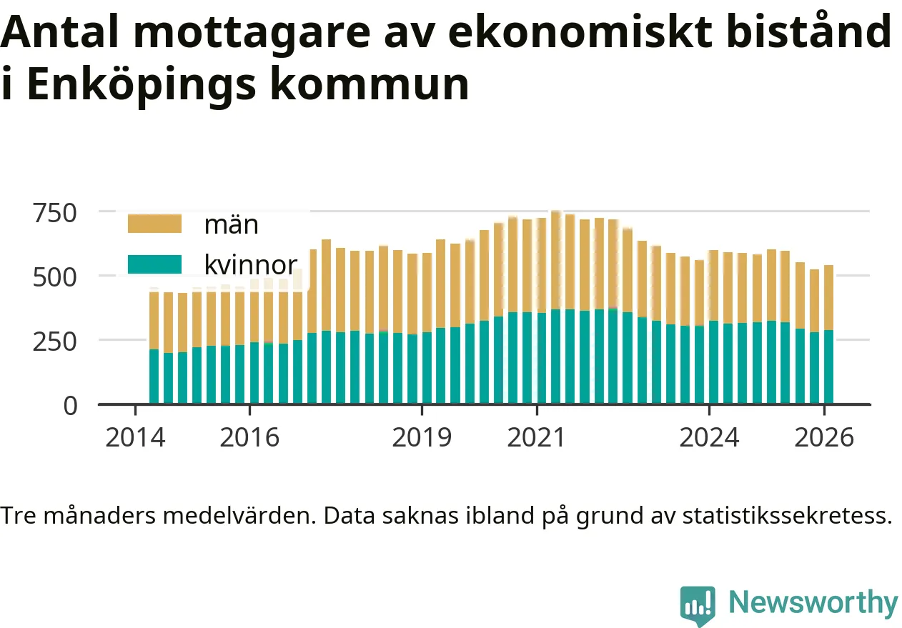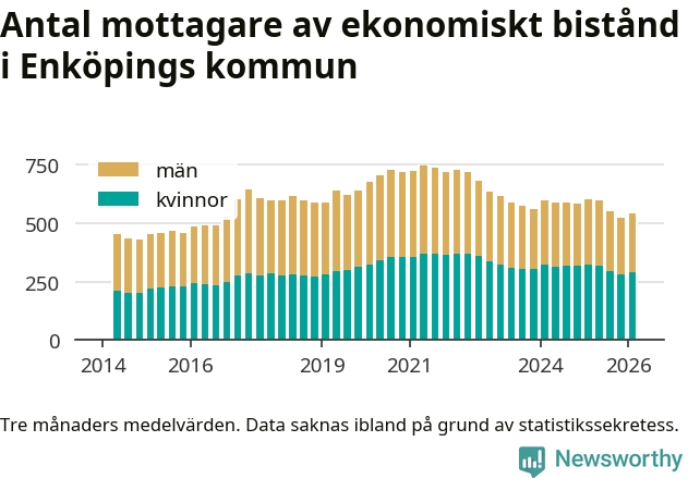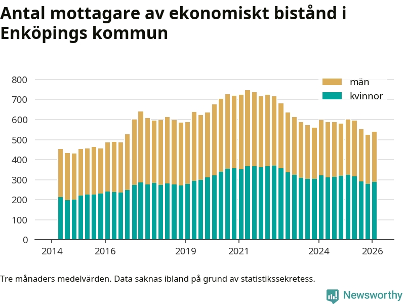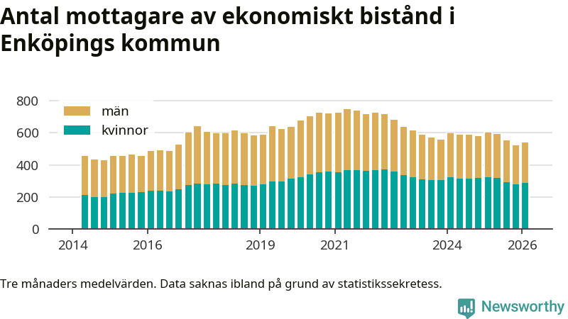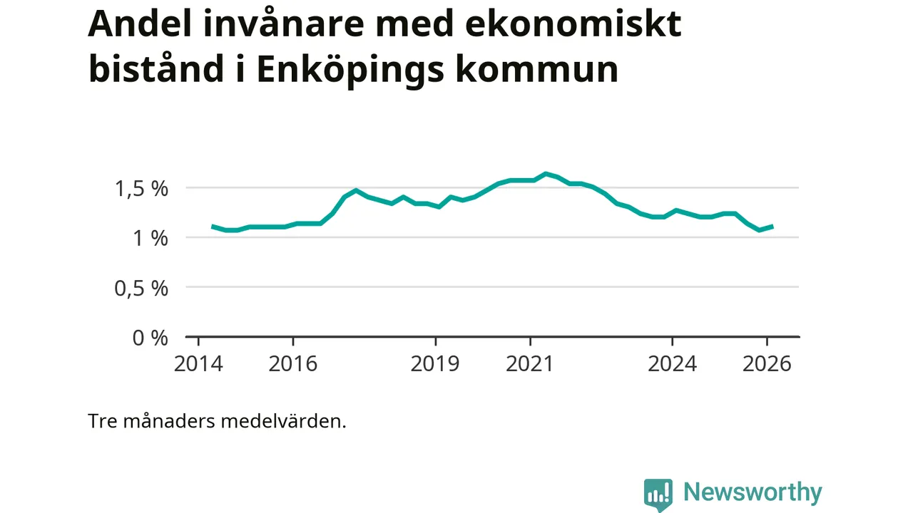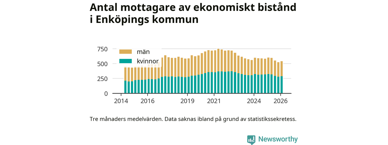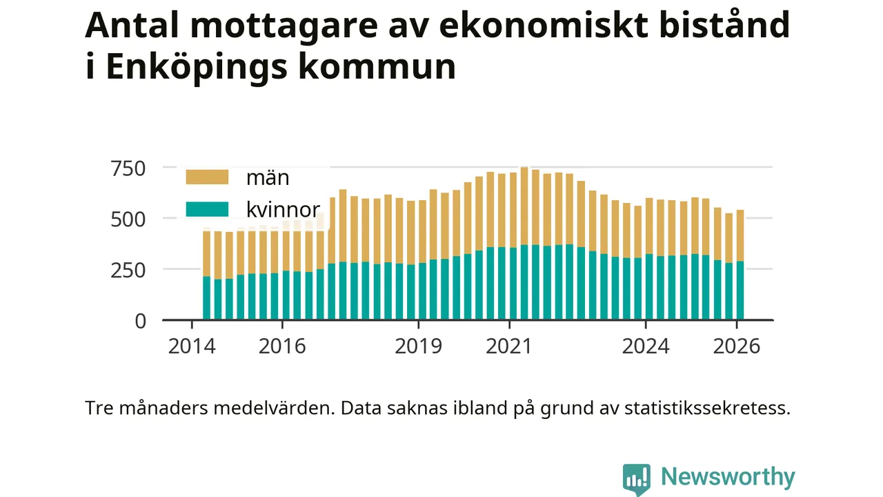 I genomsnitt 539 personer per månad fick ekonomiskt bistånd i Enköpings kommun
