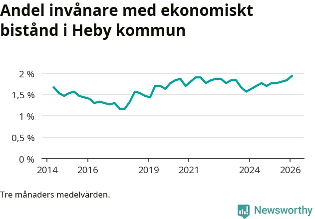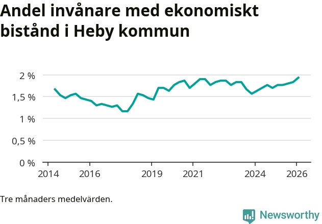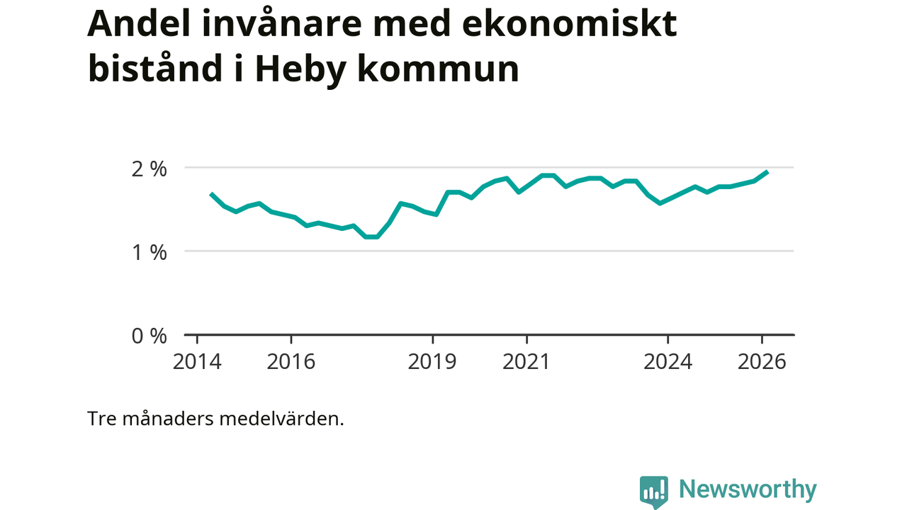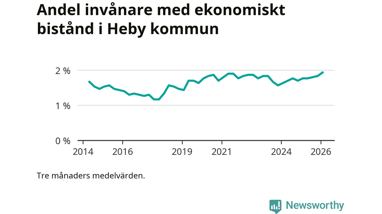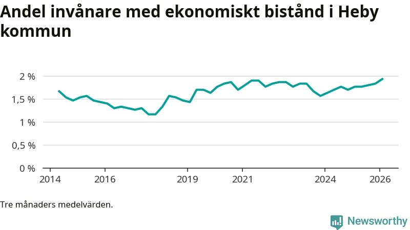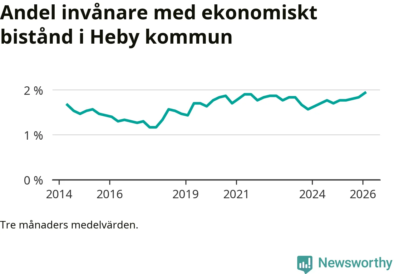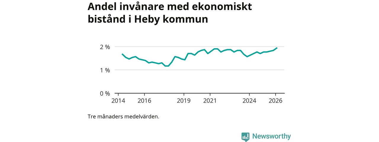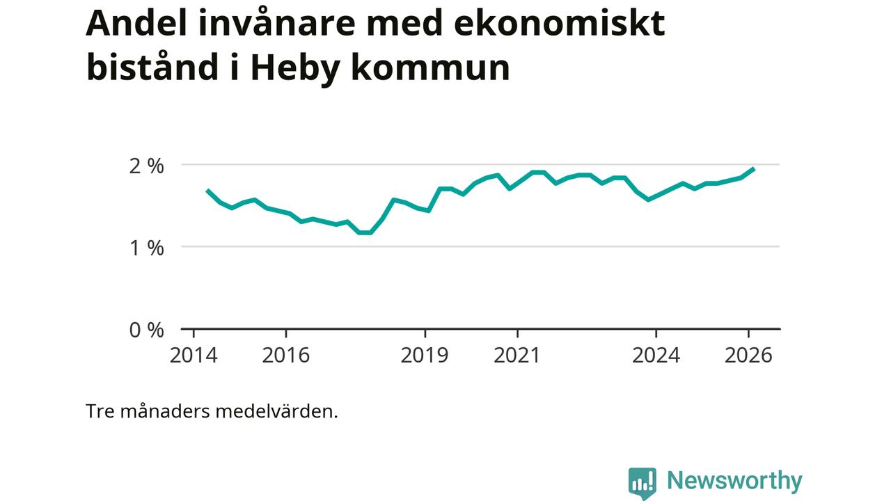 Andelen invånare med ekonomiskt bistånd i Heby kommun var under vintern den högsta sedan åtminstone 2014. Det visar den senaste, preliminära statistiken från Socialstyrelsen.