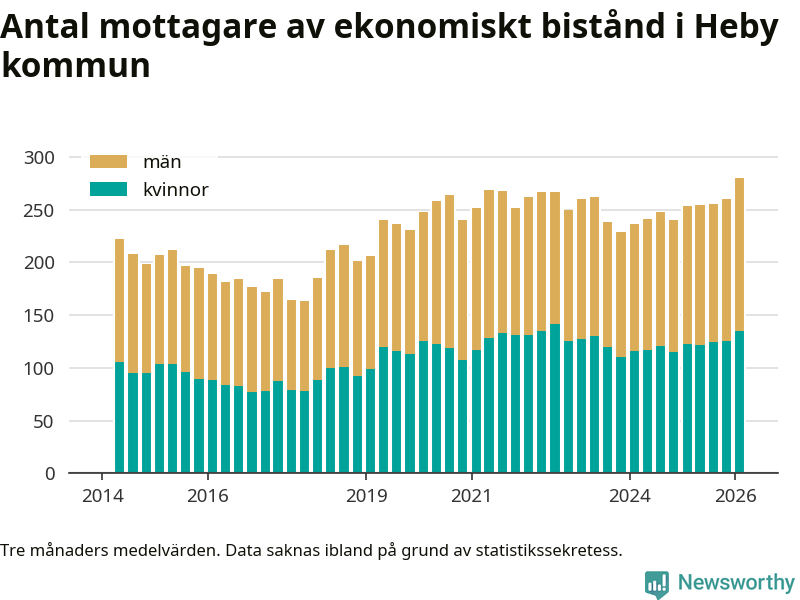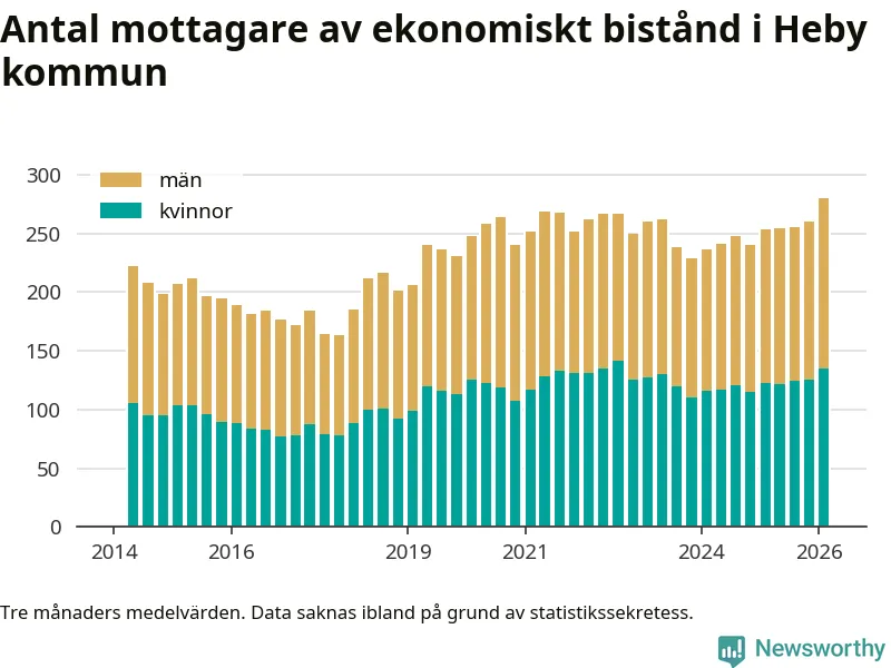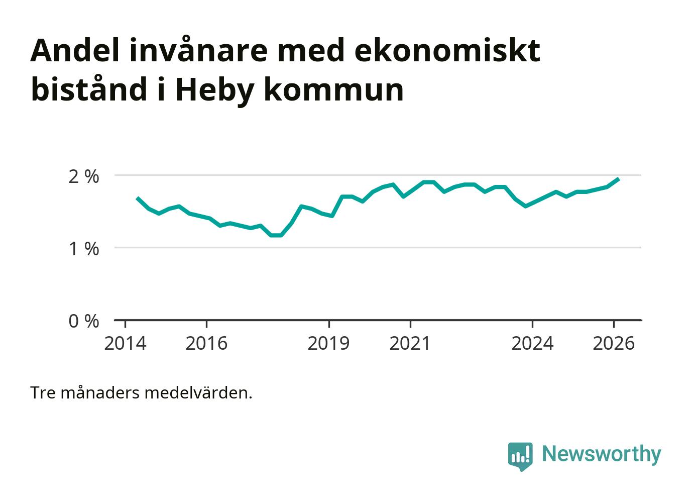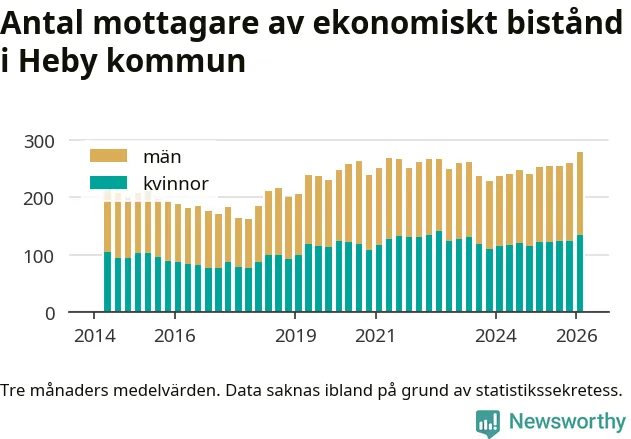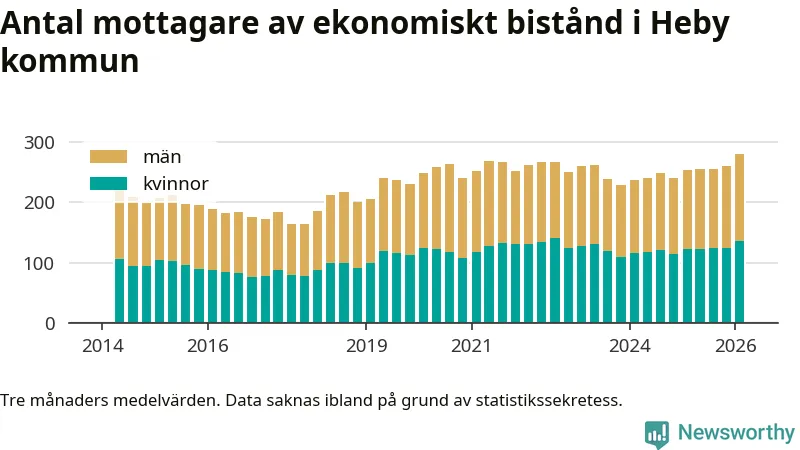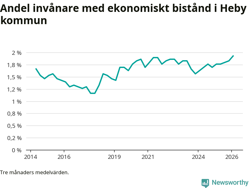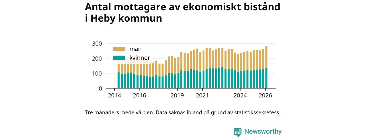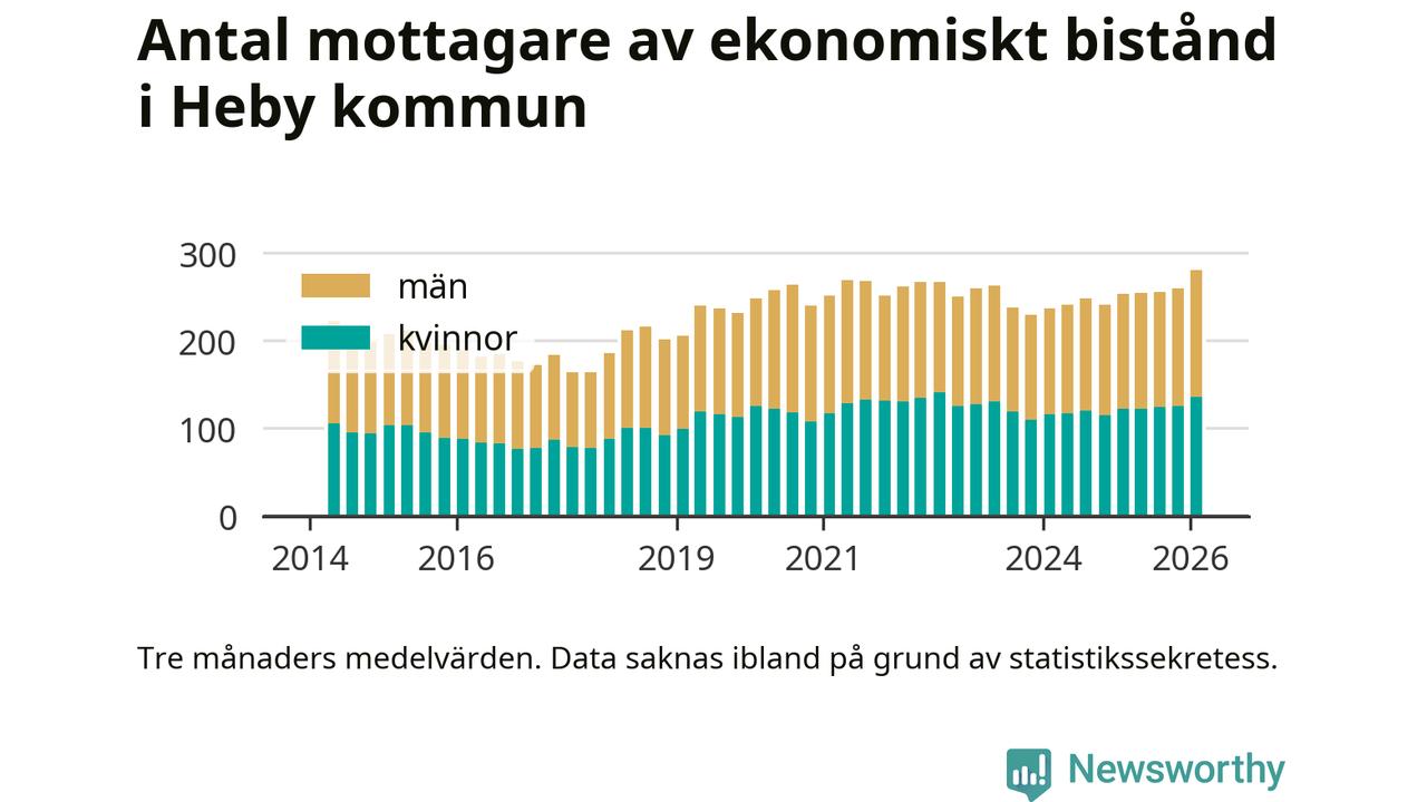 Andelen invånare med ekonomiskt bistånd i Heby kommun var under vintern den högsta sedan åtminstone 2014. Det visar den senaste, preliminära statistiken från Socialstyrelsen.