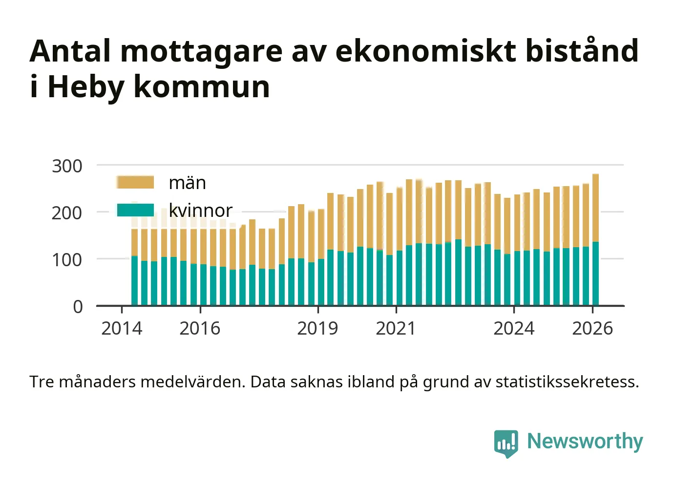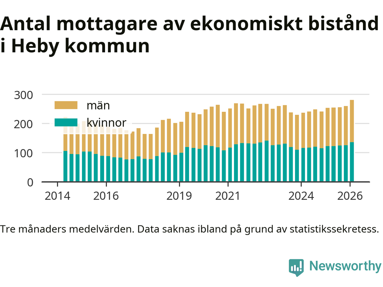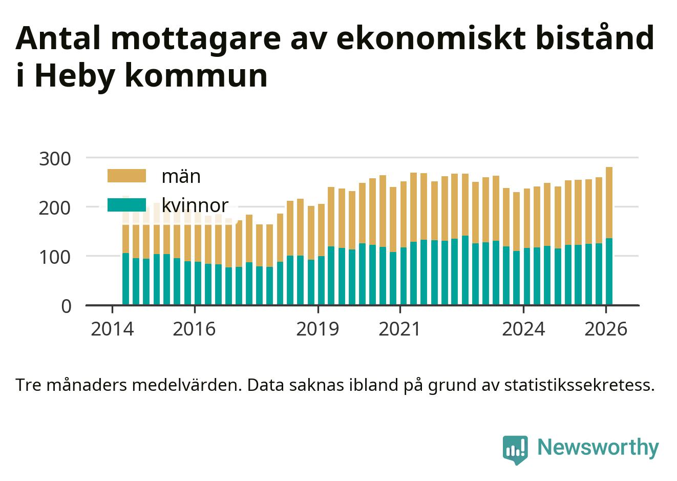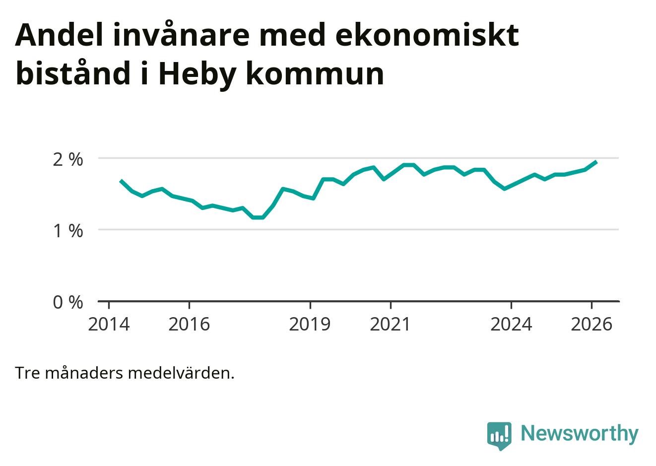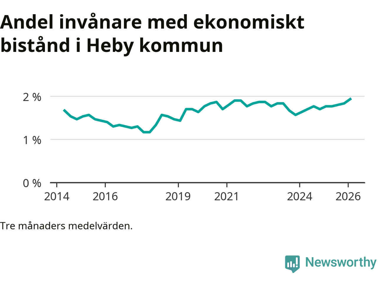 Andelen invånare med ekonomiskt bistånd i Heby kommun var under vintern den högsta sedan åtminstone 2014. Det visar den senaste, preliminära statistiken från Socialstyrelsen.