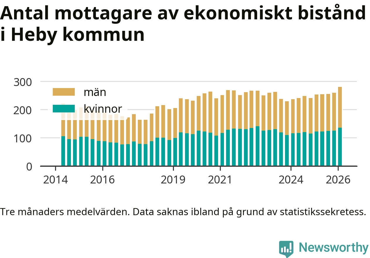 I genomsnitt 280 personer per månad fick ekonomiskt bistånd i Heby kommun under vintermånaderna (december till februari), vilket motsvarar 1,9 procent av den vuxna befolkningen. Det är marginellt mer än i höstas, och något större andel än under vintern för ett år sedan.