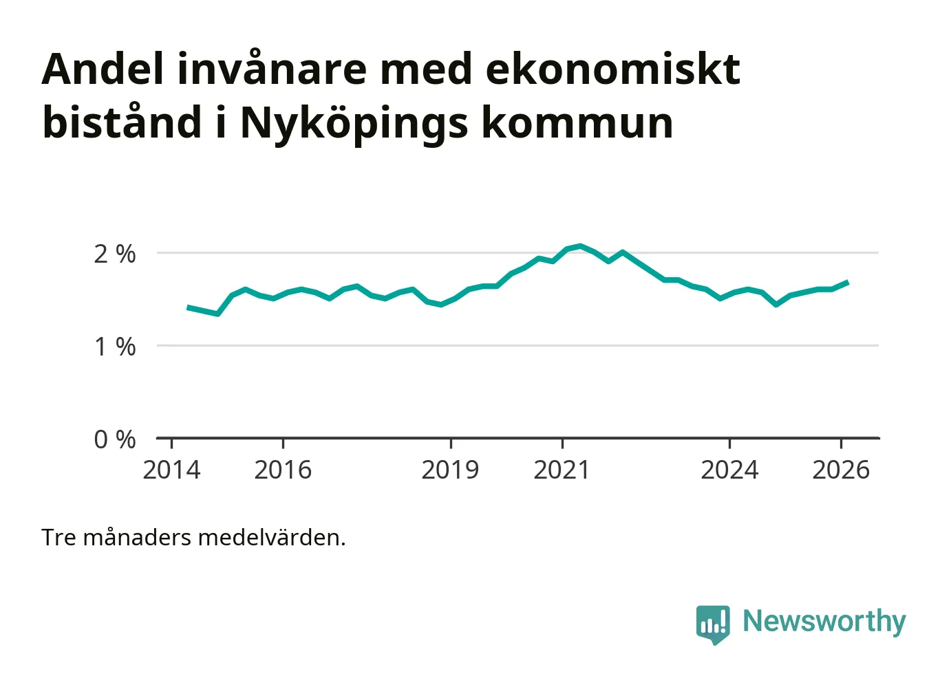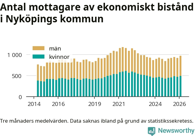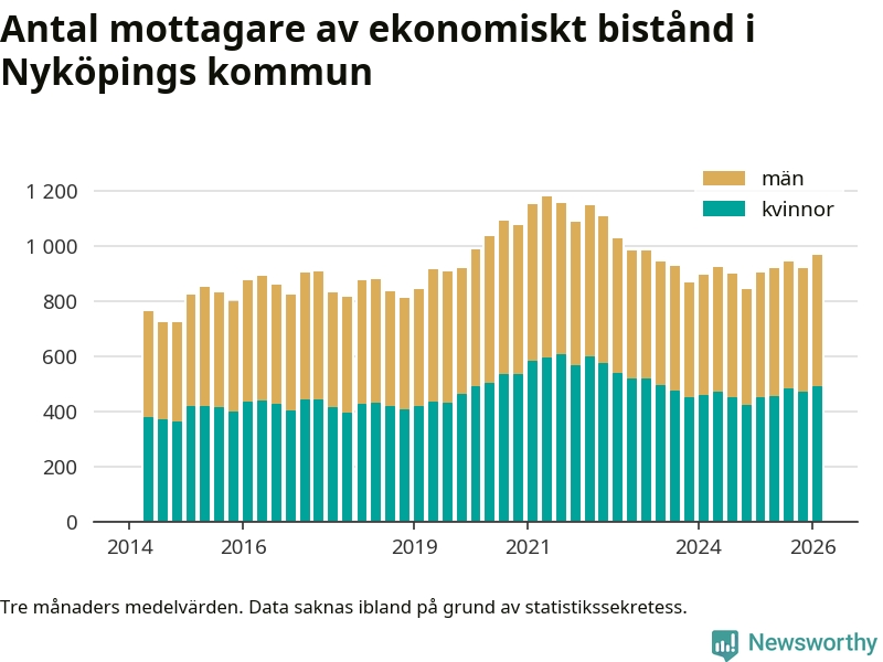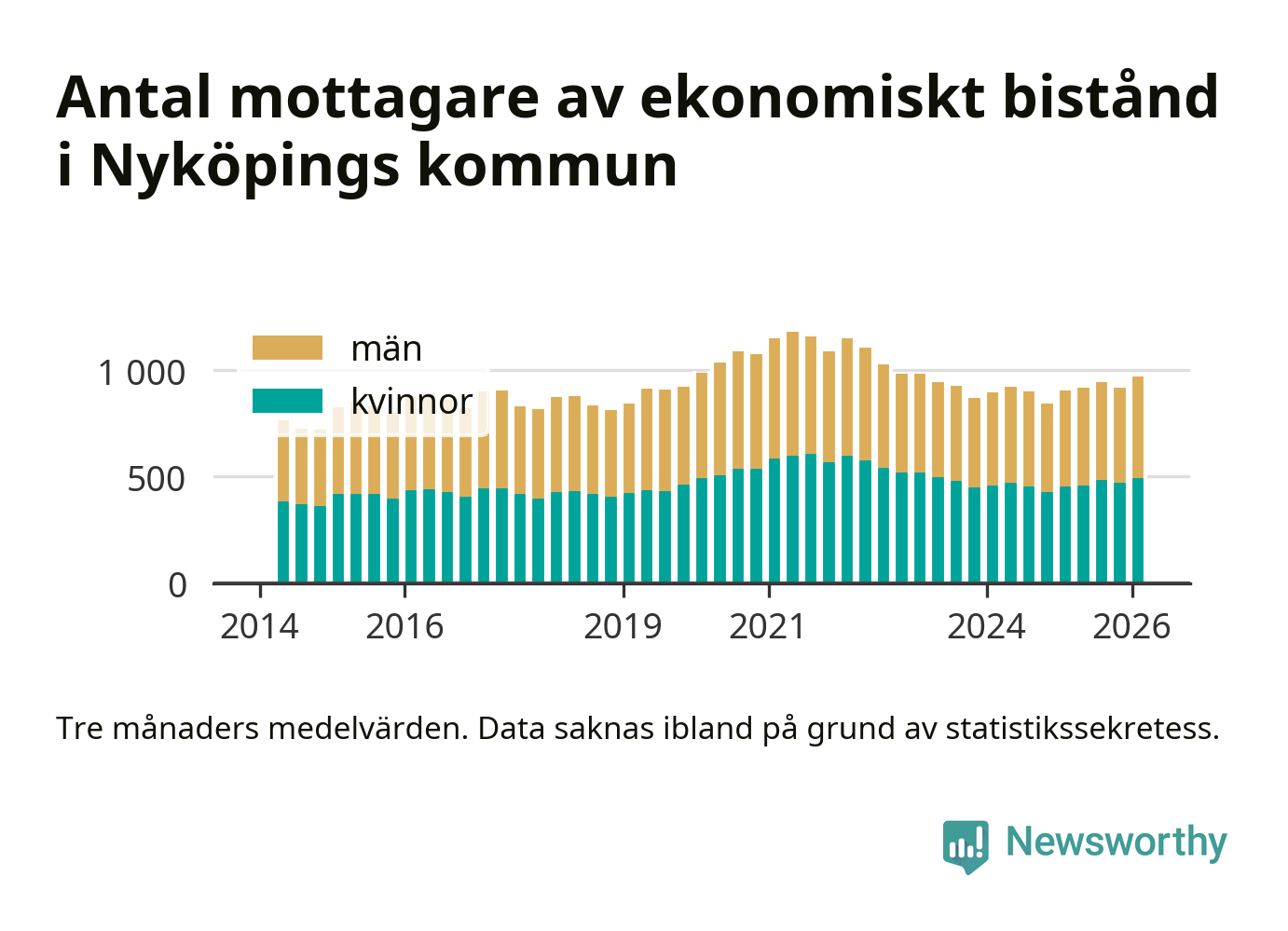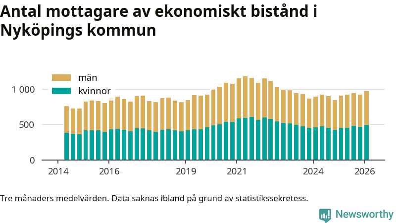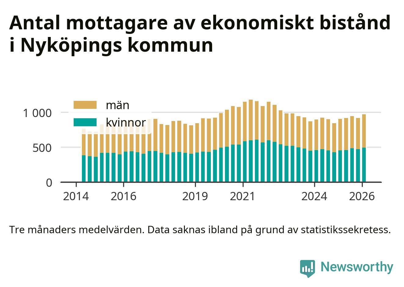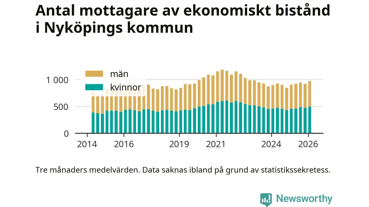 I genomsnitt 969 personer per månad fick ekonomiskt bistånd i Nyköpings kommun