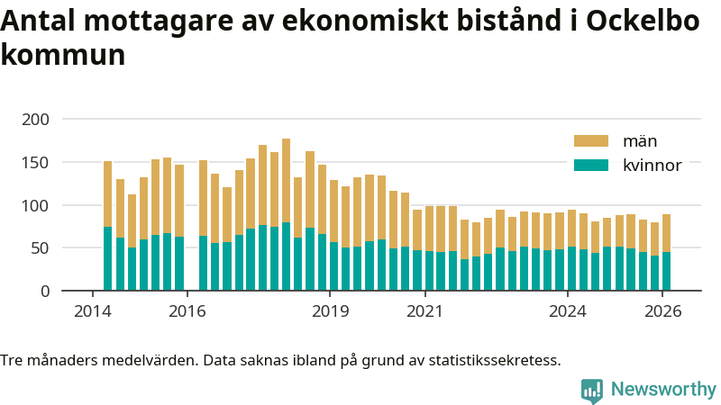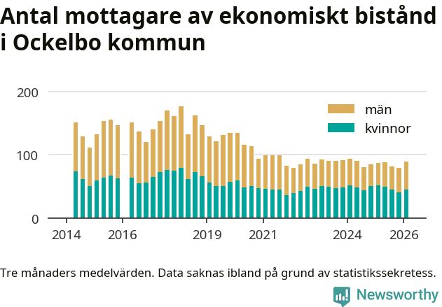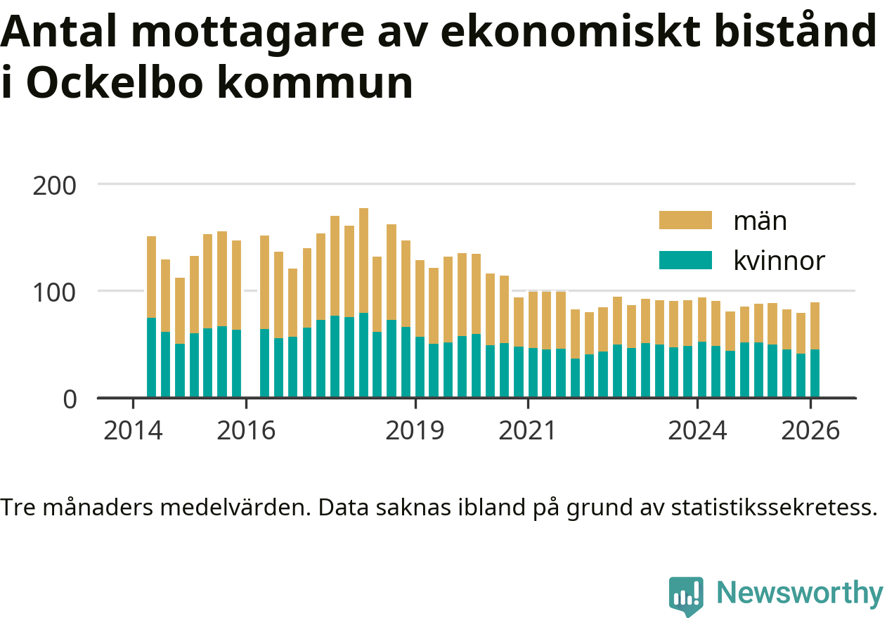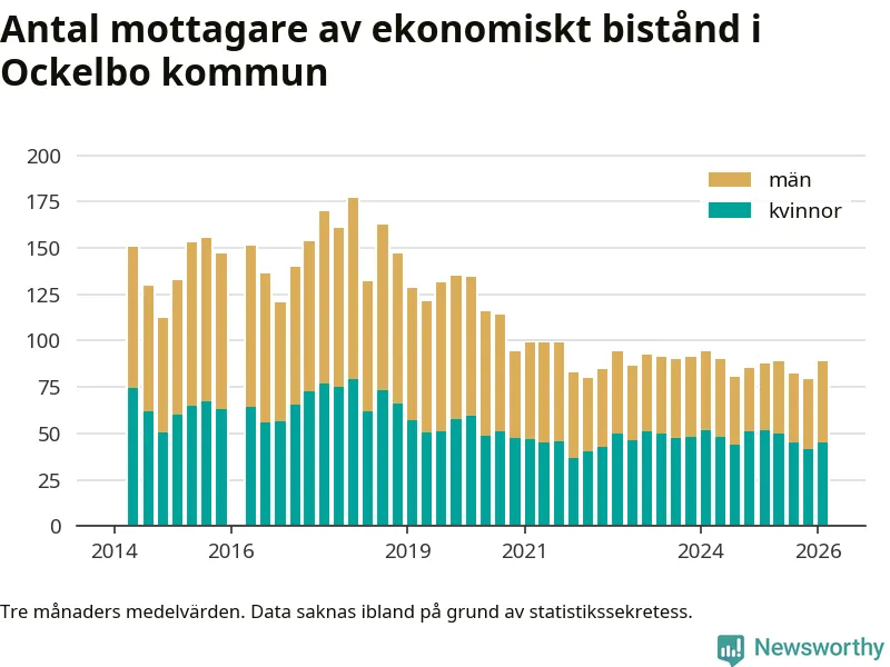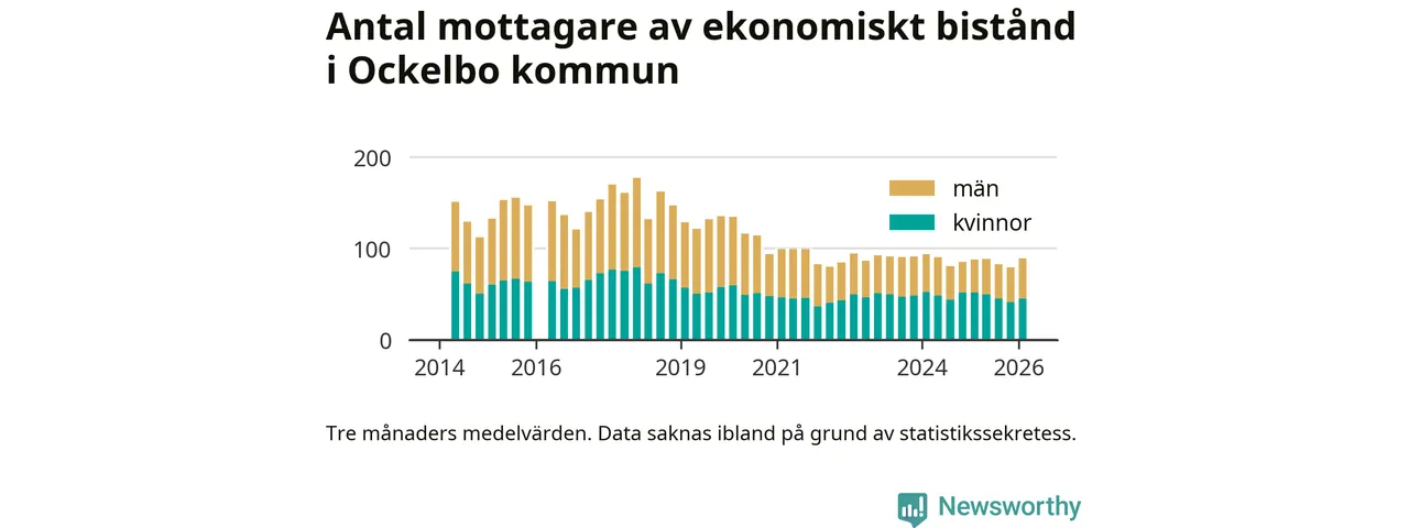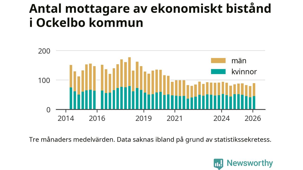 Andelen invånare med ekonomiskt bistånd i Ockelbo kommun var högre under vintern än under tremånadersperioden innan. Det visar den senaste, preliminära statistiken från Socialstyrelsen.