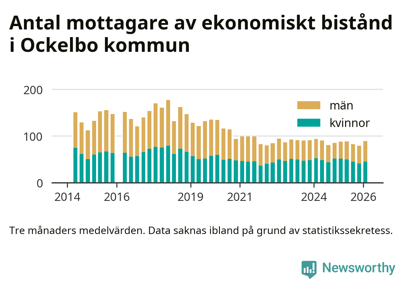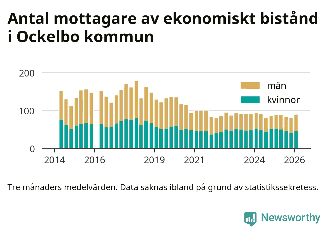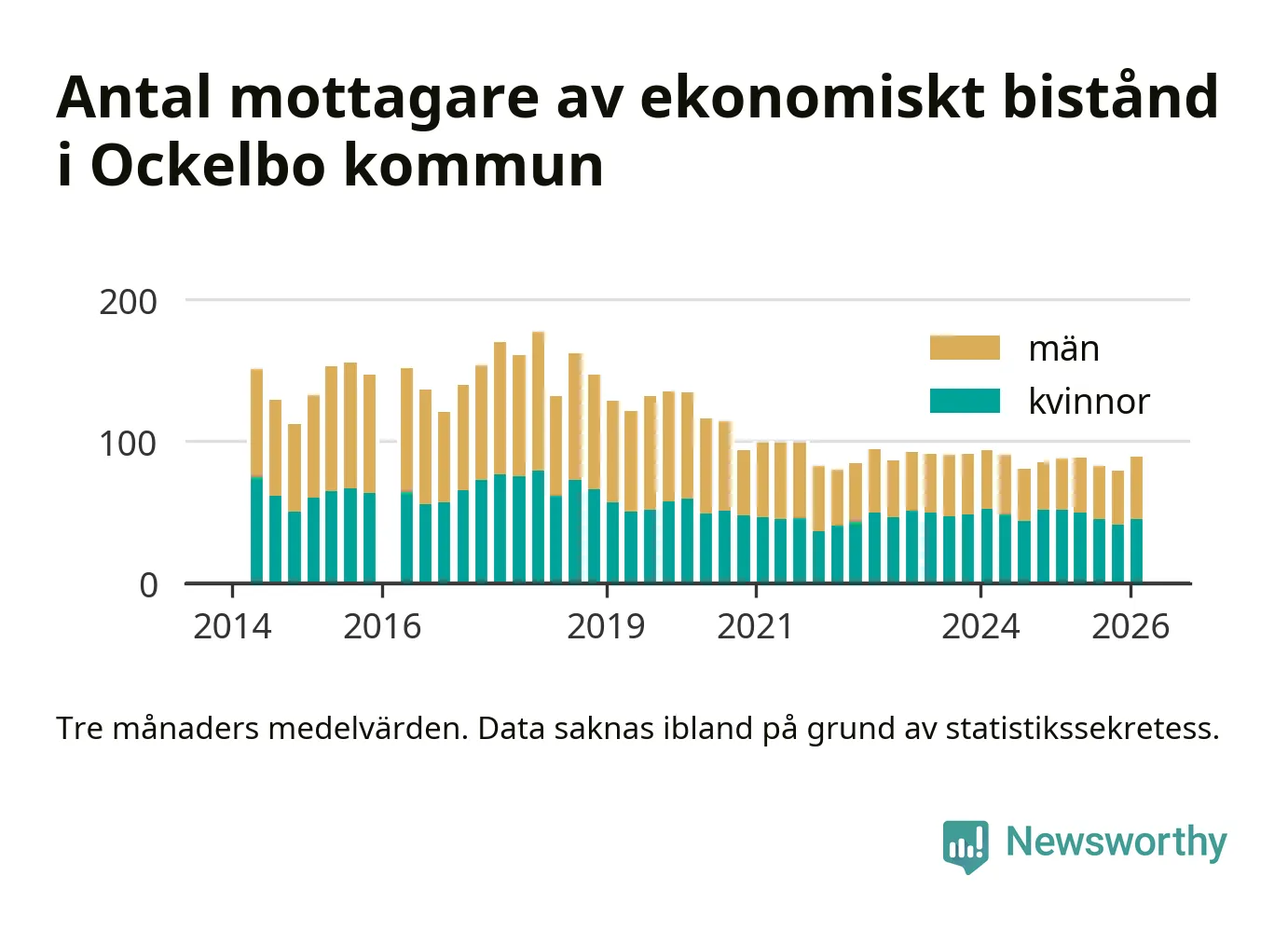 Andelen invånare med ekonomiskt bistånd i Ockelbo kommun var högre under vintern än under tremånadersperioden innan. Det visar den senaste, preliminära statistiken från Socialstyrelsen.