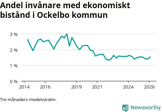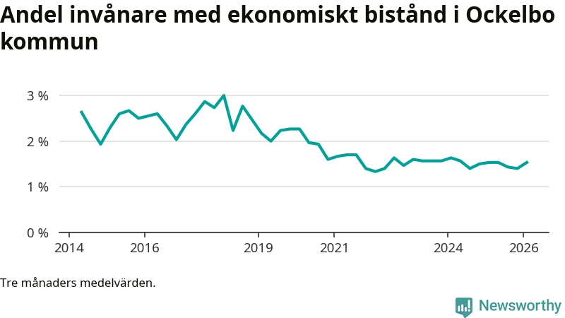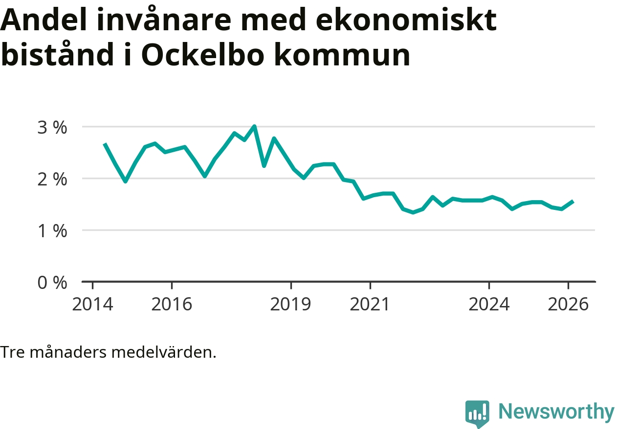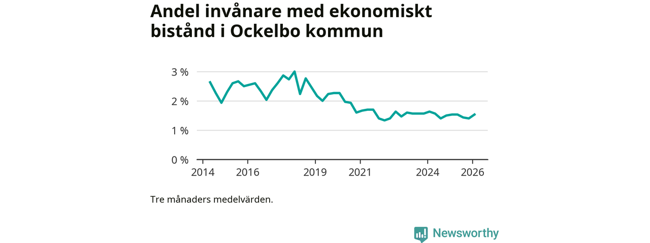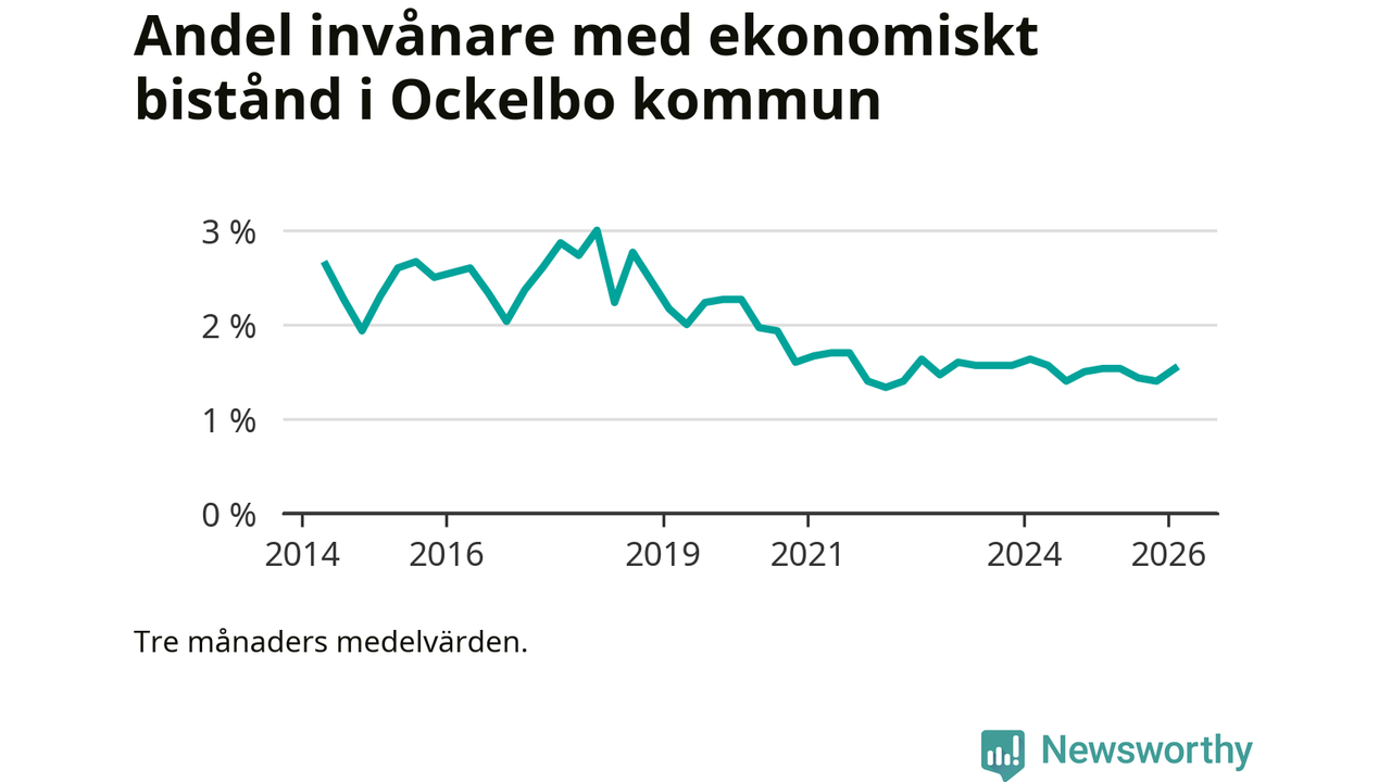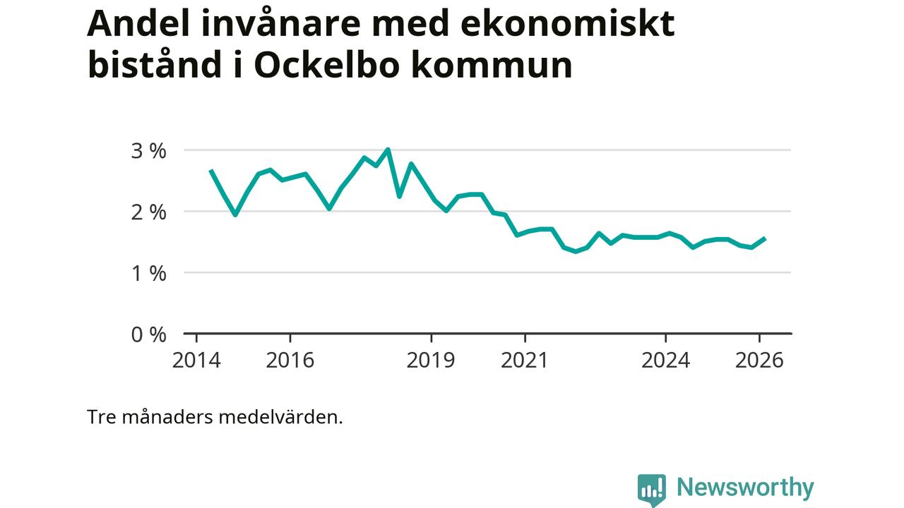 I genomsnitt 89 personer per månad fick ekonomiskt bistånd i Ockelbo kommun under vintermånaderna (december till februari), vilket motsvarar 1,5 procent av den vuxna befolkningen. Det är en ökning med 0,1 procentenheter eller tio personer jämfört med i höstas, och en lika stor andel som under vintern för ett år sedan.