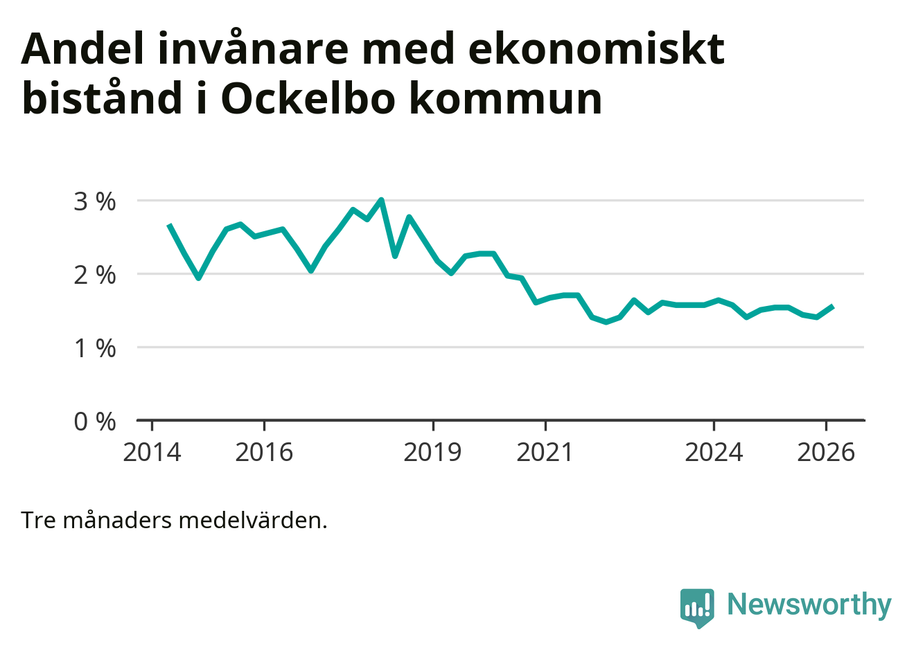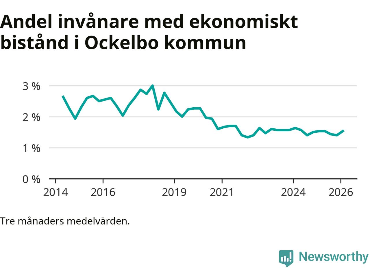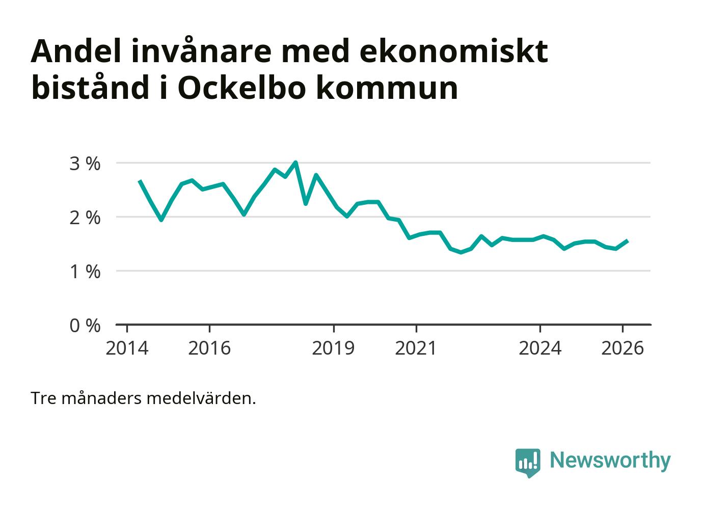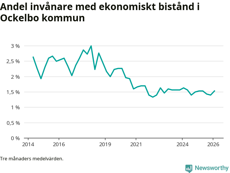 I genomsnitt 89 personer per månad fick ekonomiskt bistånd i Ockelbo kommun under vintermånaderna (december till februari), vilket motsvarar 1,5 procent av den vuxna befolkningen. Det är en ökning med 0,1 procentenheter eller tio personer jämfört med i höstas, och en lika stor andel som under vintern för ett år sedan.