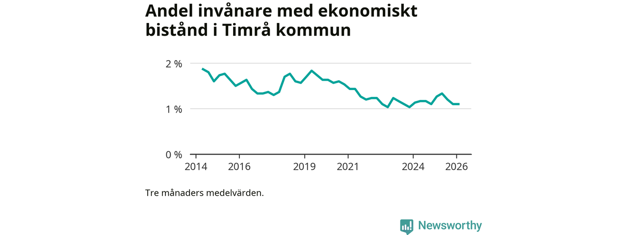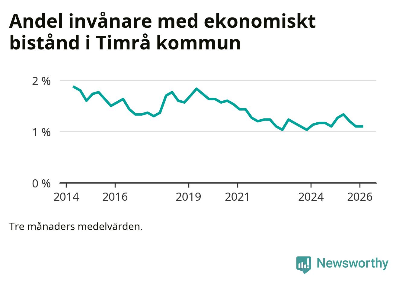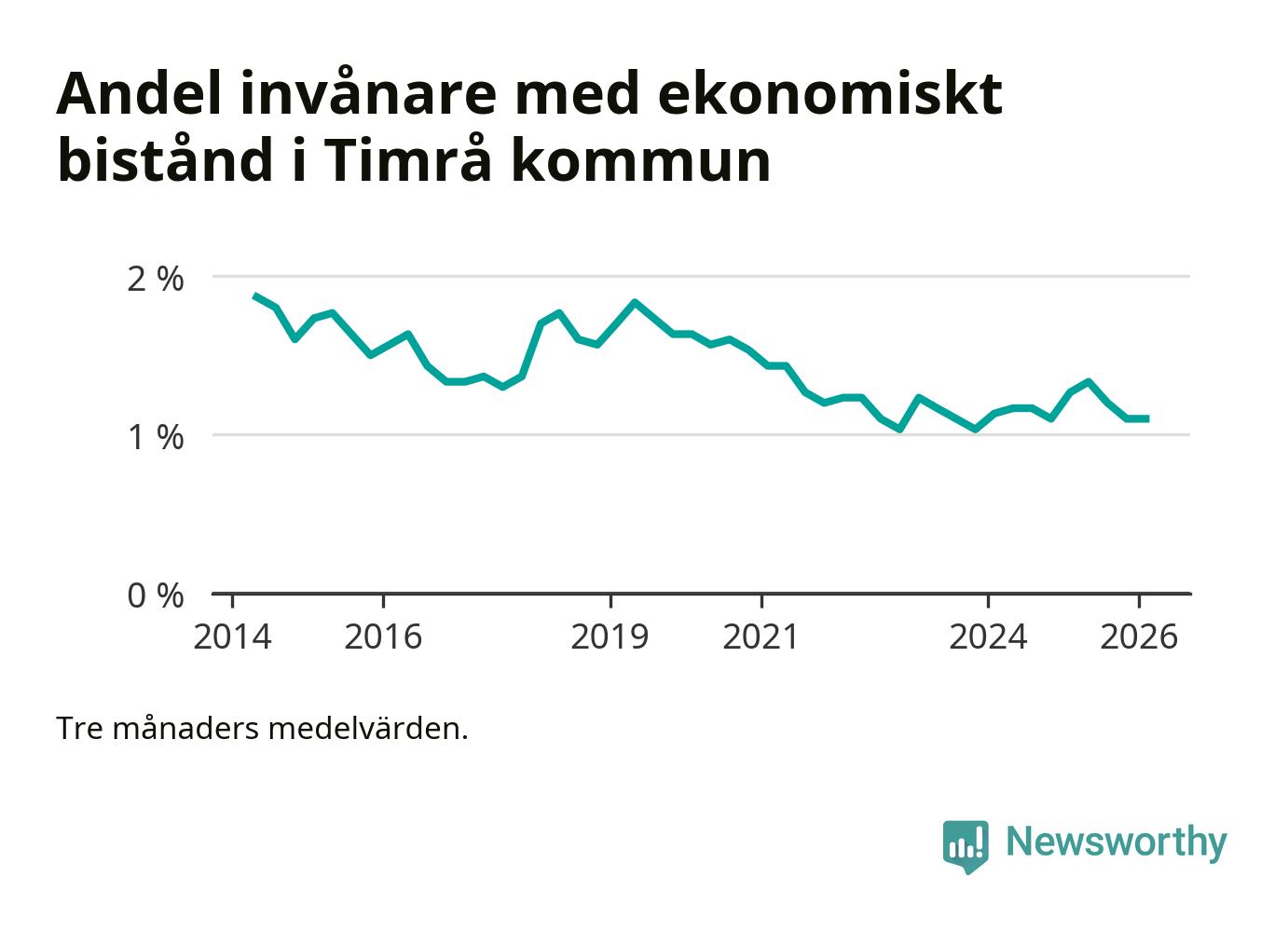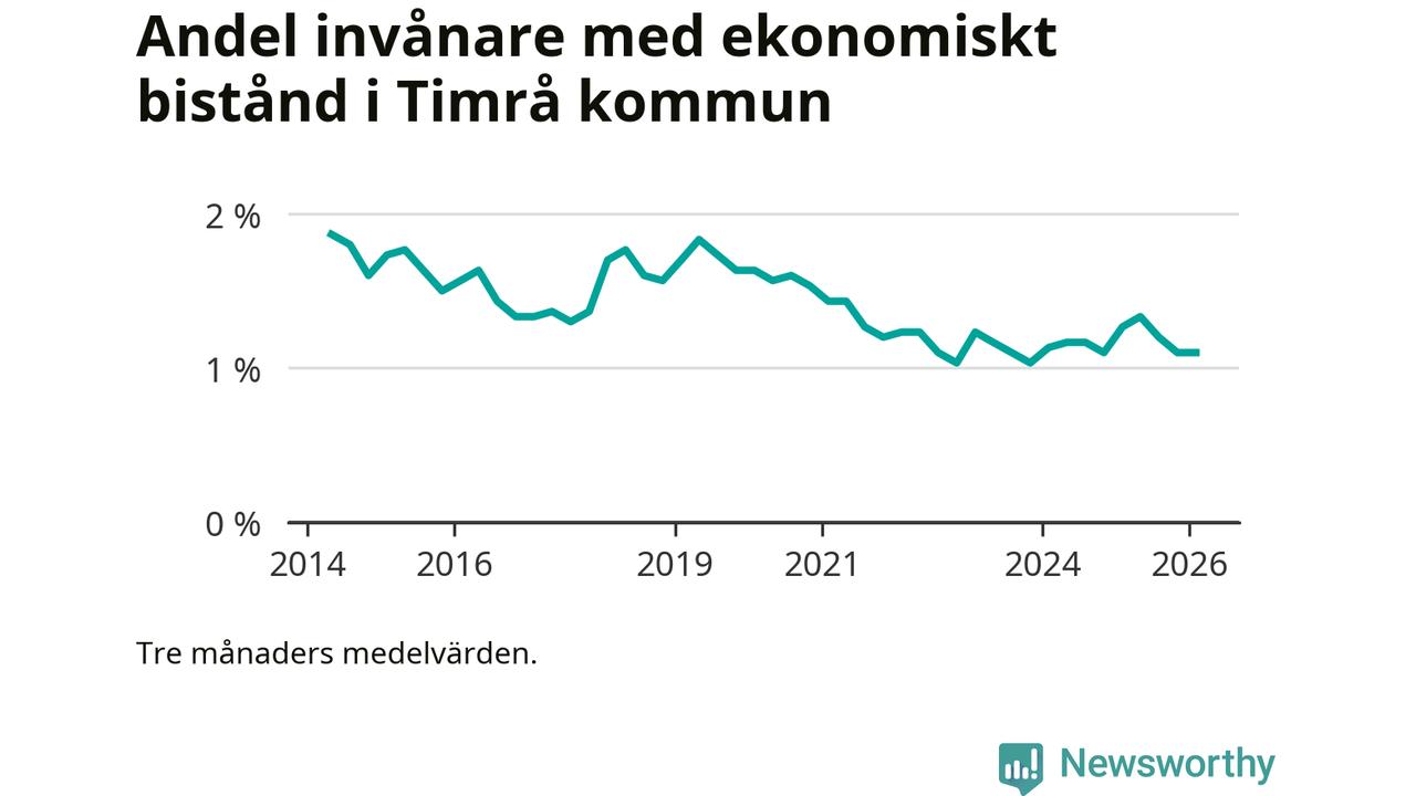 I genomsnitt 190 personer per månad fick ekonomiskt bistånd i Timrå kommun under vintermånaderna (december till februari), vilket motsvarar 1,1 procent av den vuxna befolkningen. Det är lika stor andel som i höstas, och något mindre andel än under vintern för ett år sedan.