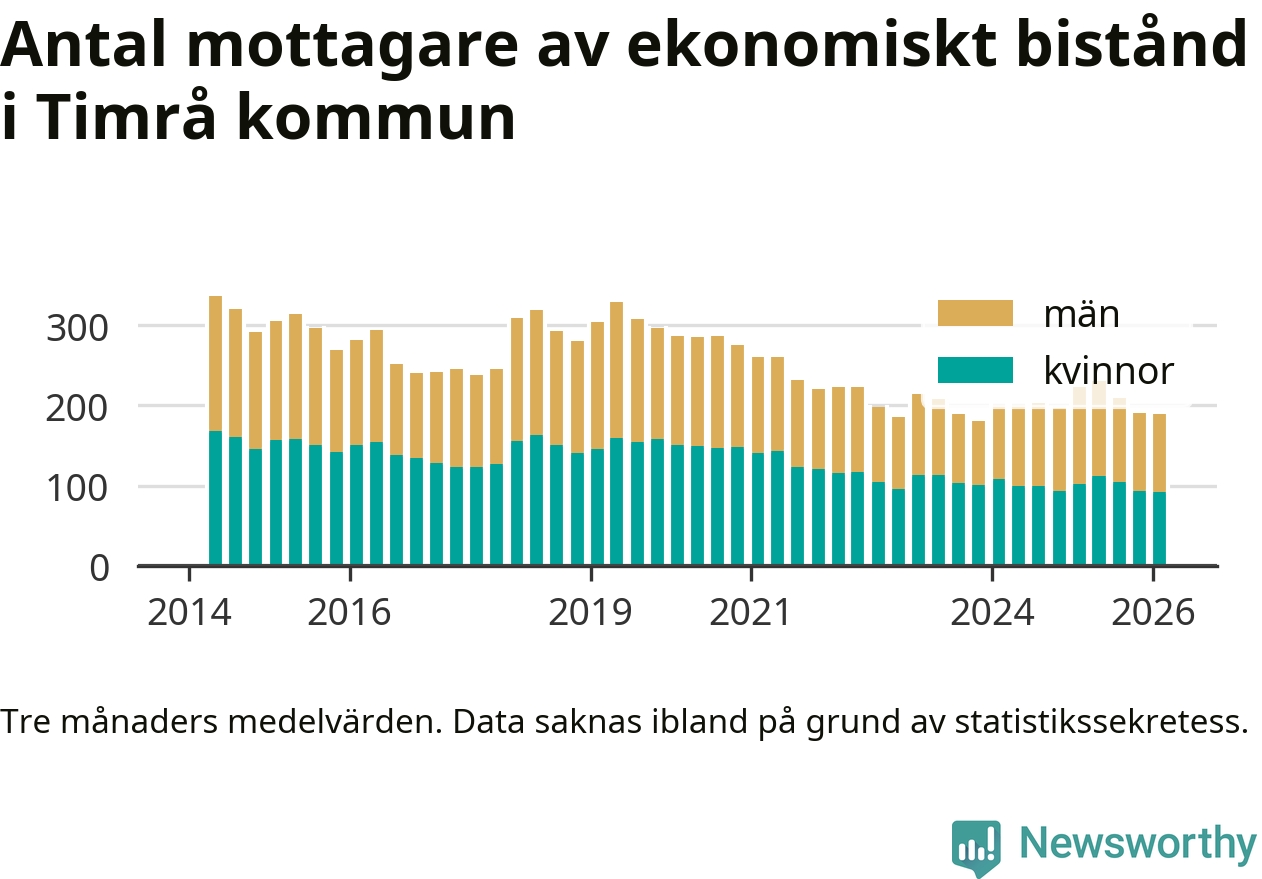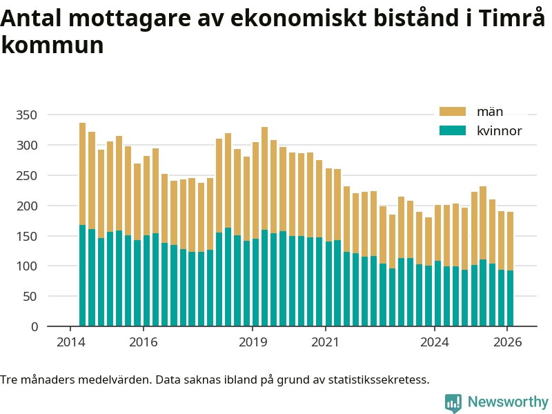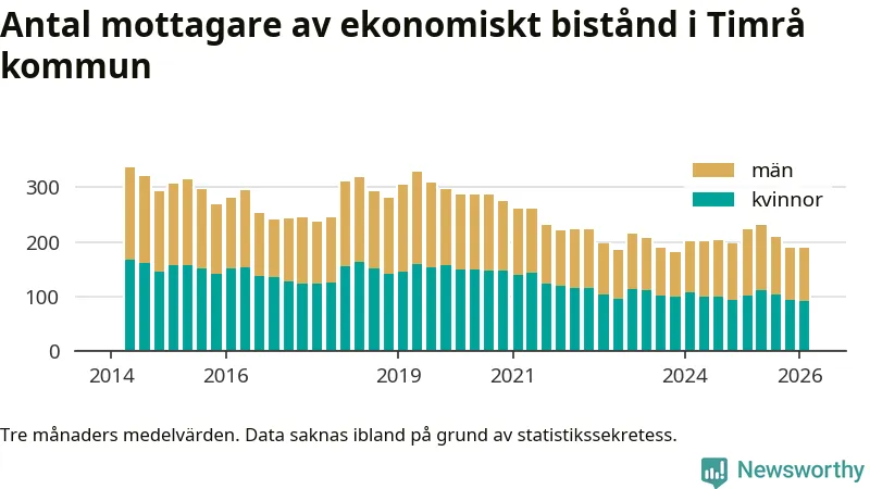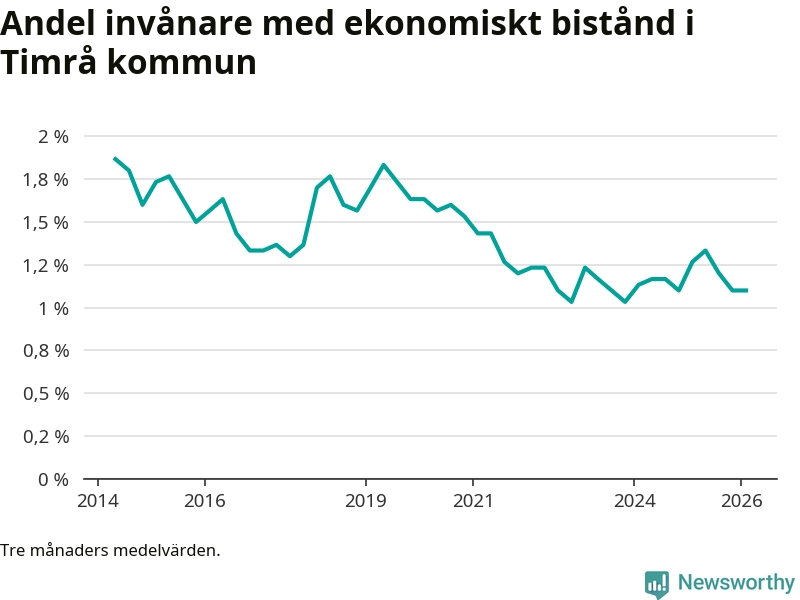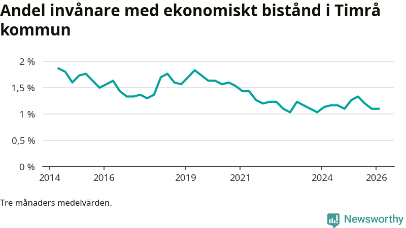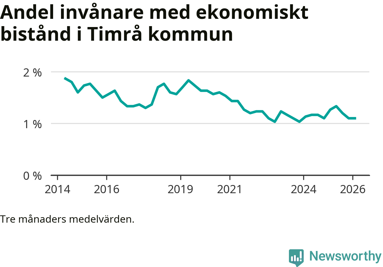 I genomsnitt 190 personer per månad fick ekonomiskt bistånd i Timrå kommun under vintermånaderna (december till februari), vilket motsvarar 1,1 procent av den vuxna befolkningen. Det är lika stor andel som i höstas, och något mindre andel än under vintern för ett år sedan.
