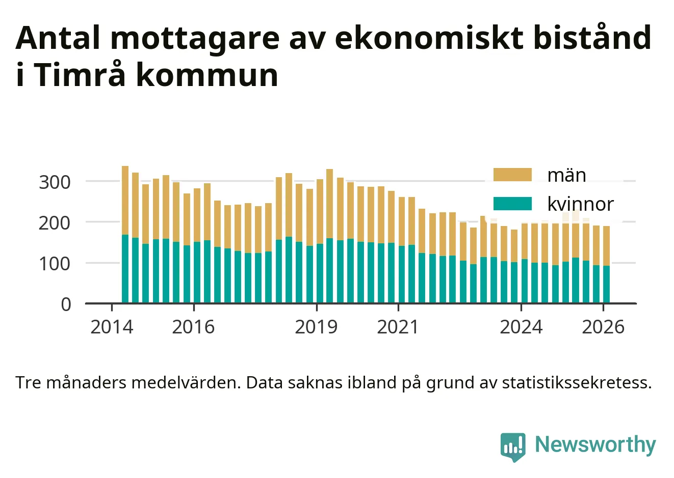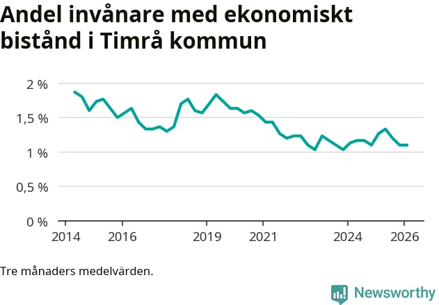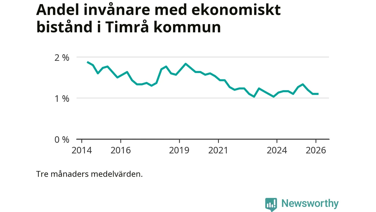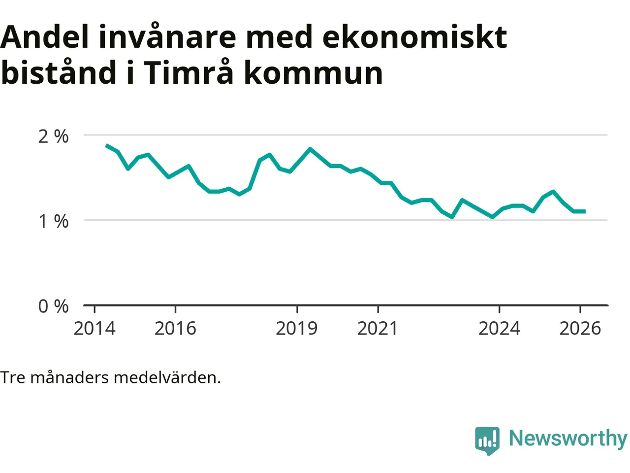 Andelen invånare med ekonomiskt bistånd i Timrå kommun var lägre under vintern jämfört med motsvarande period året innan. Det visar den senaste, preliminära statistiken från Socialstyrelsen.