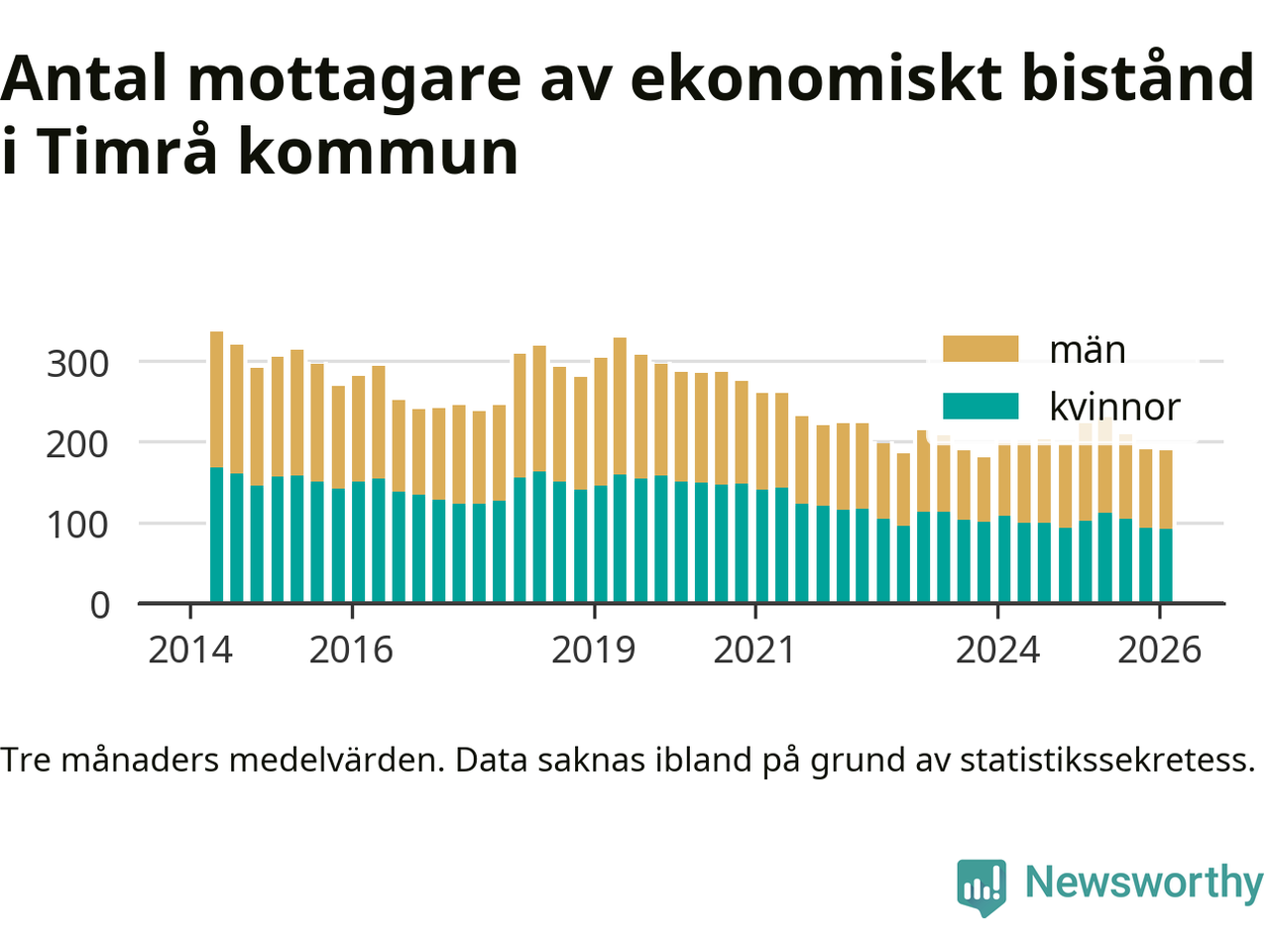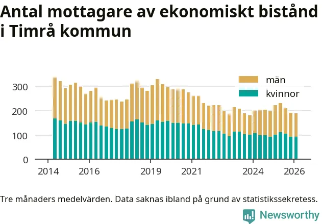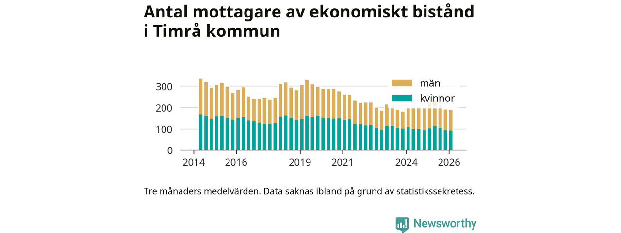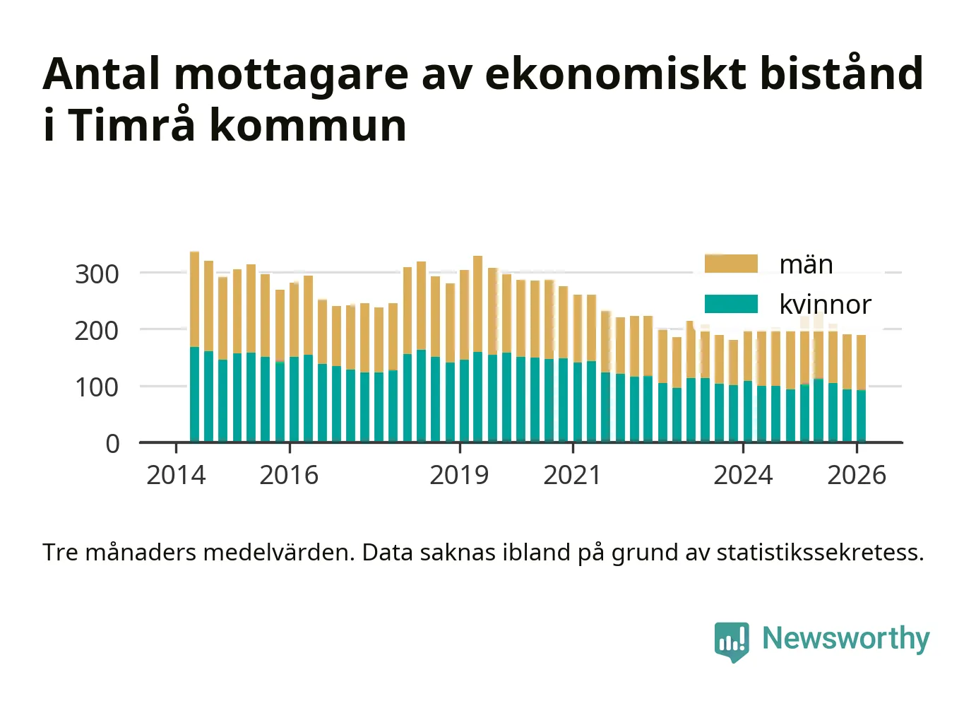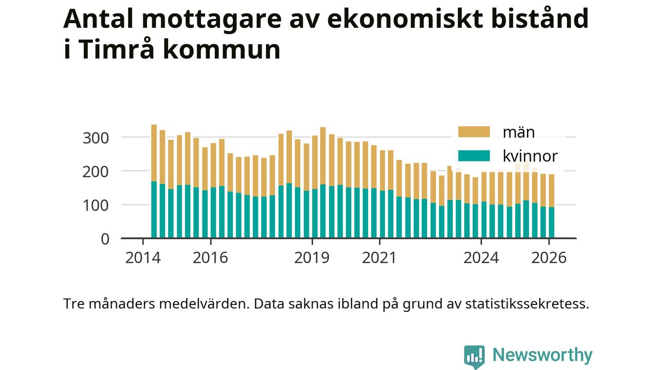 Andelen invånare med ekonomiskt bistånd i Timrå kommun var lägre under vintern jämfört med motsvarande period året innan. Det visar den senaste, preliminära statistiken från Socialstyrelsen.