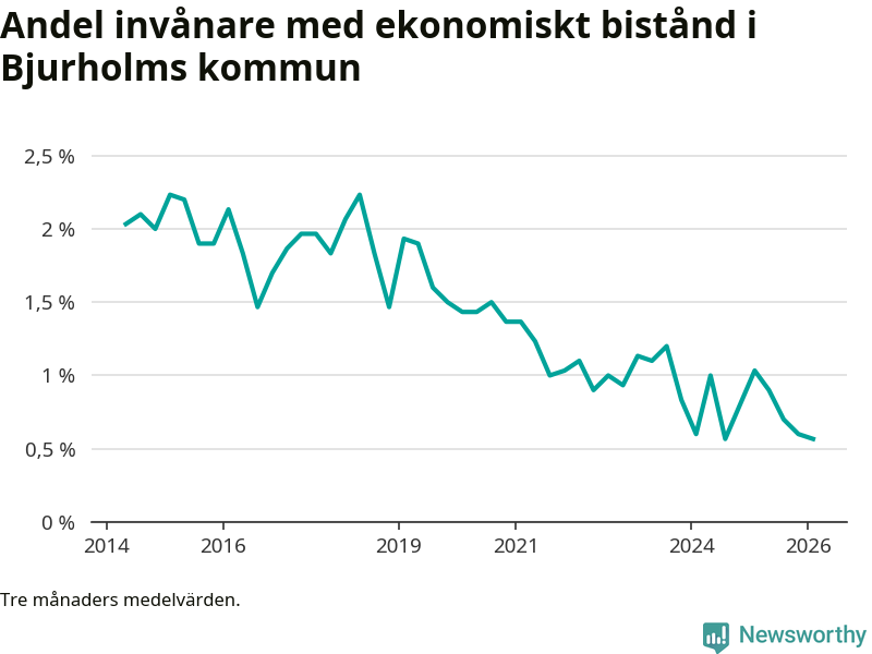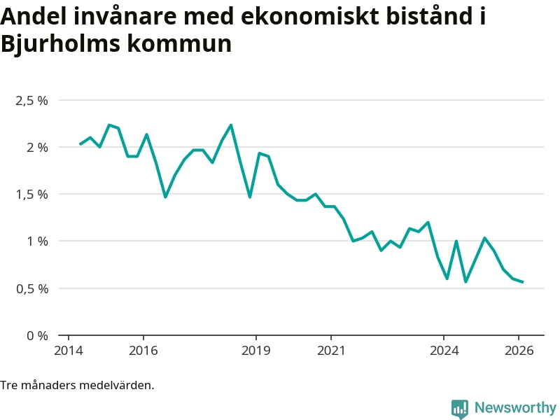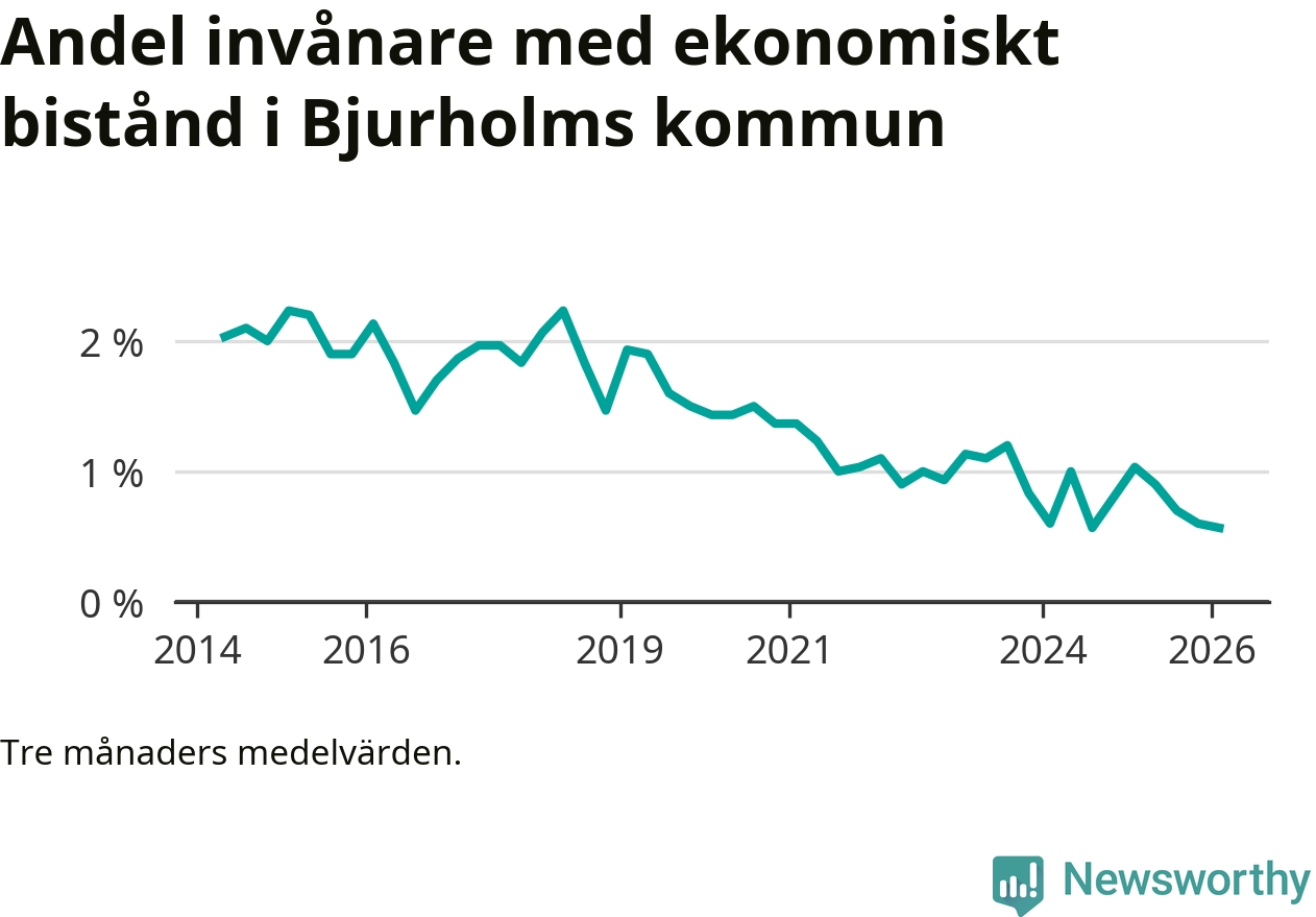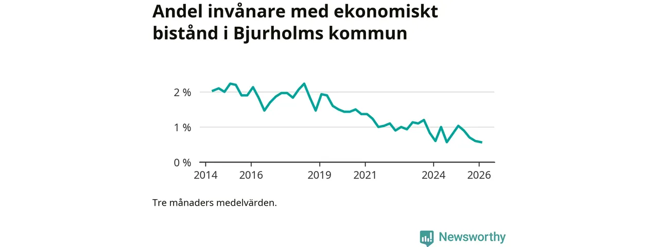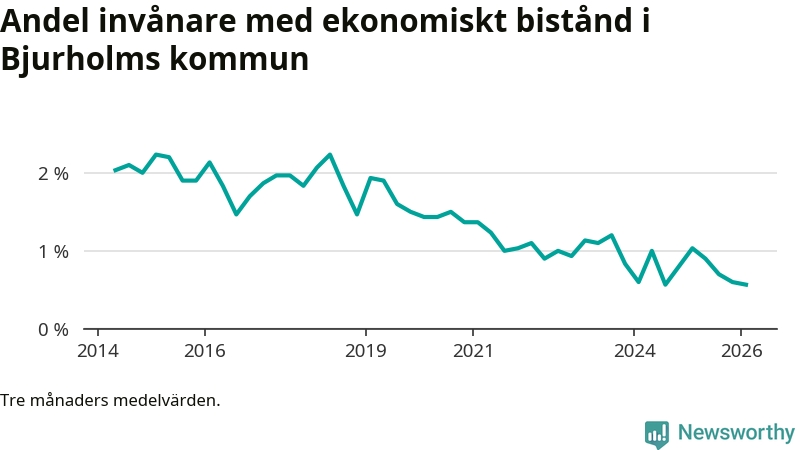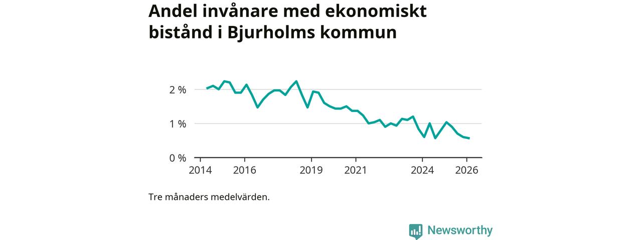 I genomsnitt 13 personer per månad fick ekonomiskt bistånd i Bjurholms kommun under vintermånaderna (december till februari), vilket motsvarar 0,6 procent av den vuxna befolkningen. Det är marginellt mindre än i höstas, och något mindre andel än under vintern för ett år sedan.
