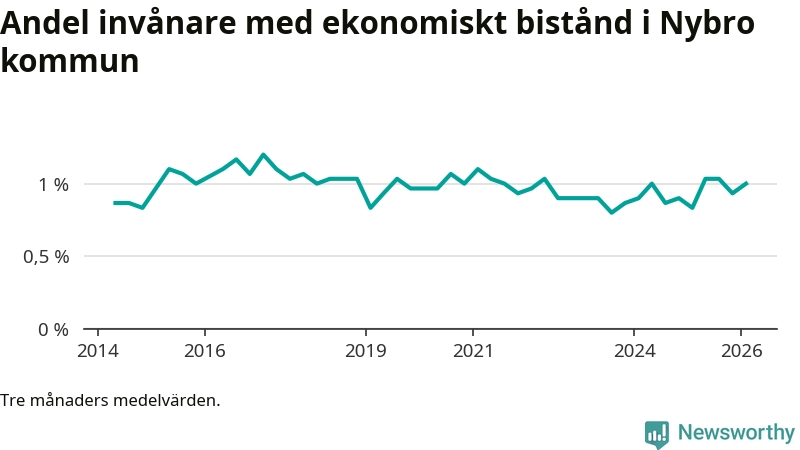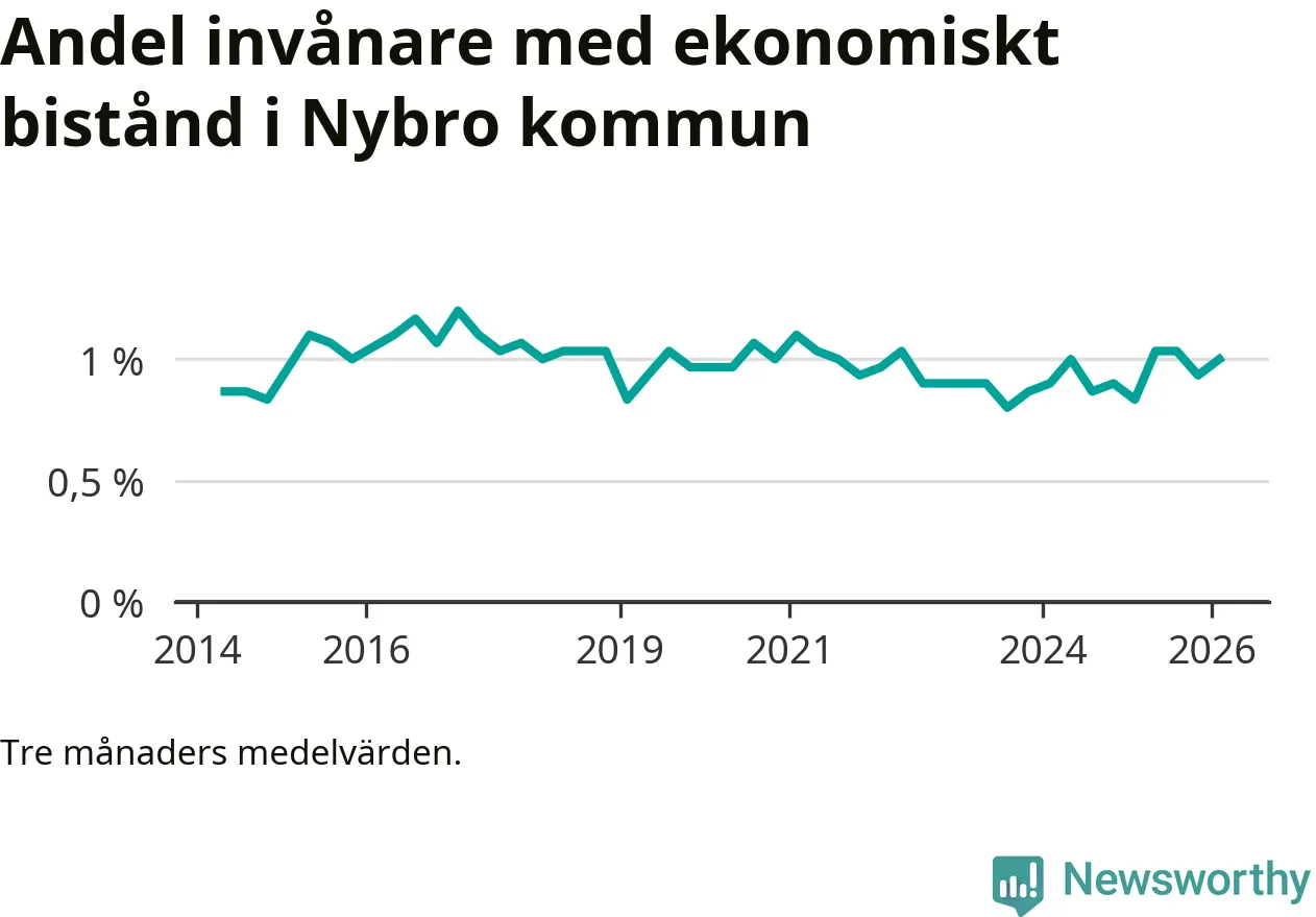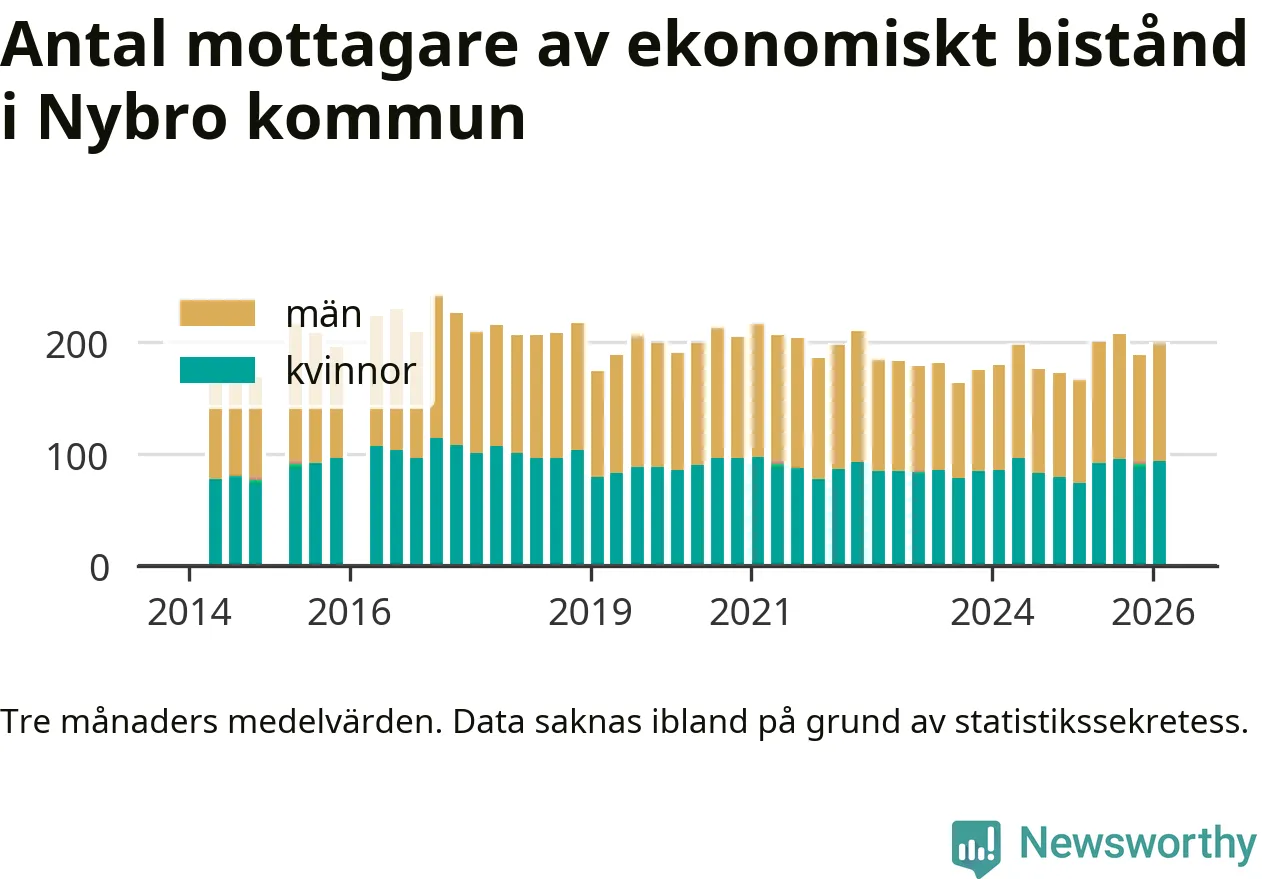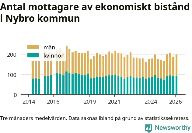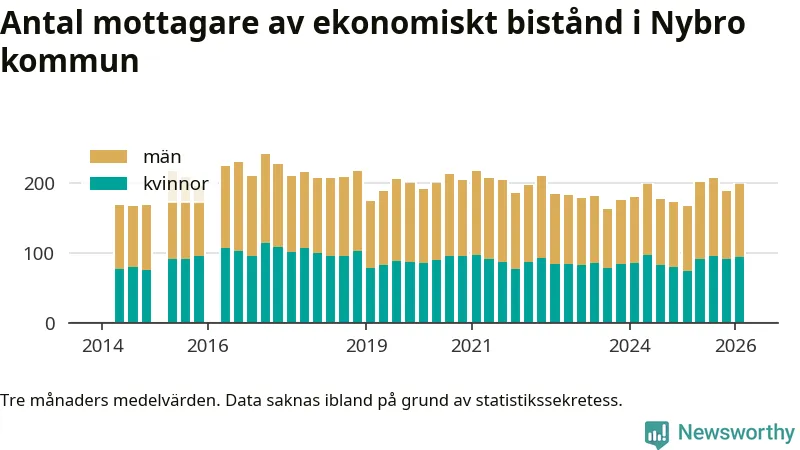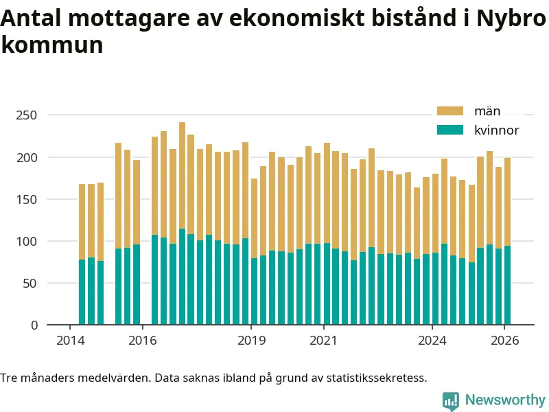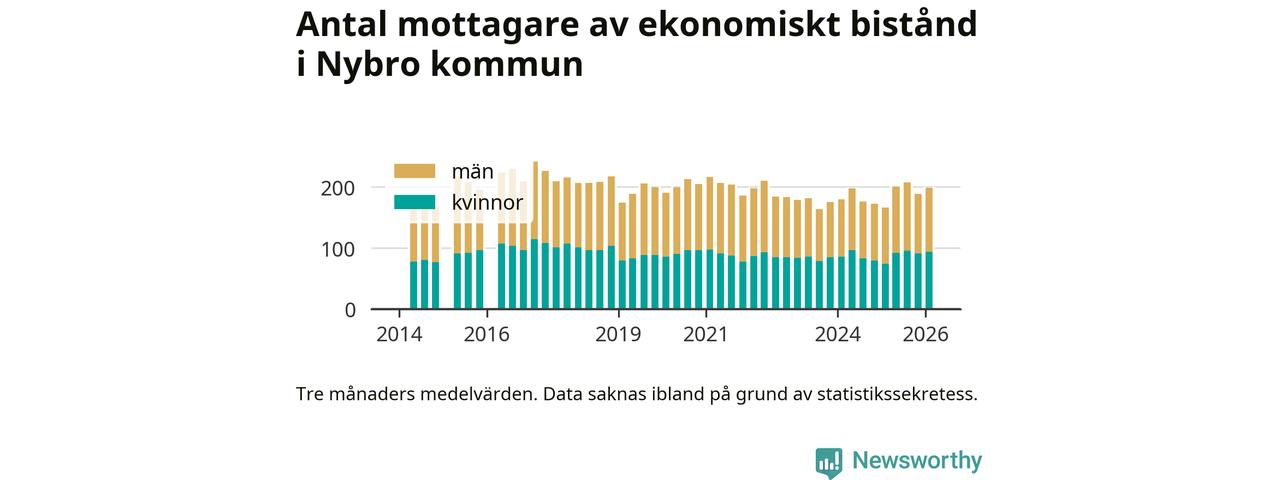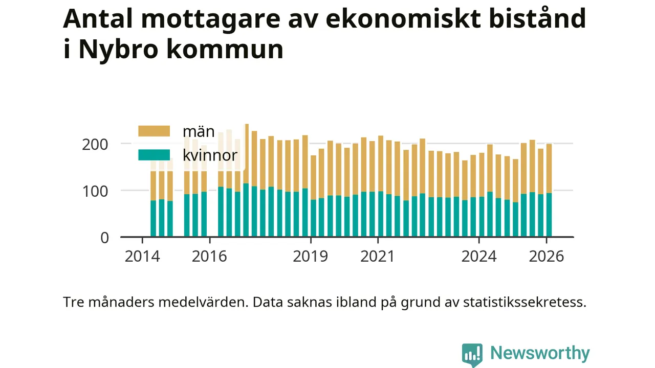 I genomsnitt 199 personer per månad fick ekonomiskt bistånd i Nybro kommun