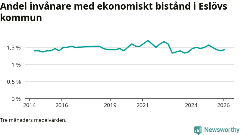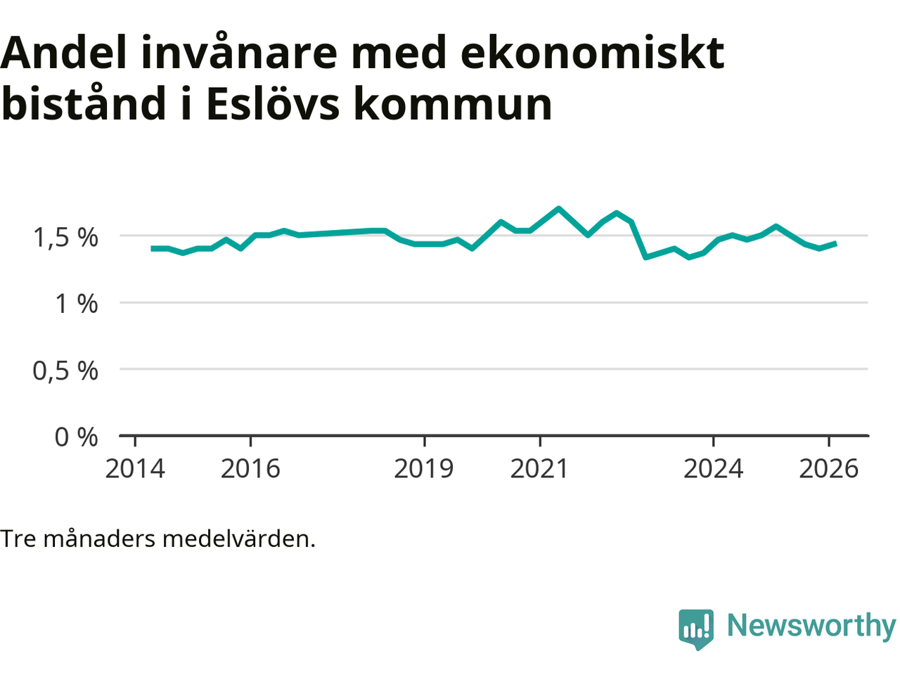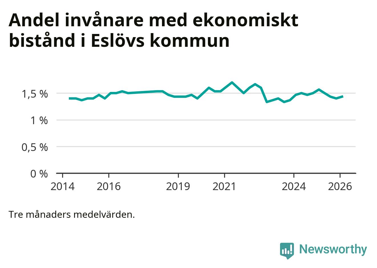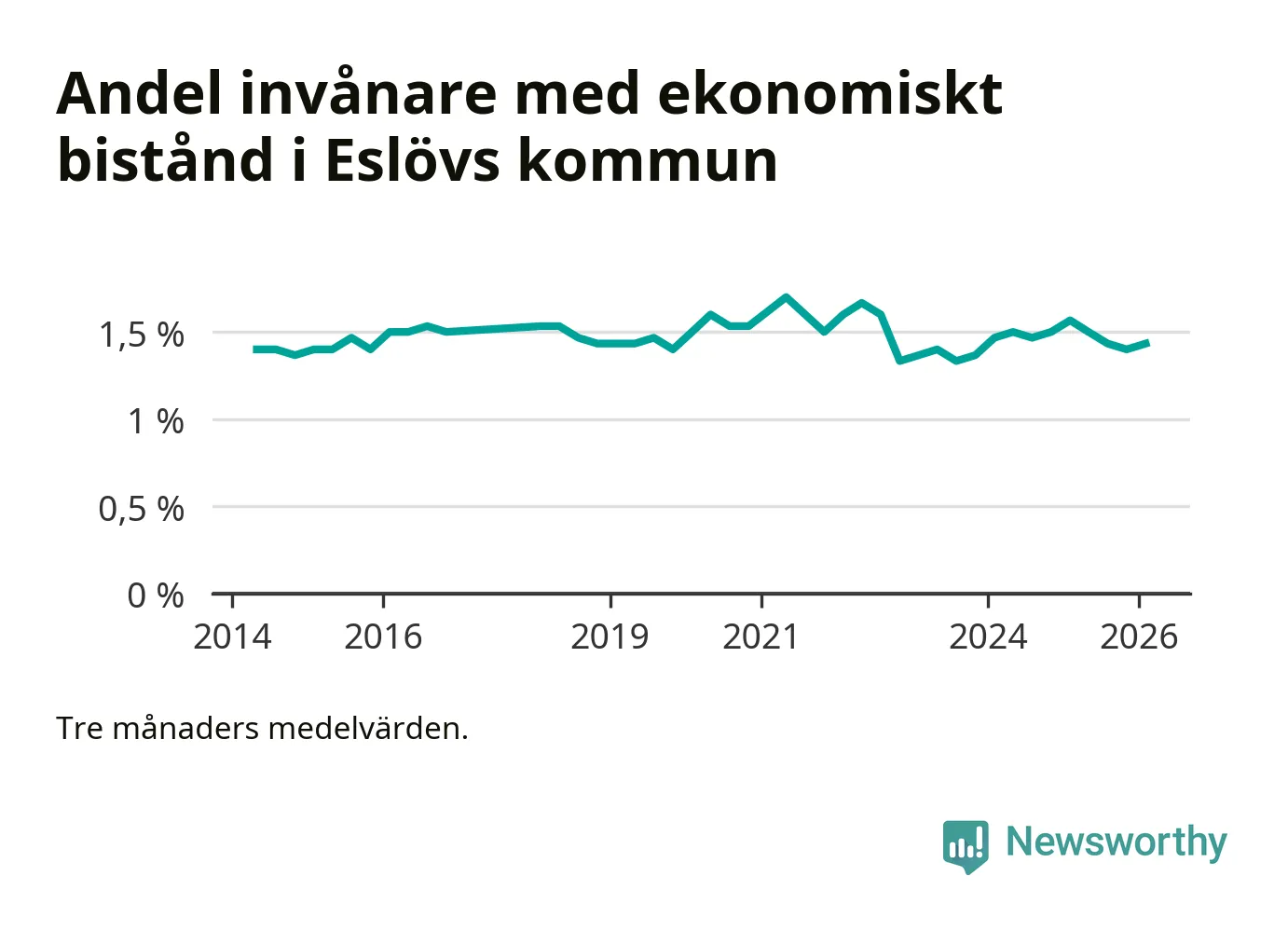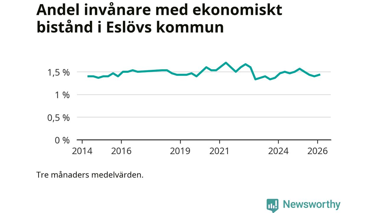 I genomsnitt 500 personer per månad fick ekonomiskt bistånd i Eslövs kommun under vintermånaderna (december till februari), vilket motsvarar 1,4 procent av den vuxna befolkningen. Det är marginellt mer än i höstas, och något mindre andel än under vintern för ett år sedan.