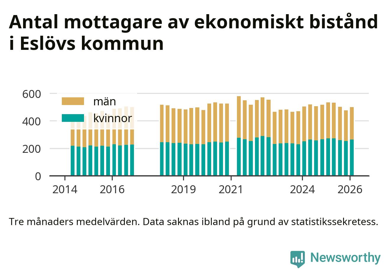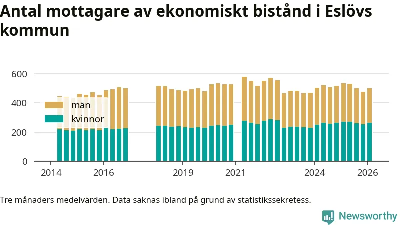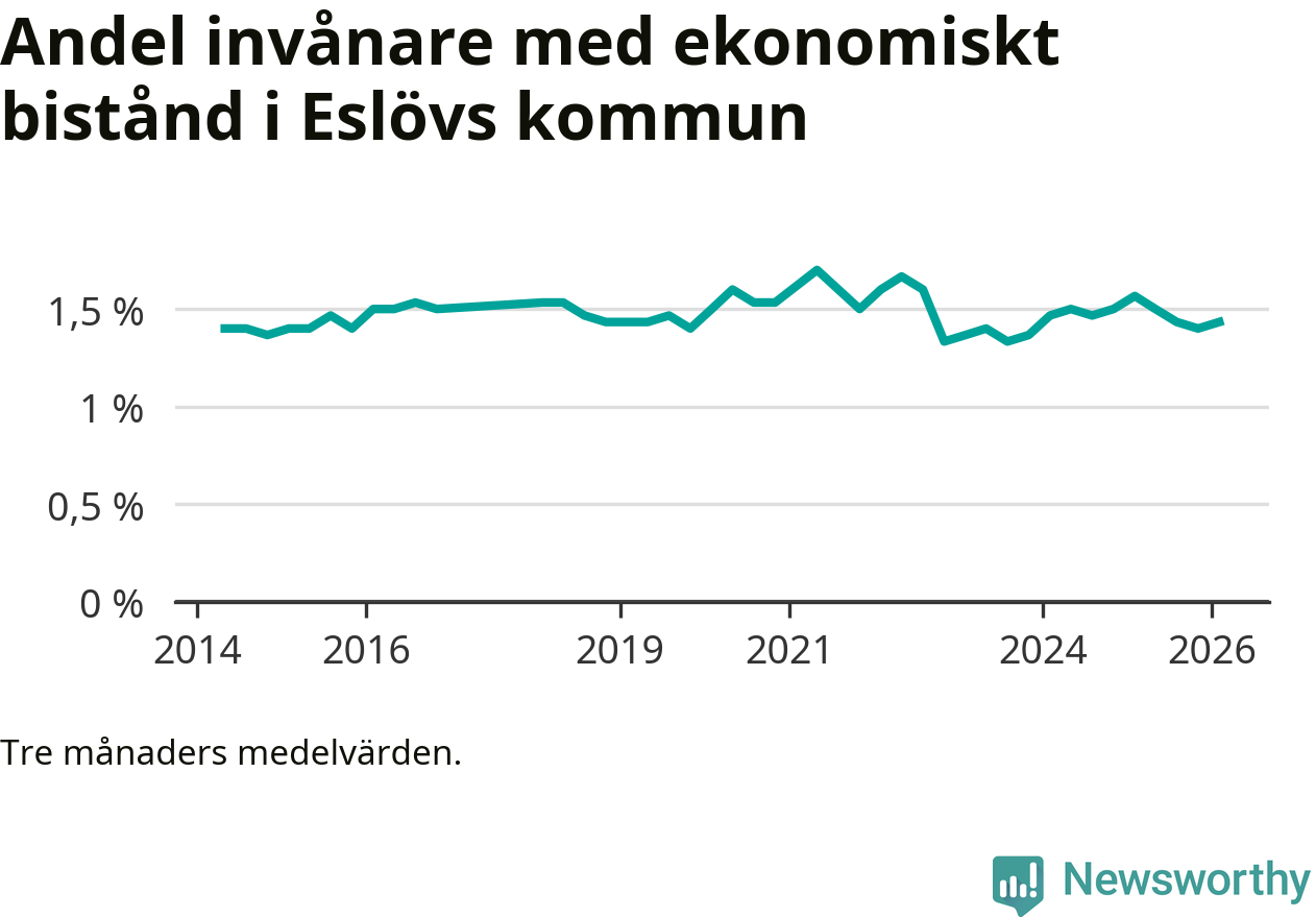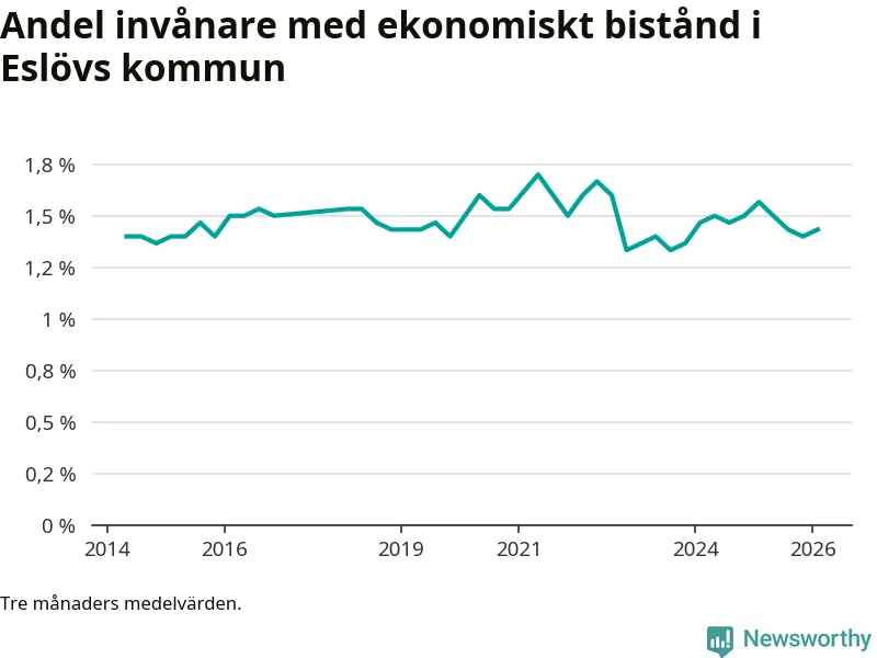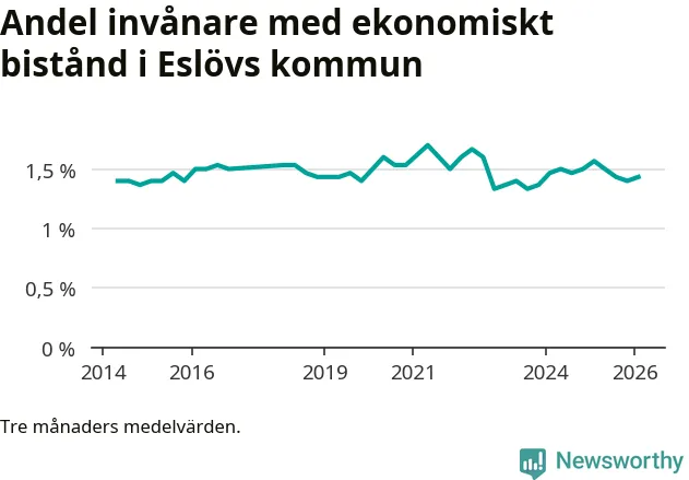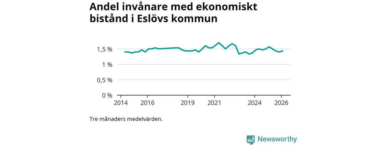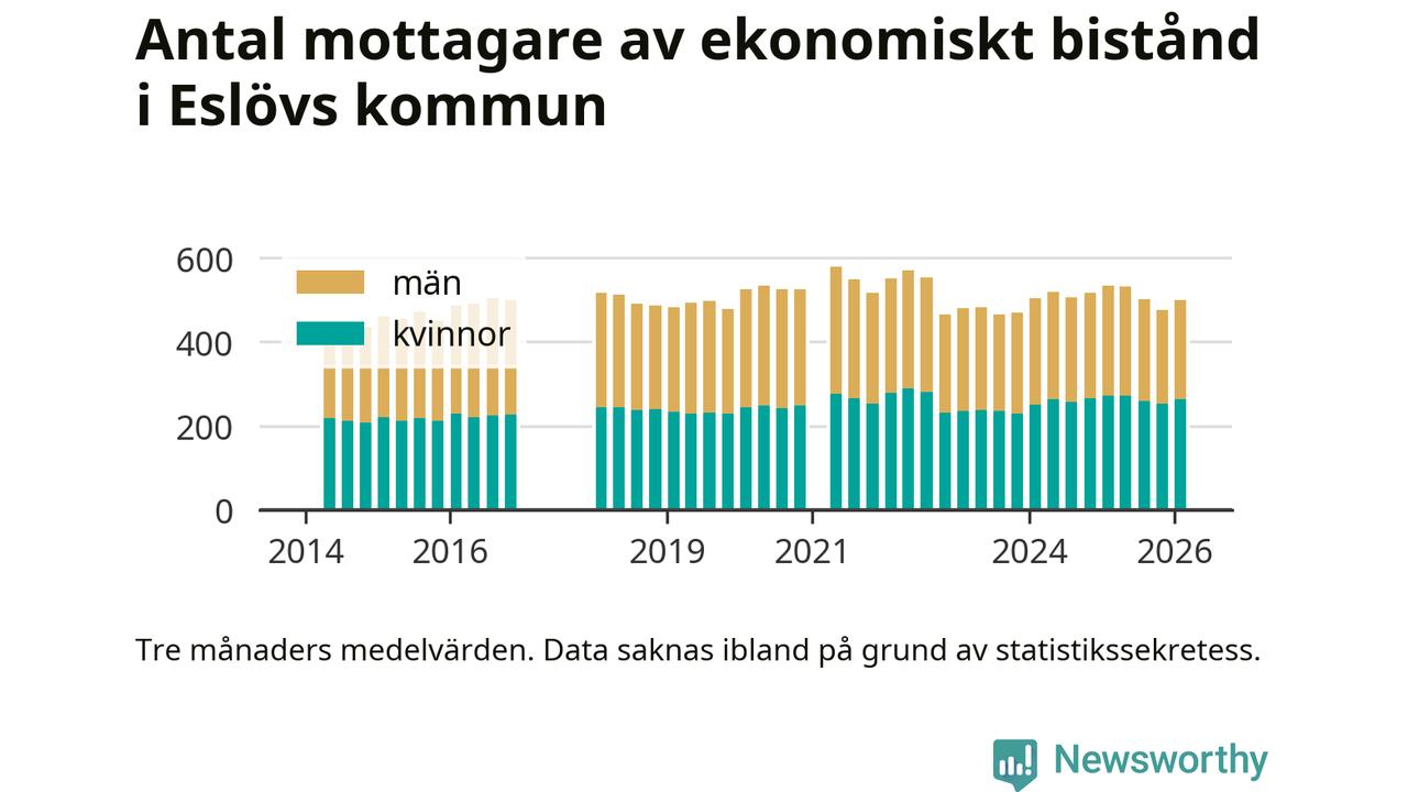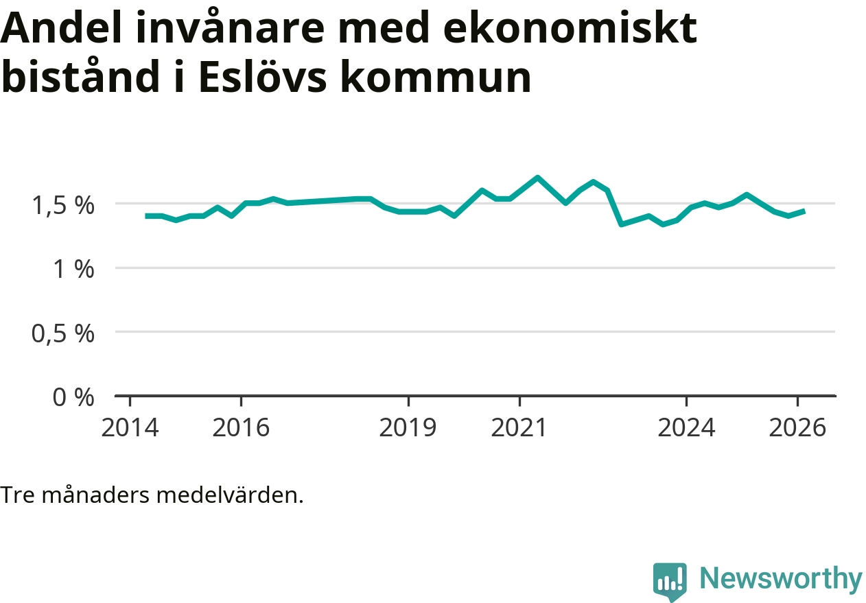 I genomsnitt 500 personer per månad fick ekonomiskt bistånd i Eslövs kommun under vintermånaderna (december till februari), vilket motsvarar 1,4 procent av den vuxna befolkningen. Det är marginellt mer än i höstas, och något mindre andel än under vintern för ett år sedan.