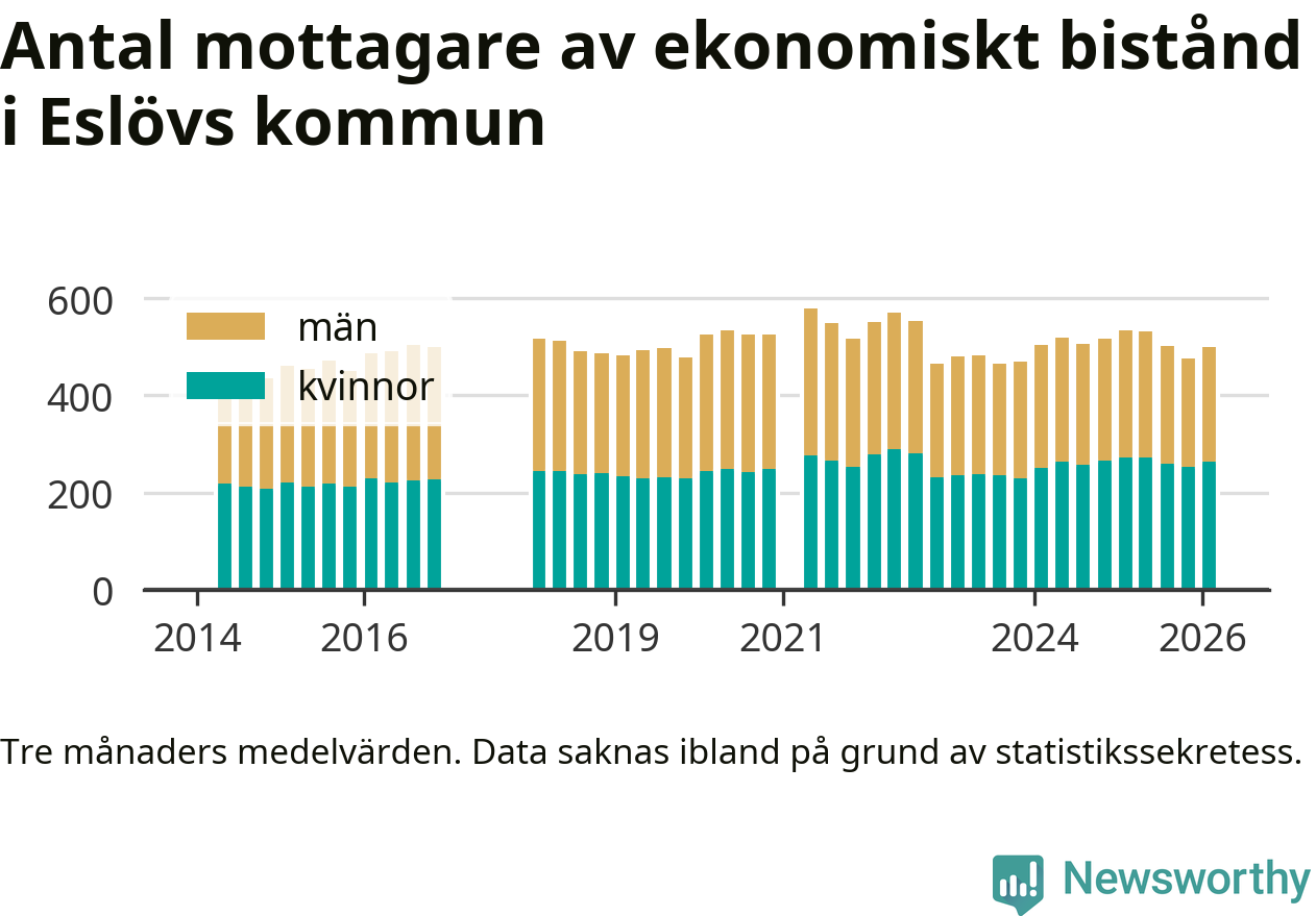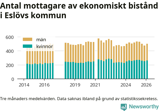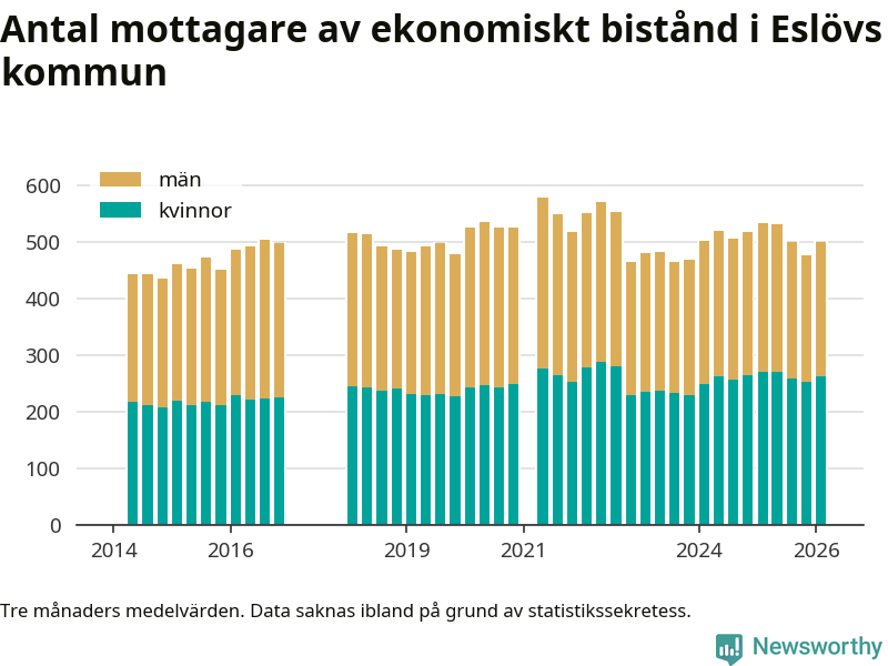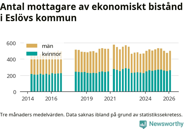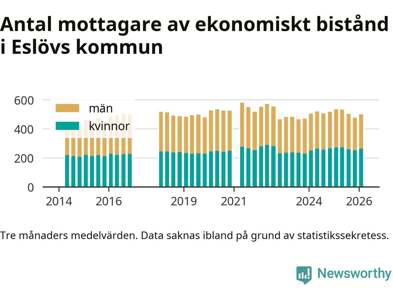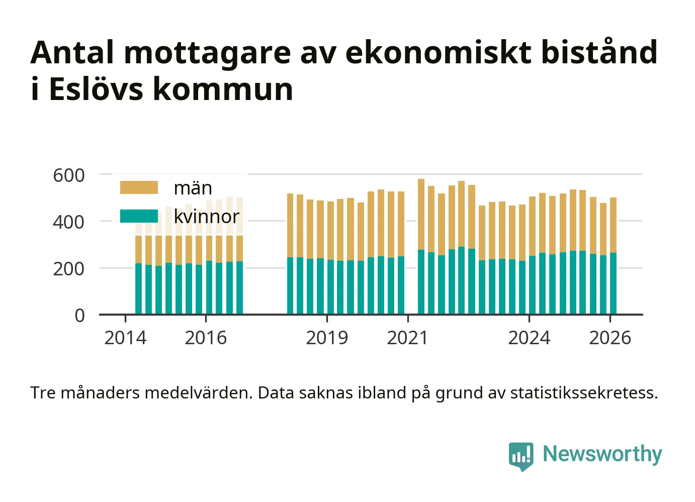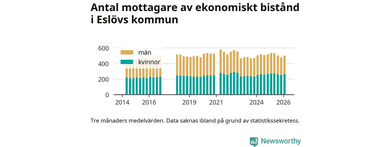 I genomsnitt 500 personer per månad fick ekonomiskt bistånd i Eslövs kommun under vintermånaderna (december till februari), vilket motsvarar 1,4 procent av den vuxna befolkningen. Det är marginellt mer än i höstas, och något mindre andel än under vintern för ett år sedan.