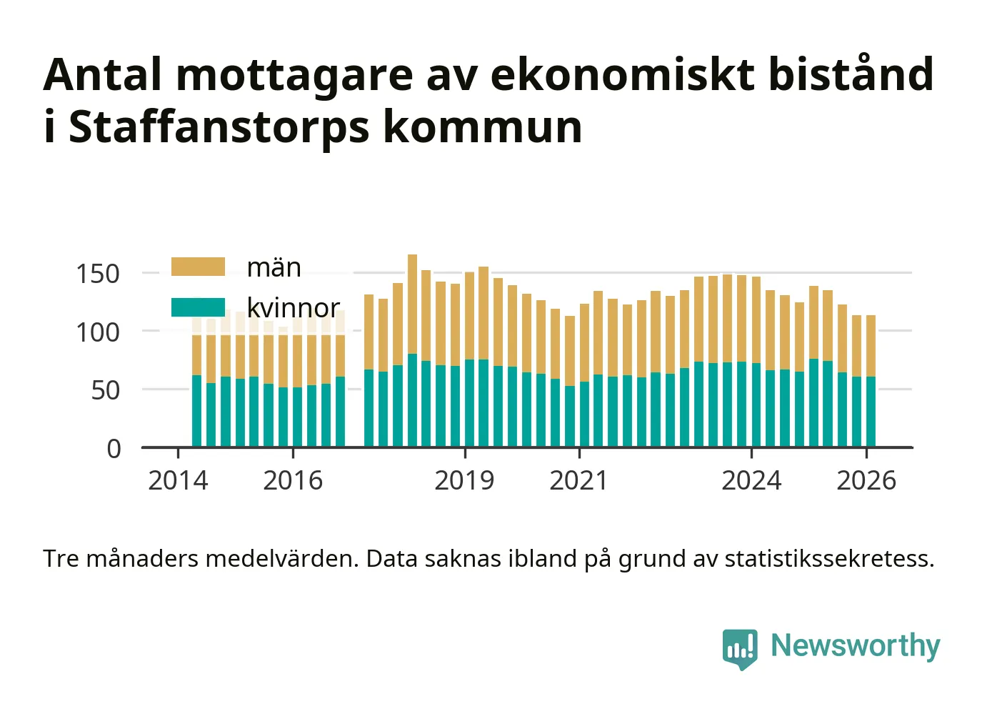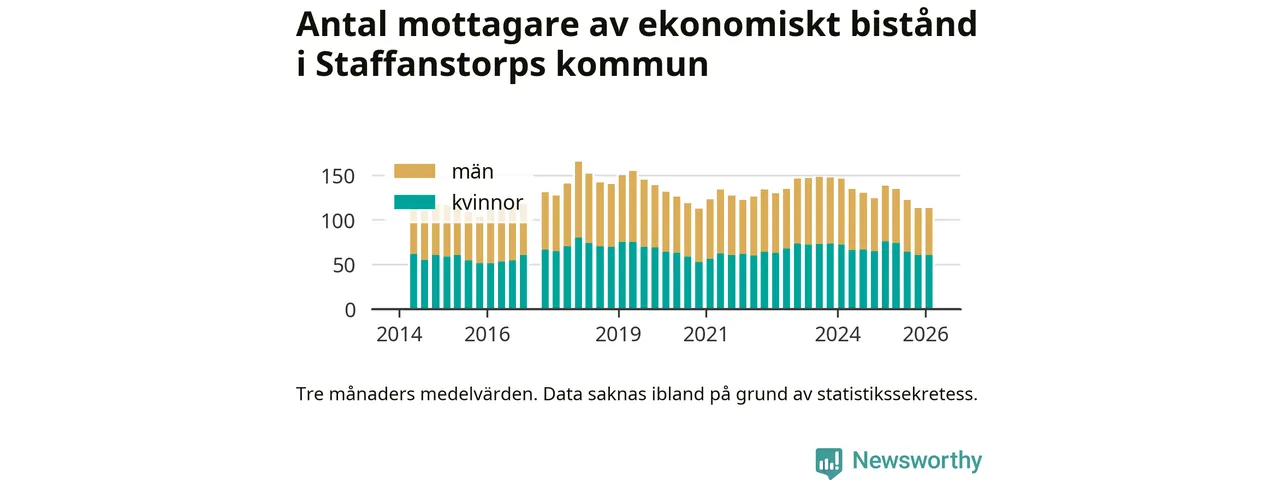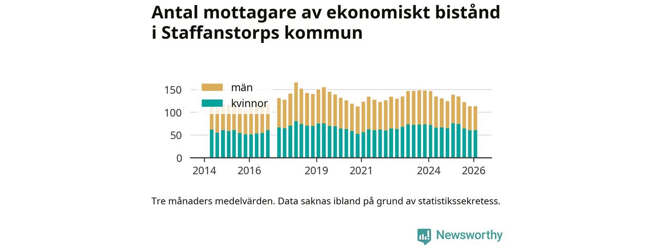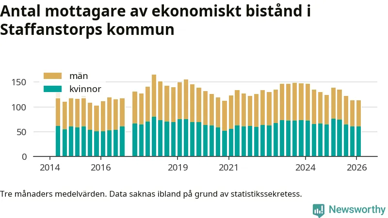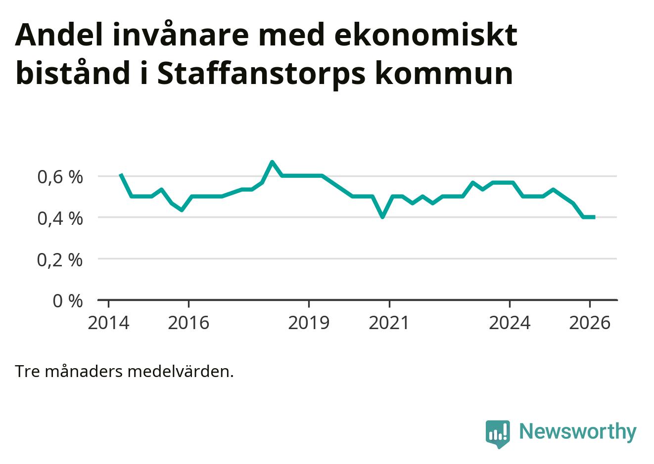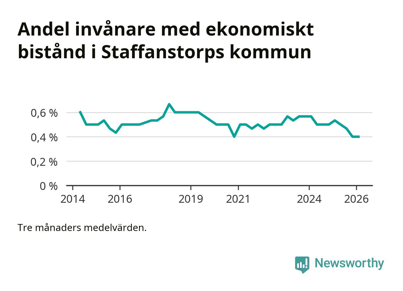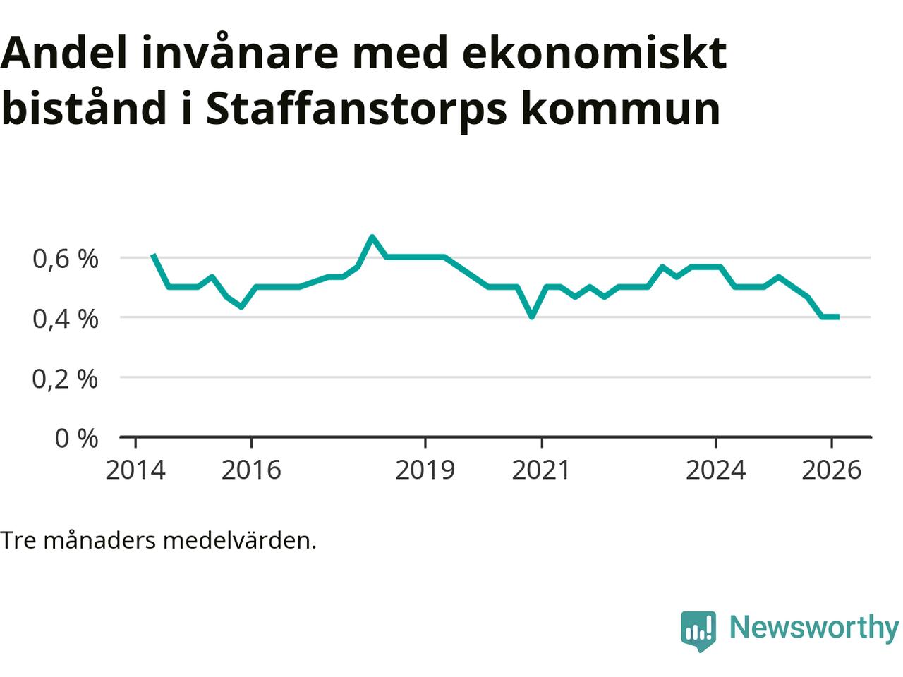 I genomsnitt 113 personer per månad fick ekonomiskt bistånd i Staffanstorps kommun under vintermånaderna (december till februari), vilket motsvarar 0,4 procent av den vuxna befolkningen. Det är lika stor andel som i höstas, och något mindre andel än under vintern för ett år sedan.
