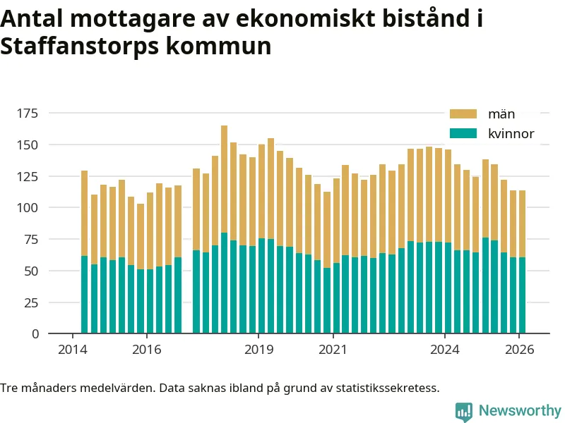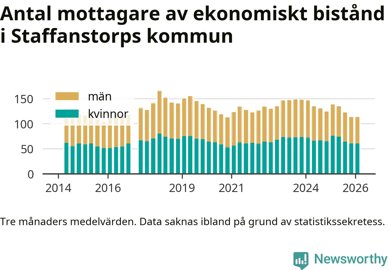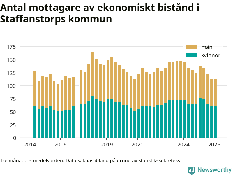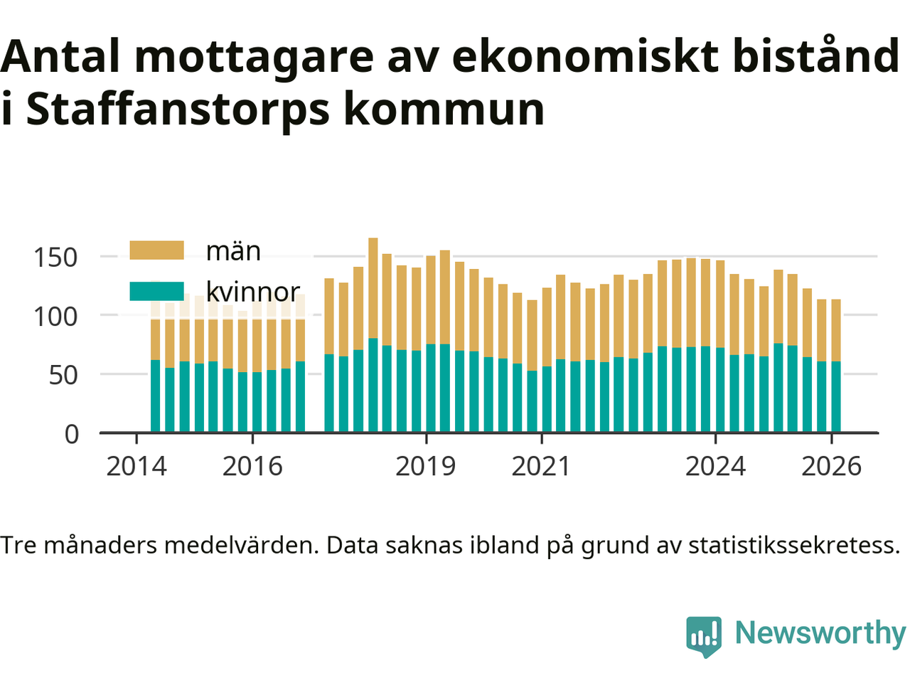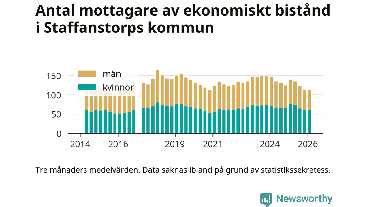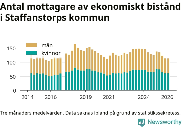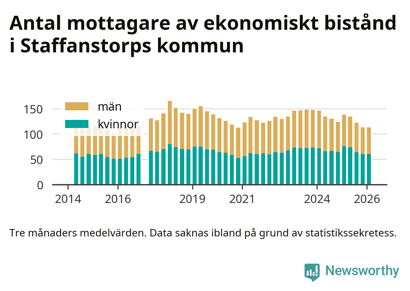 I genomsnitt 113 personer per månad fick ekonomiskt bistånd i Staffanstorps kommun under vintermånaderna (december till februari), vilket motsvarar 0,4 procent av den vuxna befolkningen. Det är lika stor andel som i höstas, och något mindre andel än under vintern för ett år sedan.