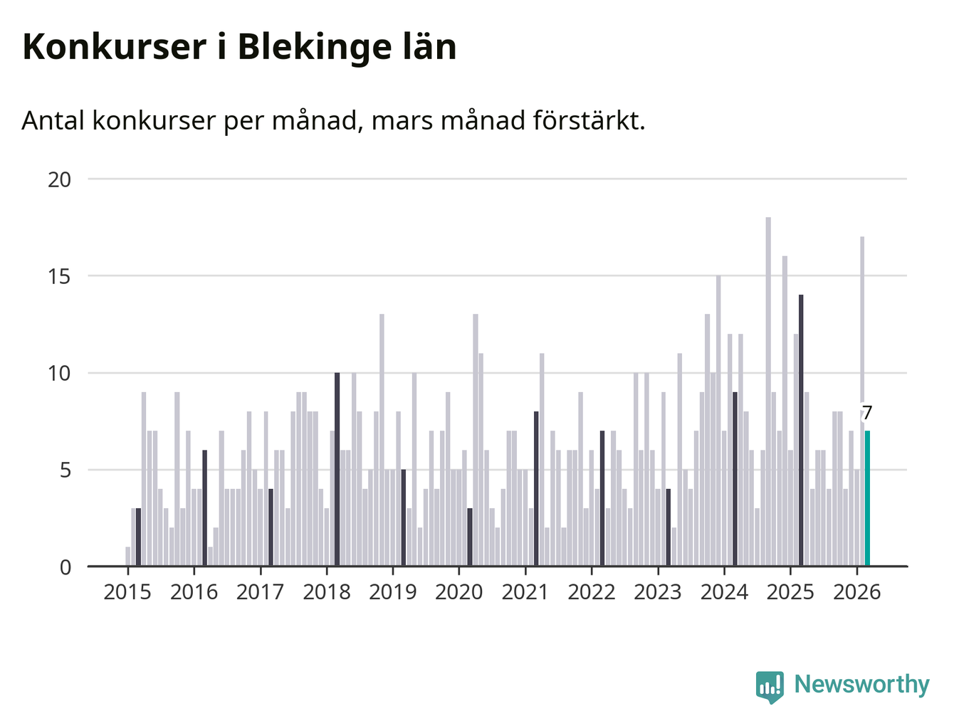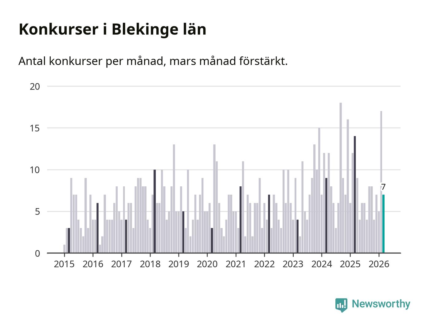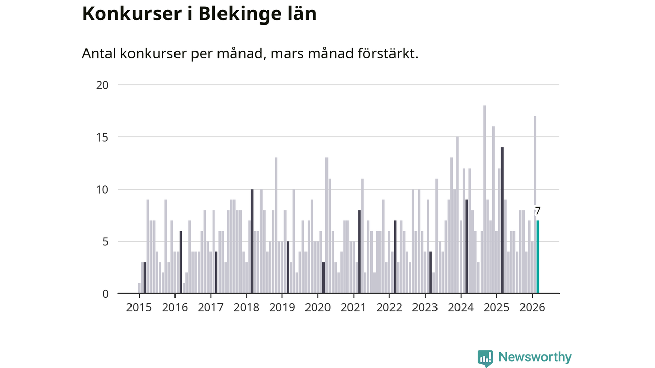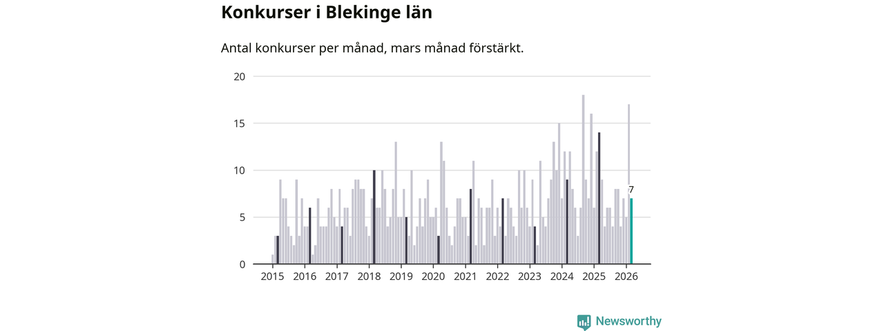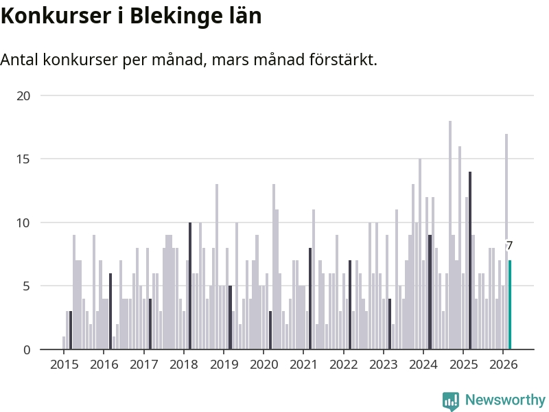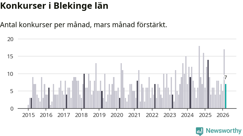 Under mars månad gick sju bolag med säte i Blekinge i konkurs. Det är en tämligen normal nivå för den här tiden på året. I fjol noterades 14 konkurser under mars.