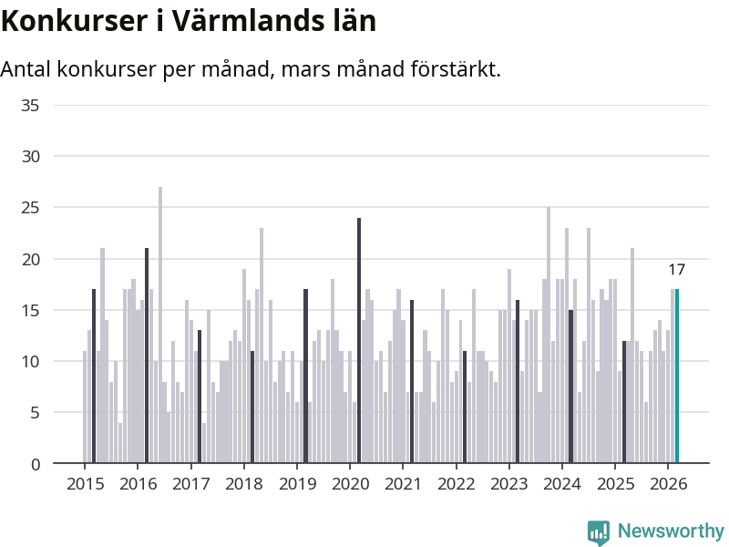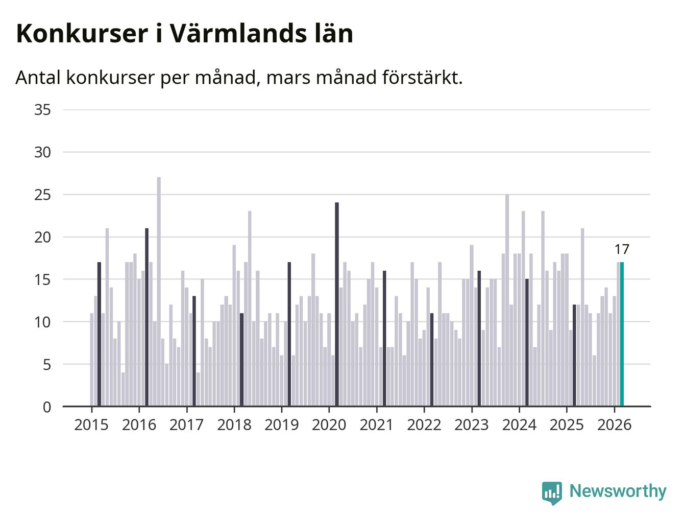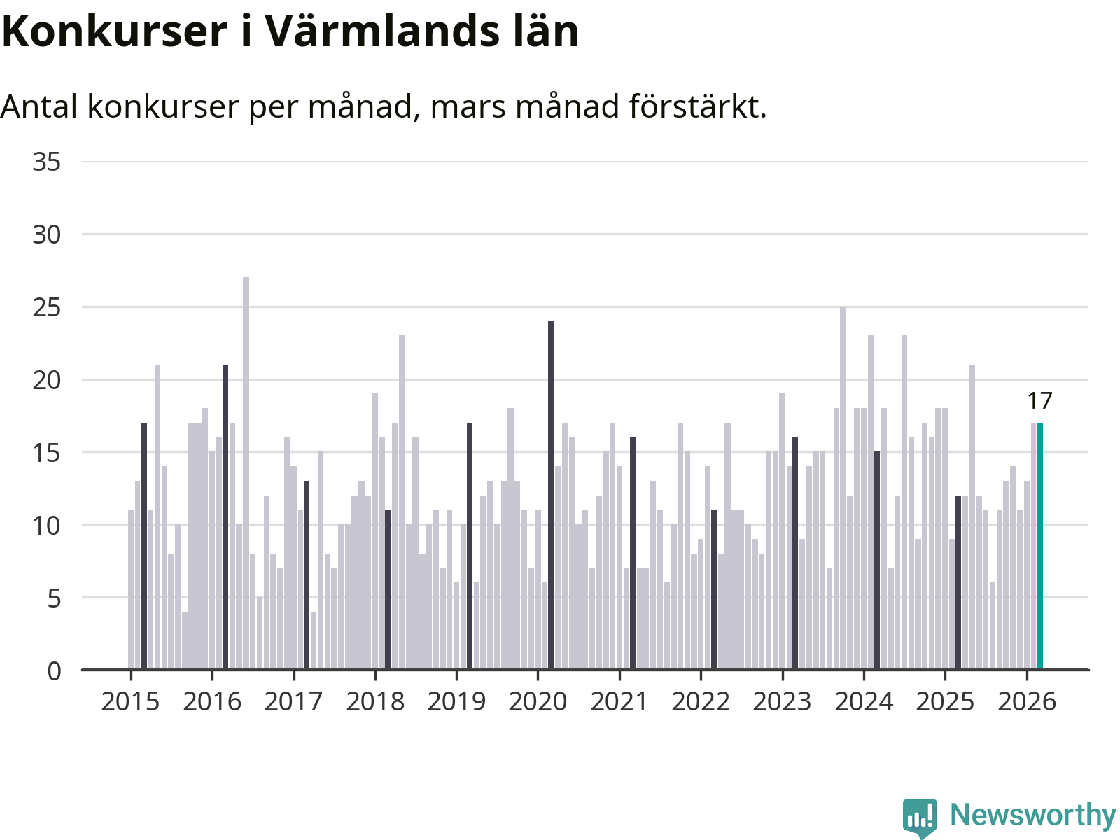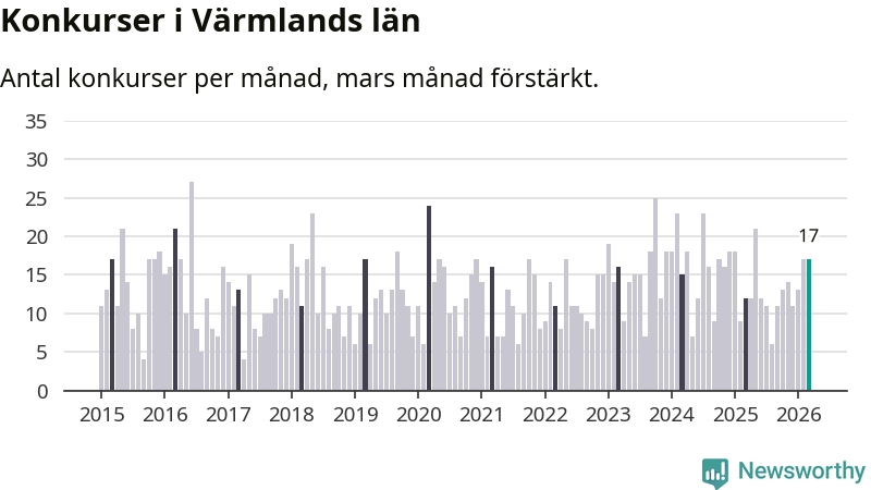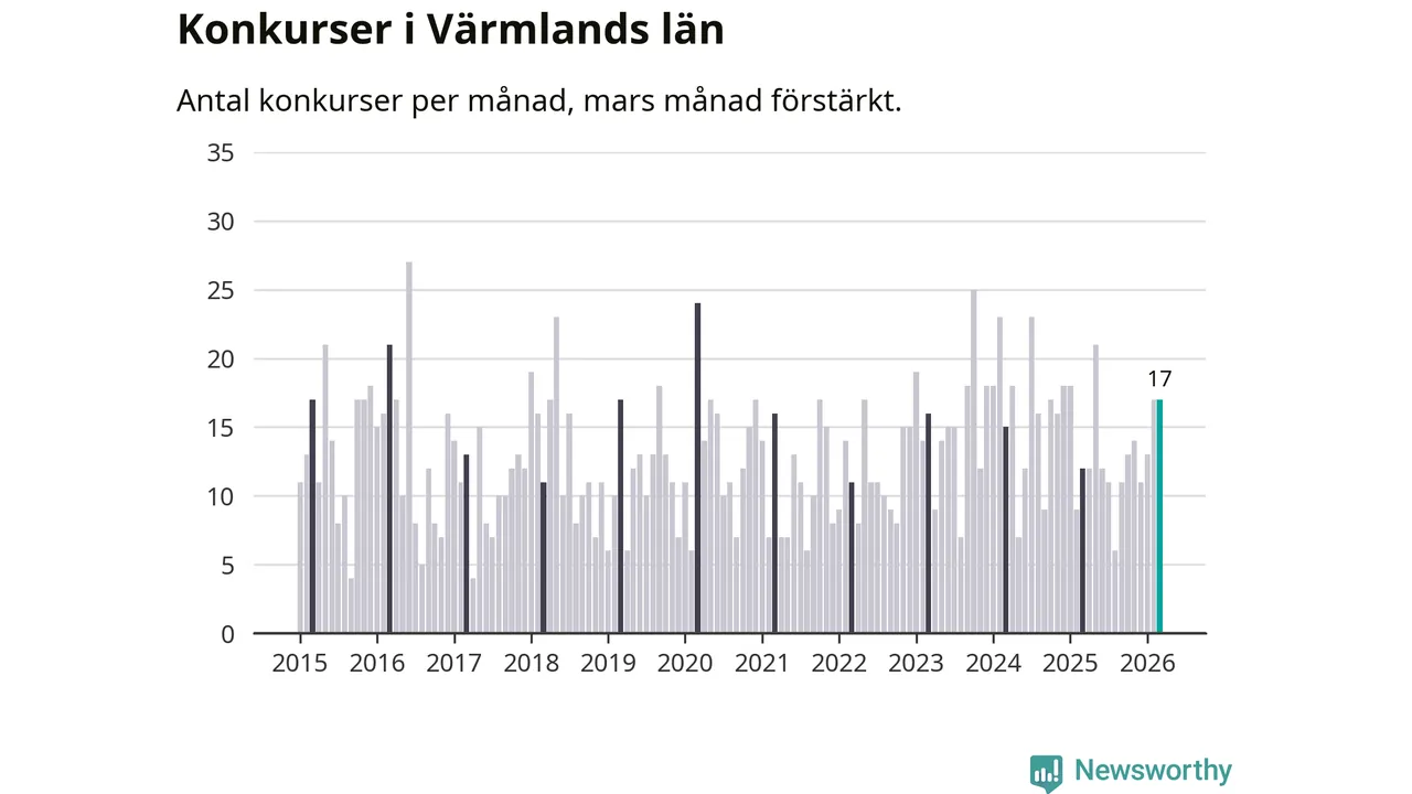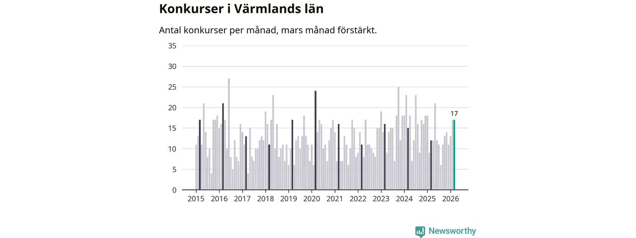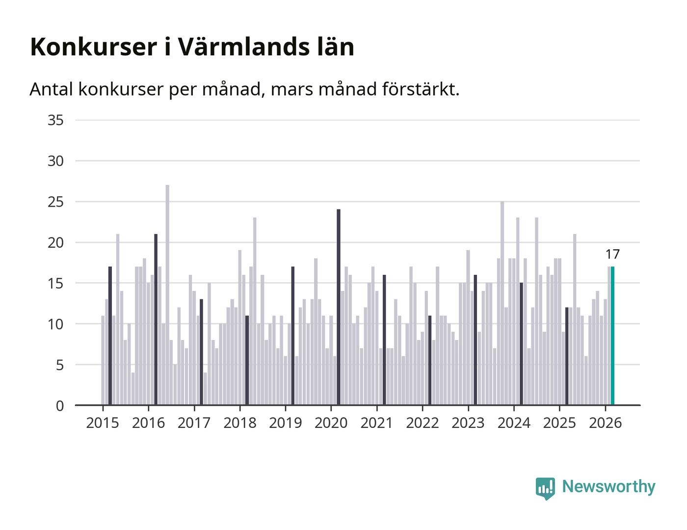 Under mars månad gick 17 bolag med säte i Värmland i konkurs. Det är en tämligen normal nivå för den här tiden på året. I fjol noterades tolv konkurser under mars.