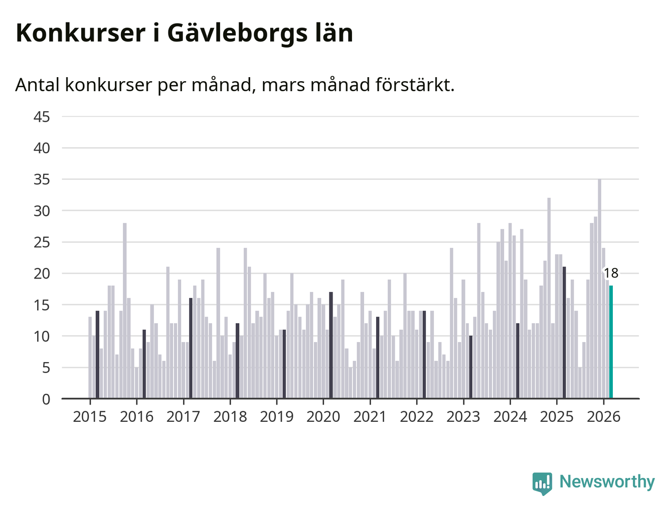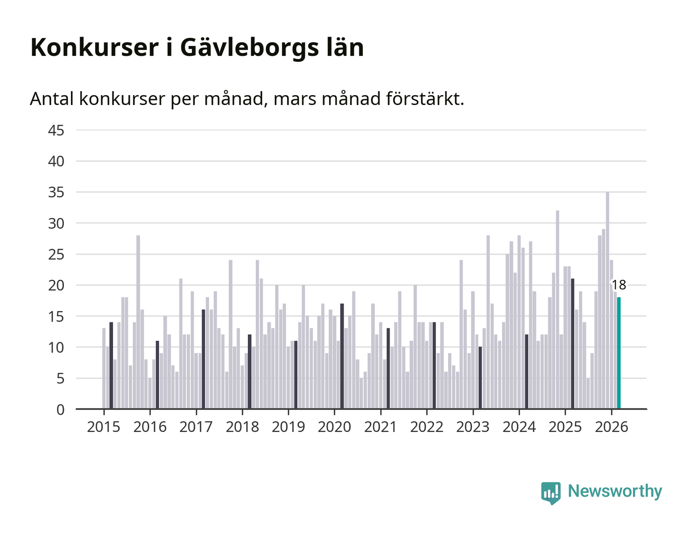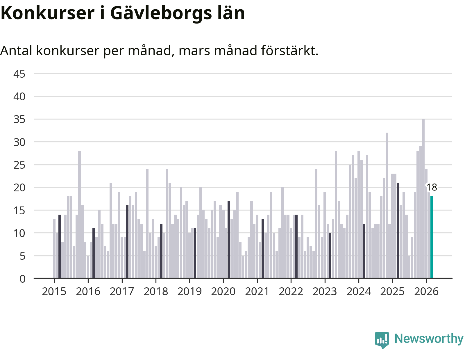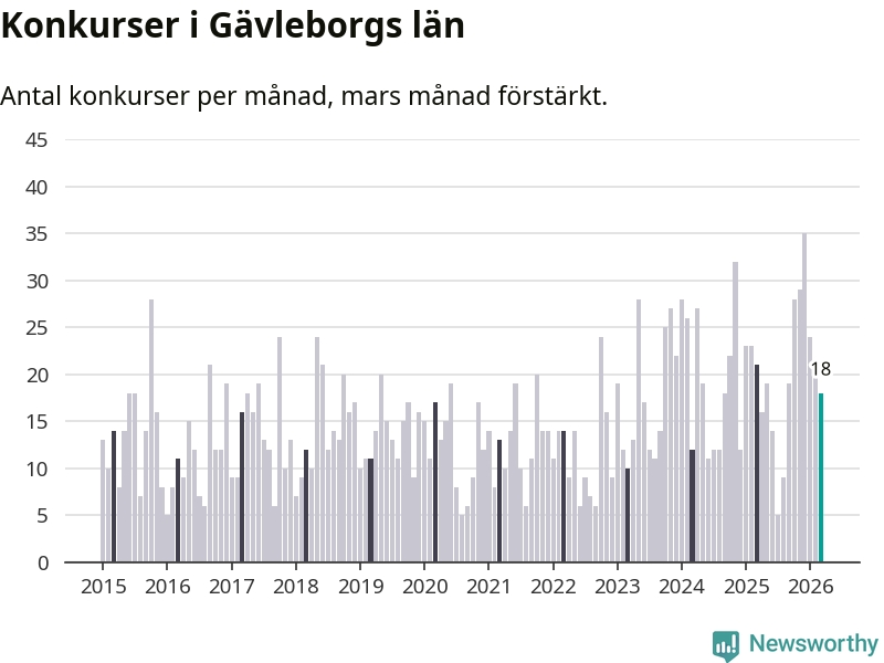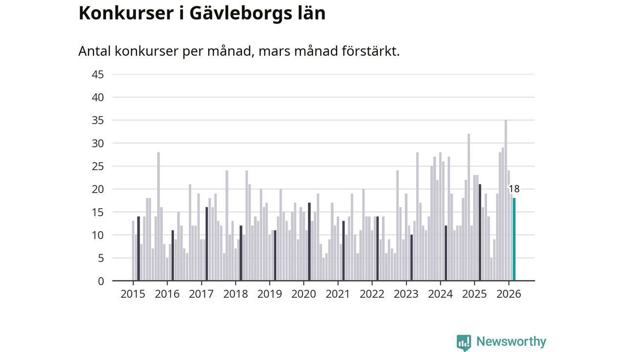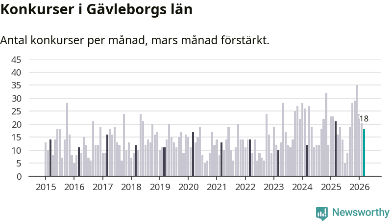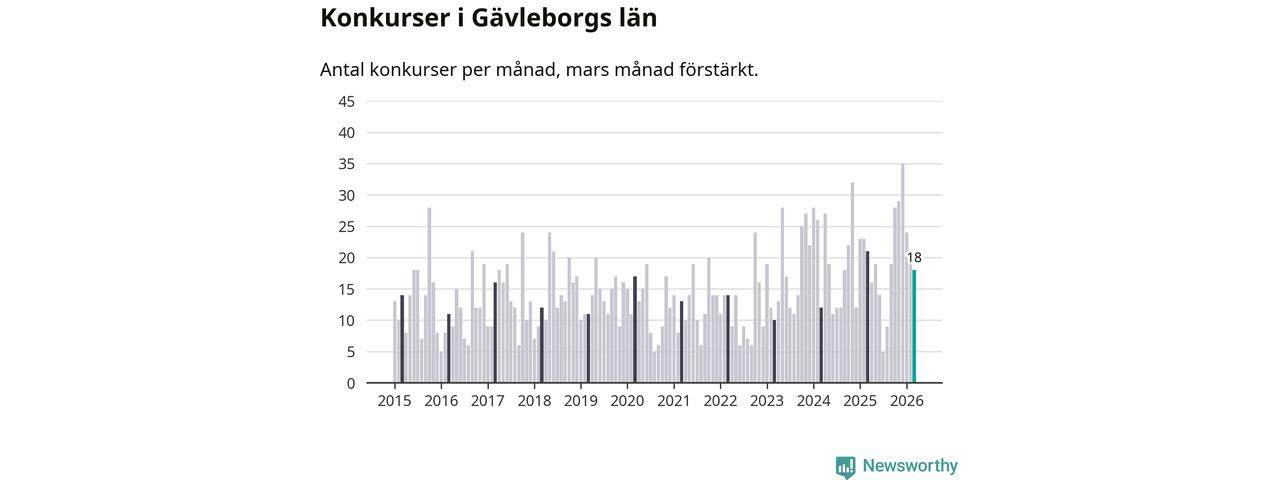 Under mars månad gick 18 bolag med säte i Gävleborg i konkurs. Det är en tämligen normal nivå för den här tiden på året. I fjol noterades 21 konkurser under mars.