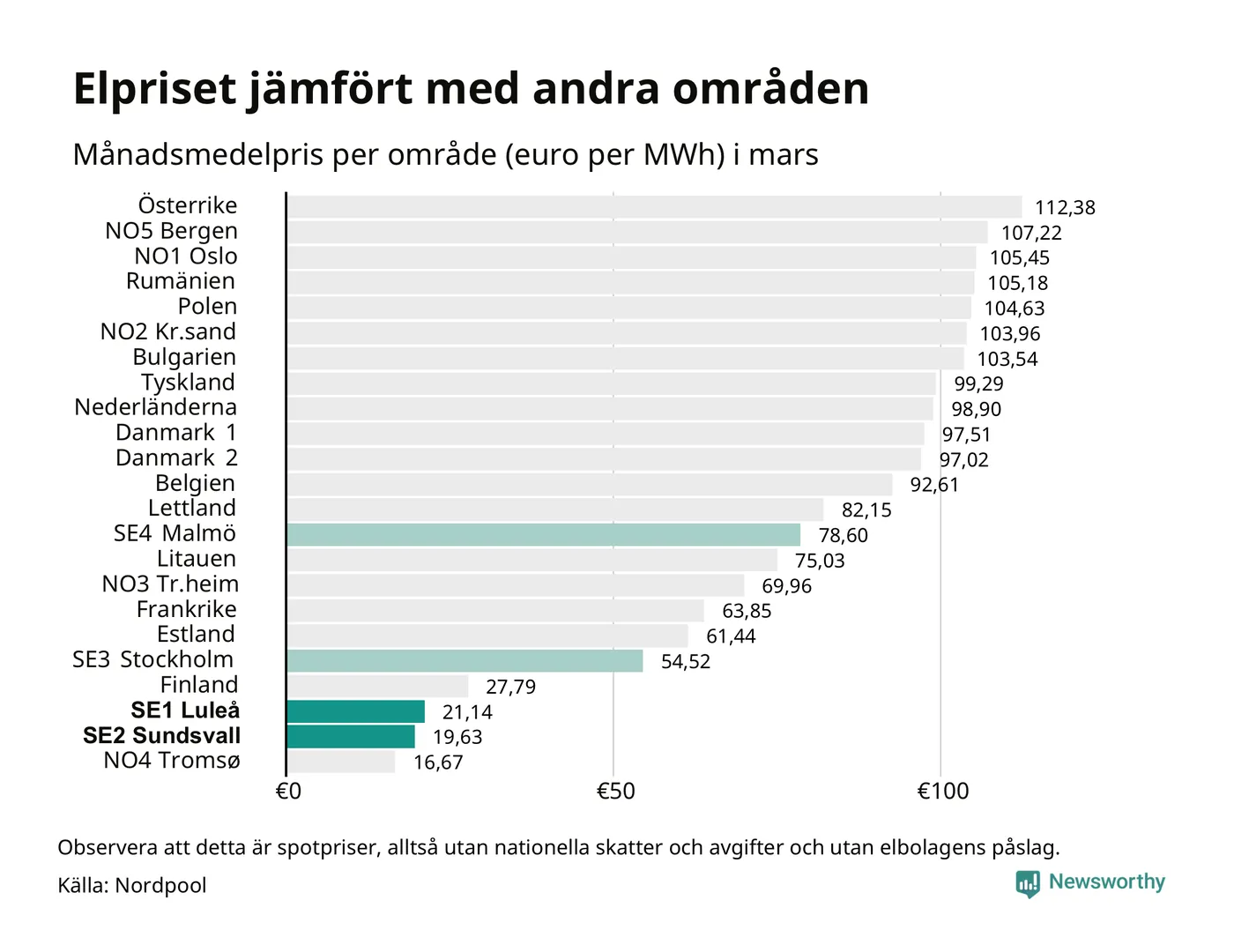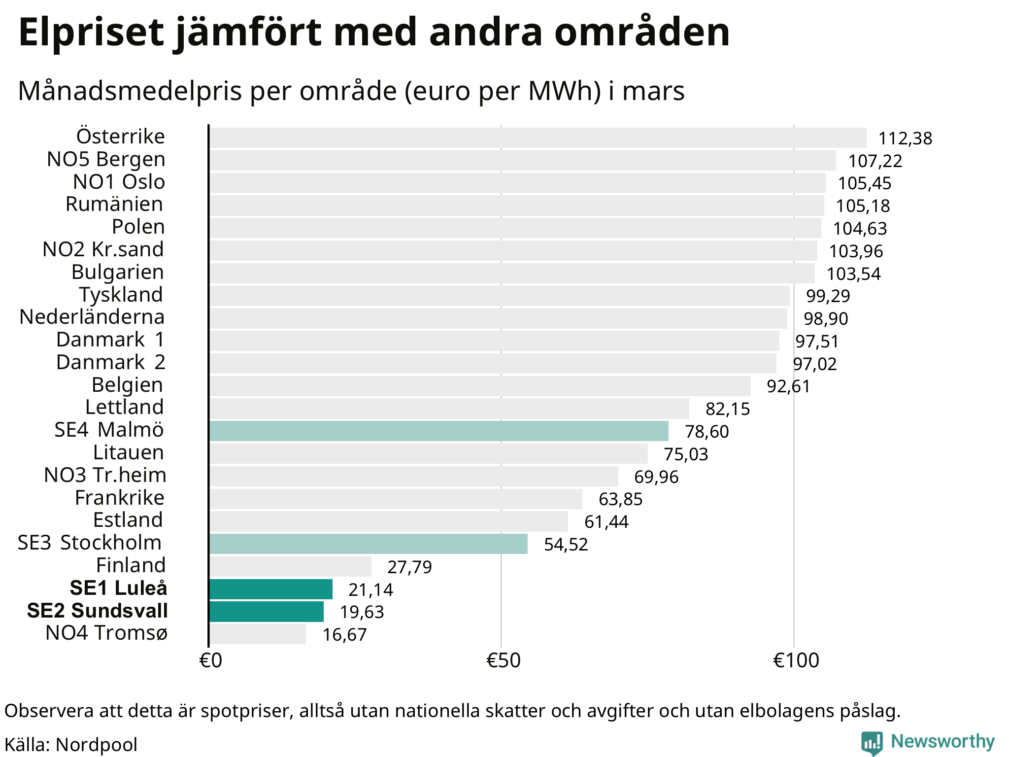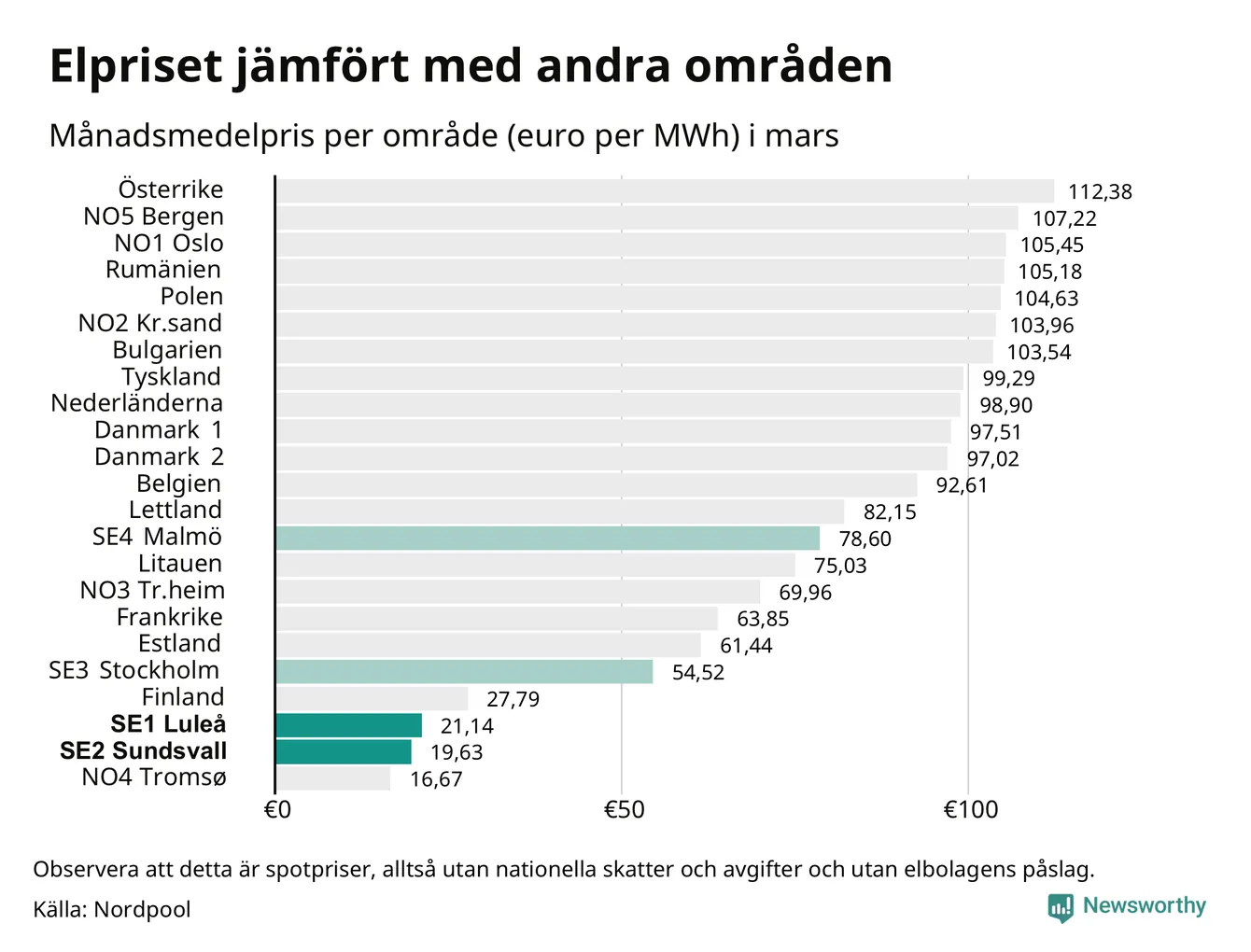 Om man tittar på månadsmedelpriset brukar de svenska elområdena oftast tillhöra de med lägst spotpriser i en europeisk jämförelse. Värt att notera är att detta handlar om spotpriser, de priser konsumenten sedan betalar beror på nationella avgifter och skatter samt elbolagens påslag. I praktiken ligger de svenska konsumentpriserna närmare det europeiska snittet efter skatter och påslag.