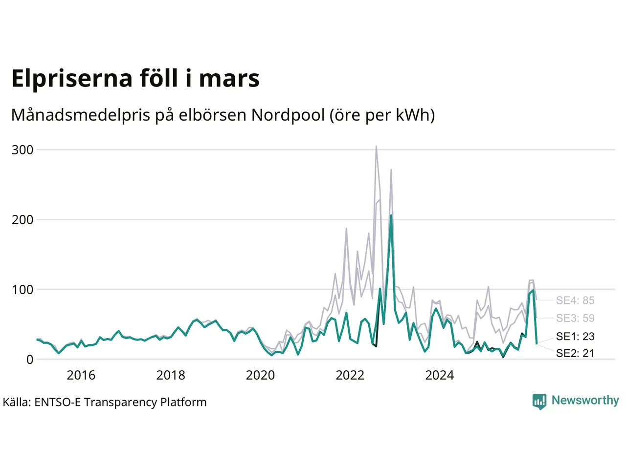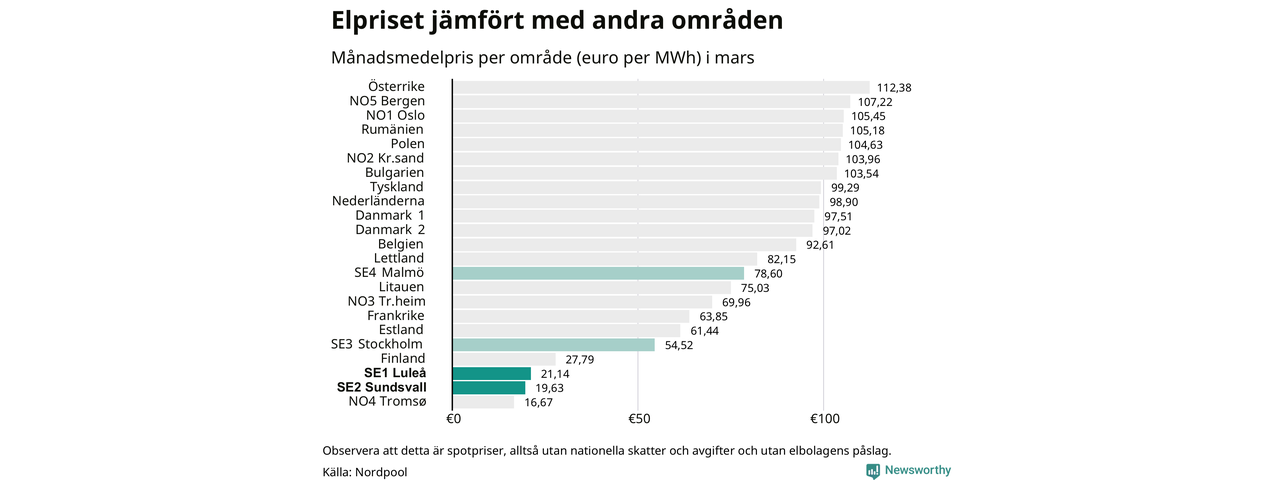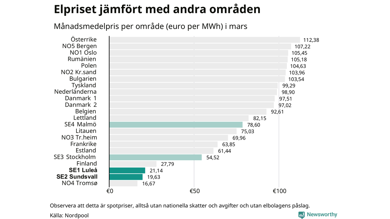 Det betyder också att det kan vara olika pris i de olika områdena. Elområde 1 och elområde 2 som Umeå delas mellan följer ofta varadra ofta prismässigt. Sedan 2020 har medelpriset skilt sig under 19 månader. Också i mars var priset det samma i båda områdena.