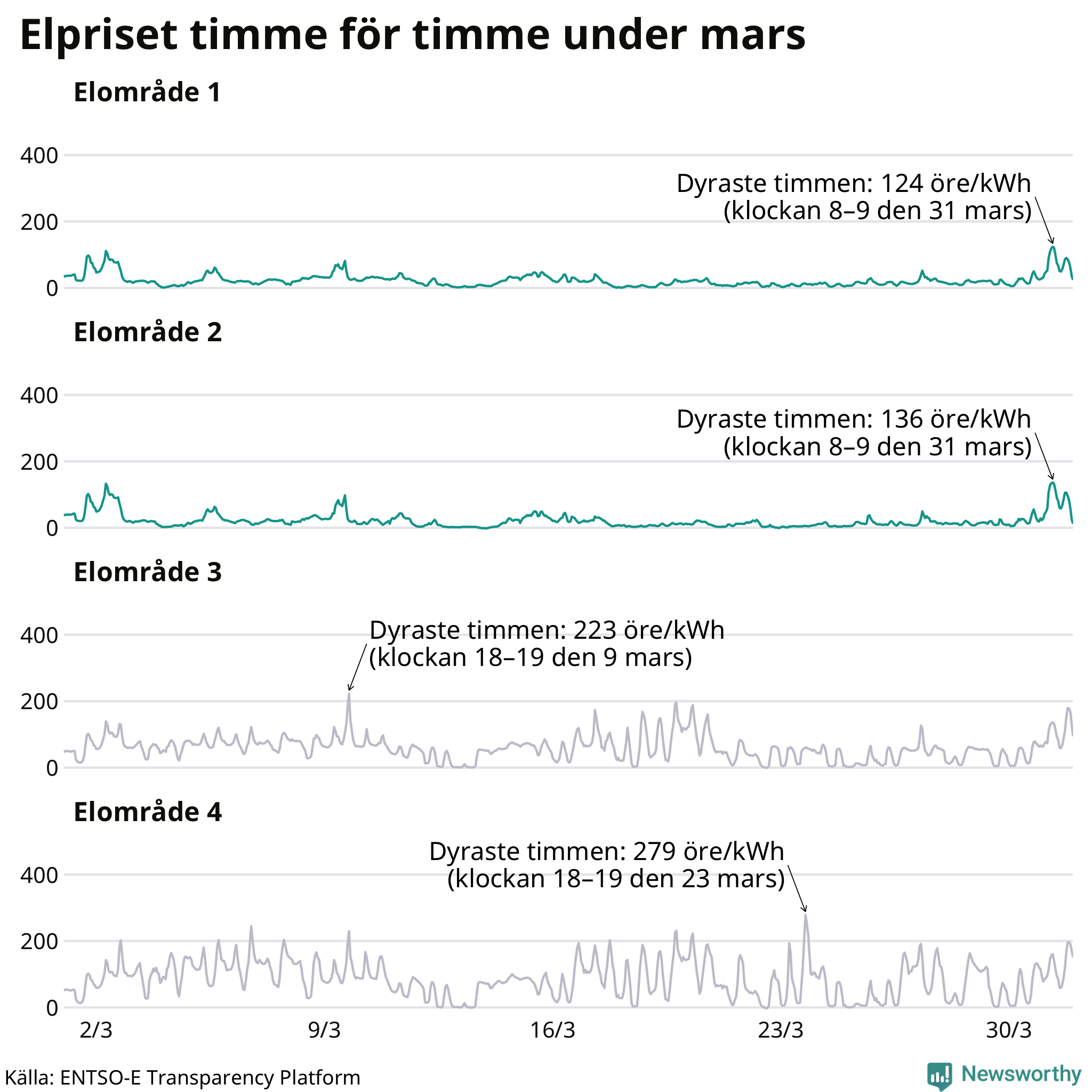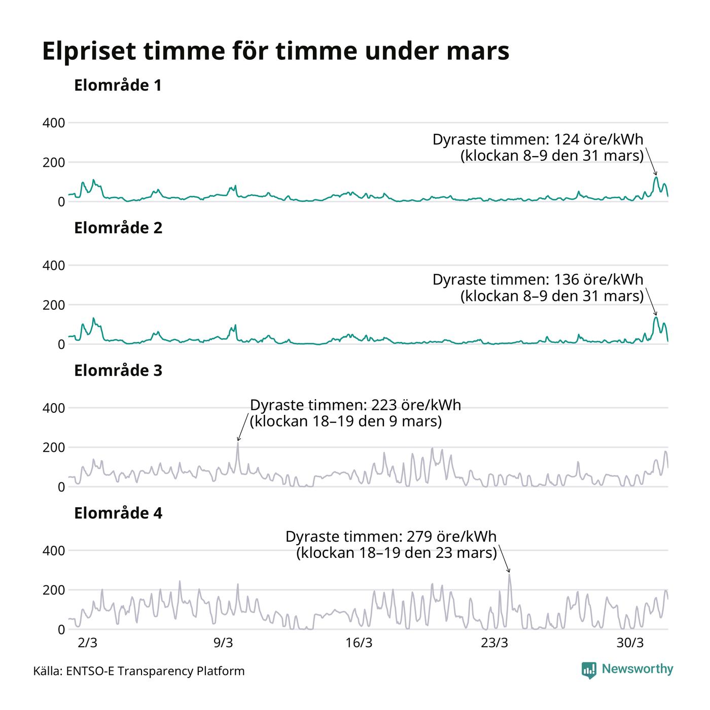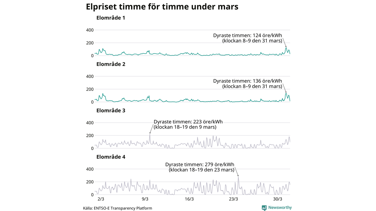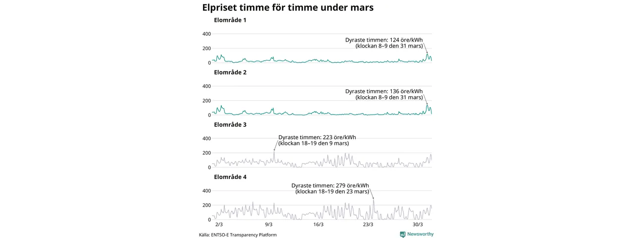 Det är inte bara prisskillnaderna mellan prisområdena som har ökat de senaste åren, även inom områdena pendlar priserna timme för timme – och skillnaderna mellan de dyraste och billigaste timmarna har blivit större sedan 2020. Dyraste timmen i mars i elområde 2 inträffade mellan klockan 8 och 9 den 31 mars, då kostade en kilowattimme 136 öre. Som lägst var priset i området −2 öre. I elområde 1 toppade priset samtidigt på 124 öre per kilowattimme. Som lägst kostade elen i området 0 öre per kilowattimme.