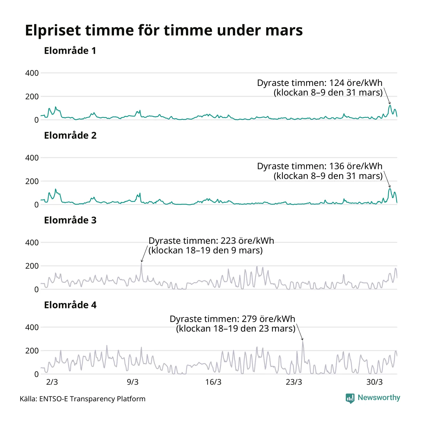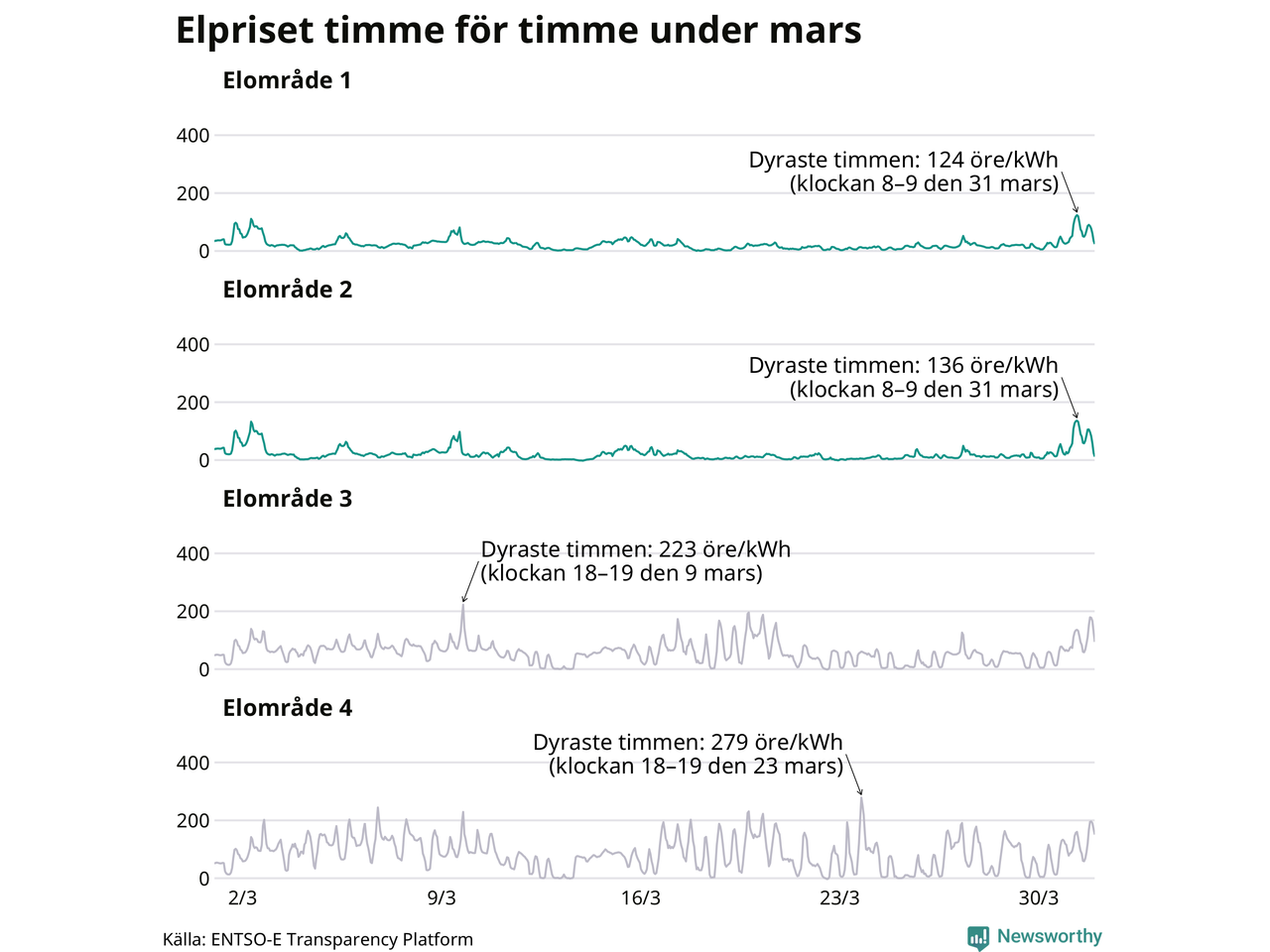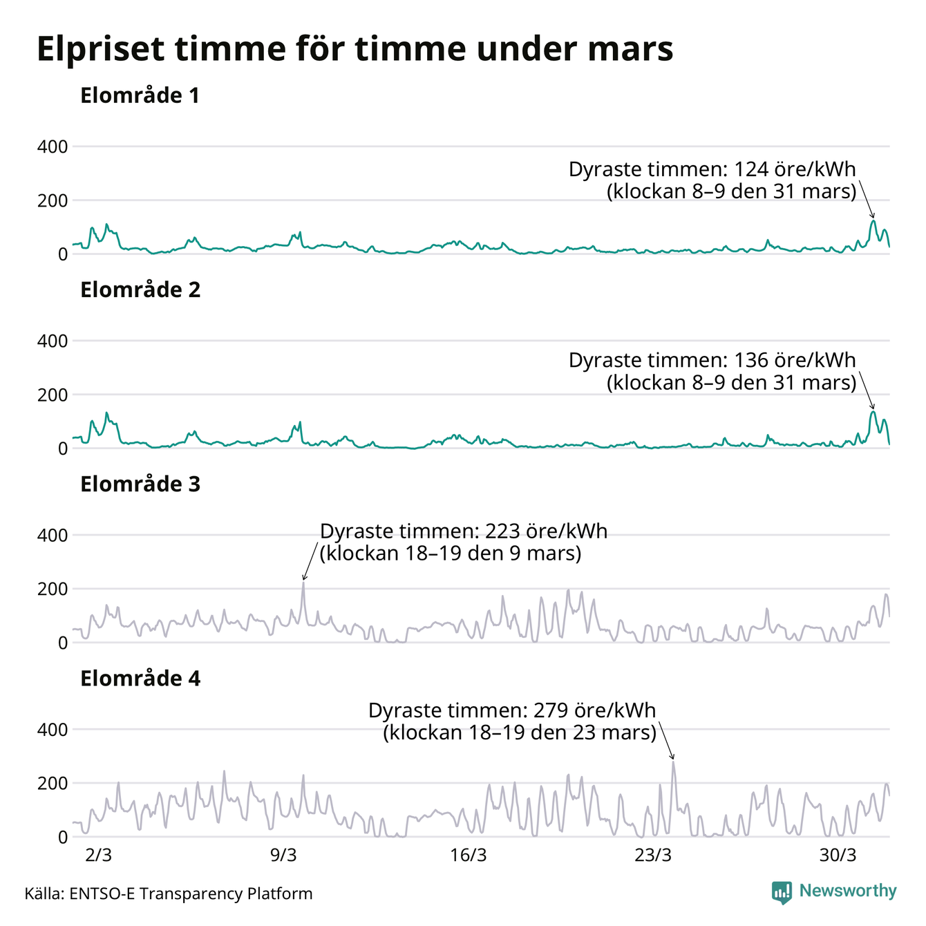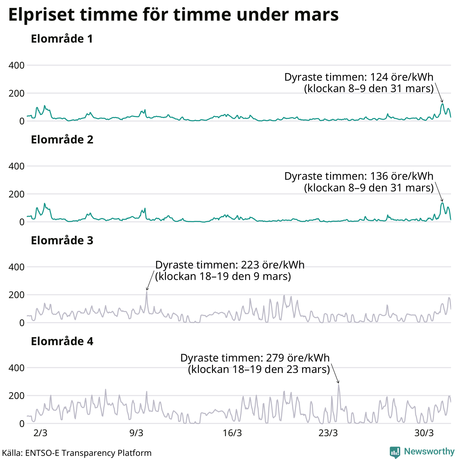 Det är inte bara prisskillnaderna mellan prisområdena som har ökat de senaste åren, även inom områdena pendlar priserna timme för timme – och skillnaderna mellan de dyraste och billigaste timmarna har blivit större sedan 2020. Dyraste timmen i mars i elområde 2 inträffade mellan klockan 8 och 9 den 31 mars, då kostade en kilowattimme 136 öre. Som lägst var priset i området −2 öre. I elområde 1 toppade priset samtidigt på 124 öre per kilowattimme. Som lägst kostade elen i området 0 öre per kilowattimme.