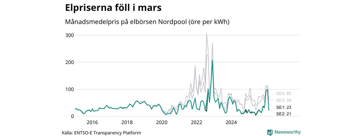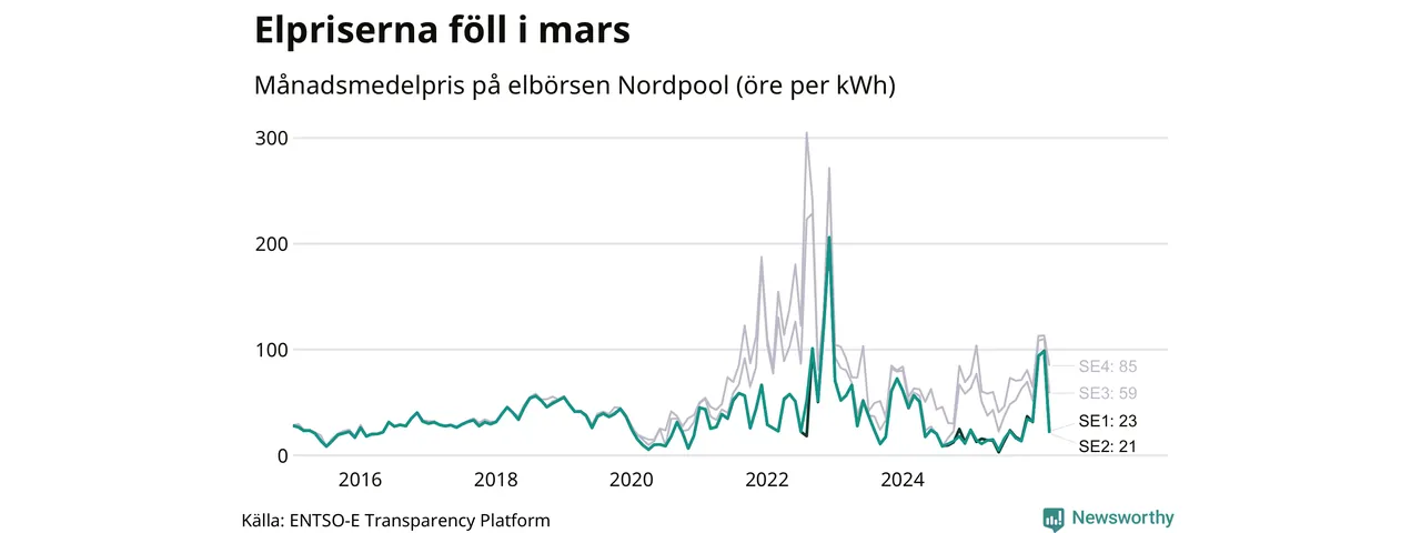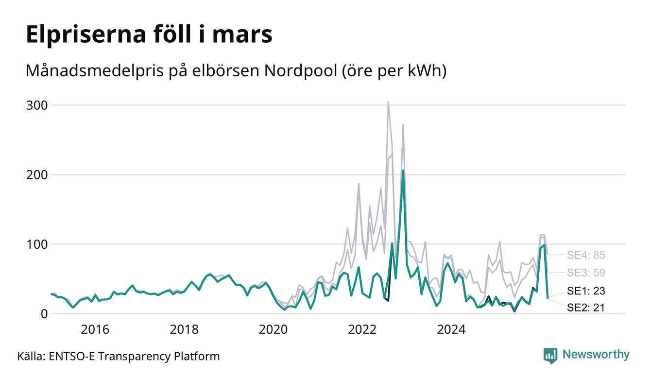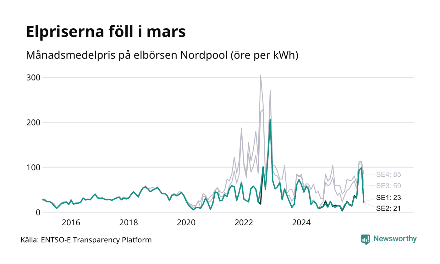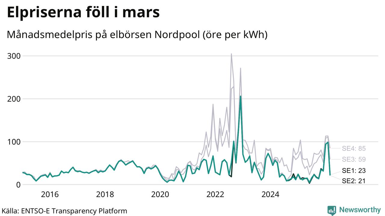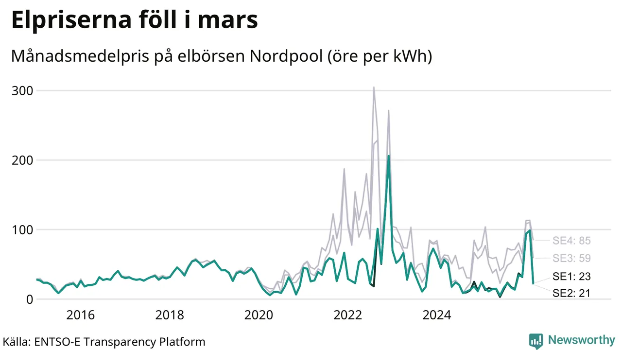 Umeå kommun tillhör två elområden, tätorten Umeå ligger i elområde 2, medan till exempel Botsmark tillhör elområde 1. Spotpriset – alltså priset som elbolagen köper in elen för – minskade i båda områdena i mars: I elområde 2 landade månadspriset per kilowattimme på 21 öre och i elområde 1 23 öre. Motsvarande priser i februari var 98 öre (elområde 2) och 99 öre per kilowattimme (elområde 1). Rekordnoteringarna för områdena är på 206 öre per kilowattimme. De noterades i december 2022. För ett år sedan, i mars 2025, var snittpriset 11 öre per kilowattimme i elområde 2 och 16 öre per kilowattimme i elområde 1.