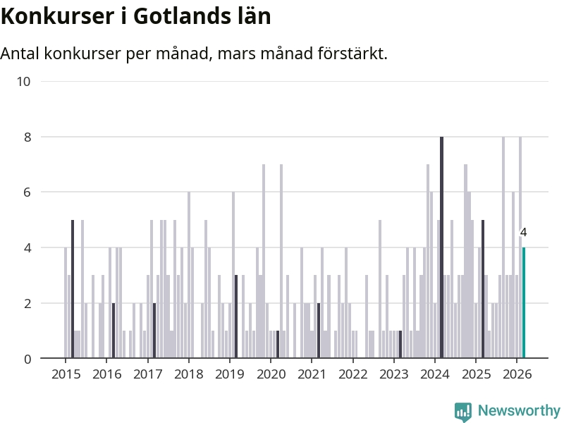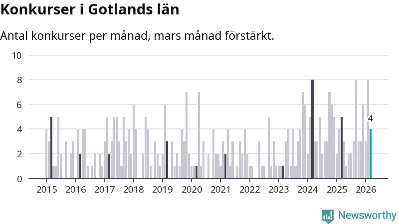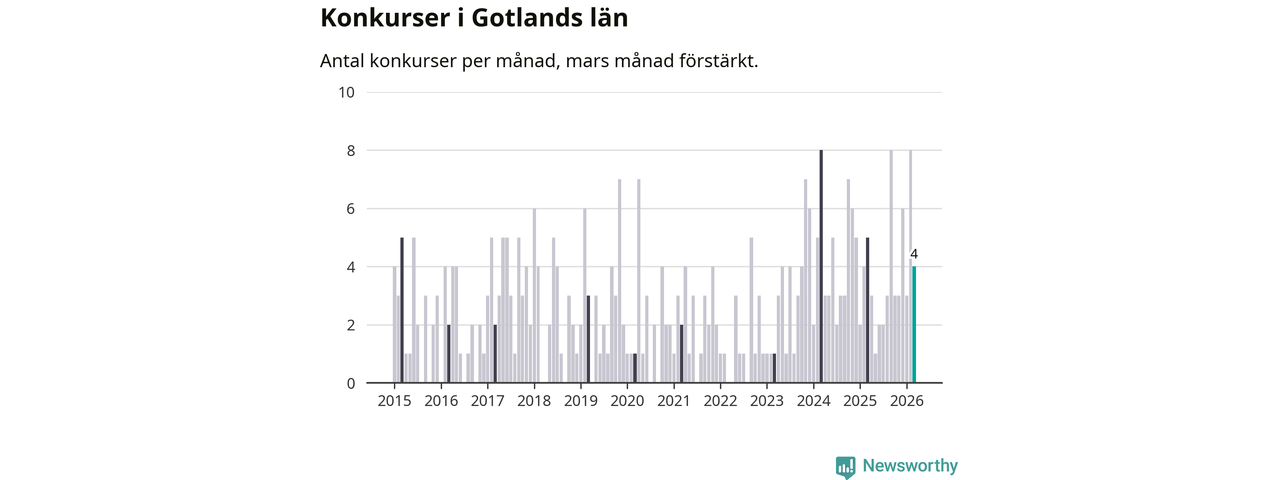 Under mars månad gick fyra bolag med säte på Gotland i konkurs. I fjol noterades fem konkurser under mars.