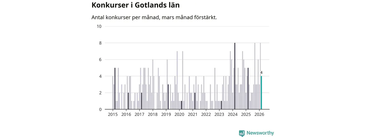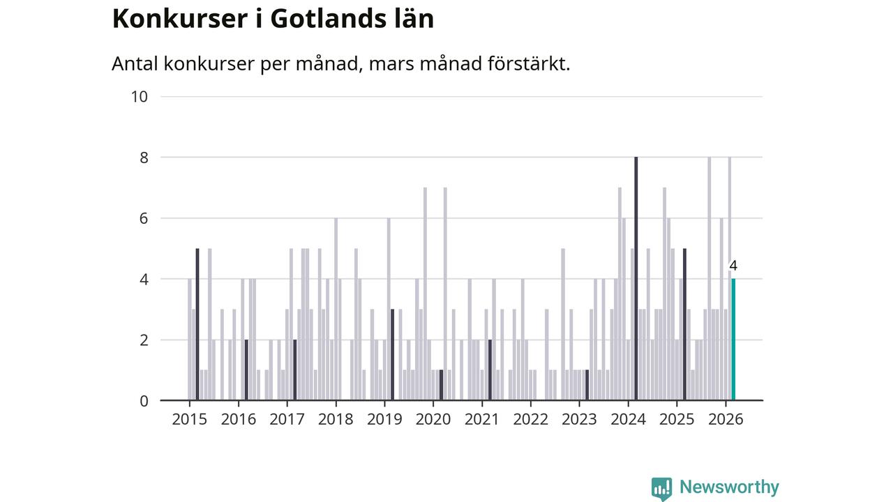 Sedan början av året har 15 företag gått i konkurs på Gotland. Det kan jämföras med elva företag under motsvarande tid år 2025 (+36 procent).