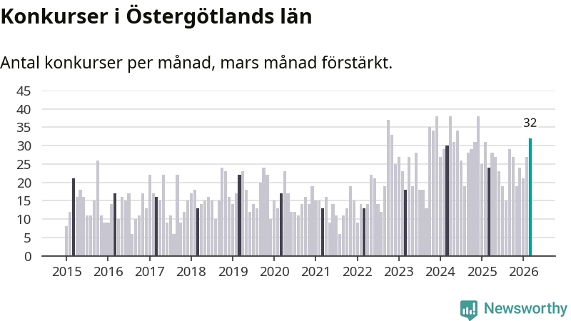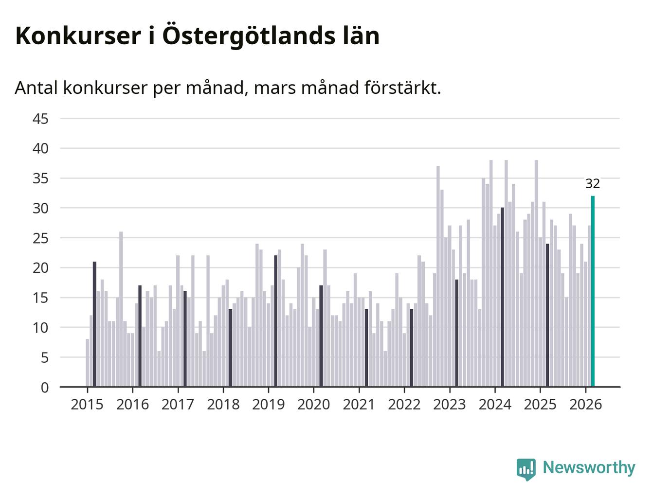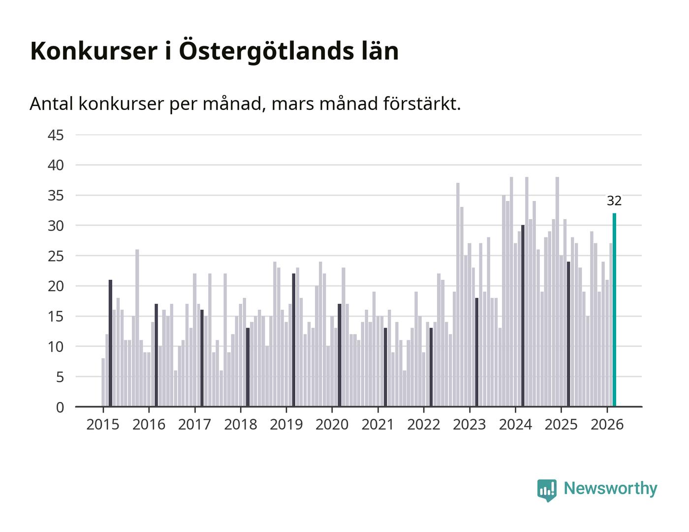 Under mars månad gick 32 bolag med säte i Östergötland i konkurs. Det är fler än normalt för den här tiden på året sett till de senaste elva åren. I fjol noterades 24 konkurser under mars.