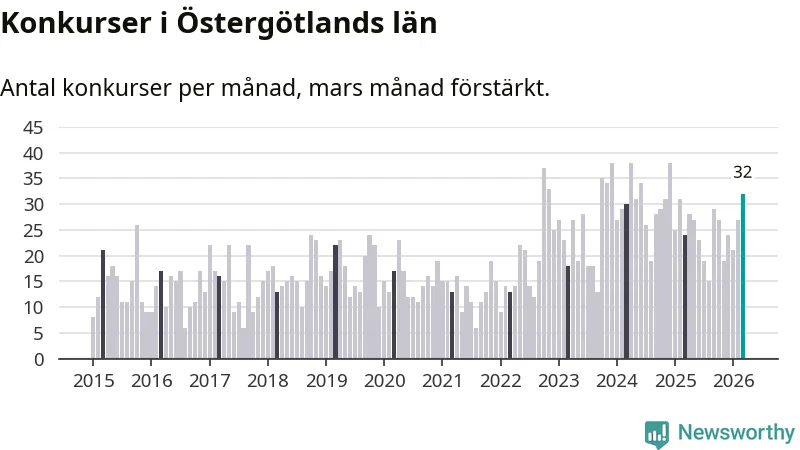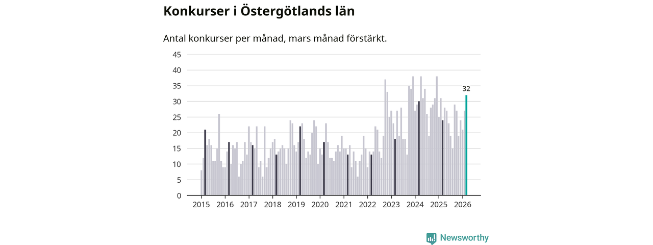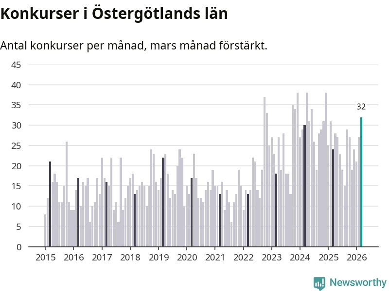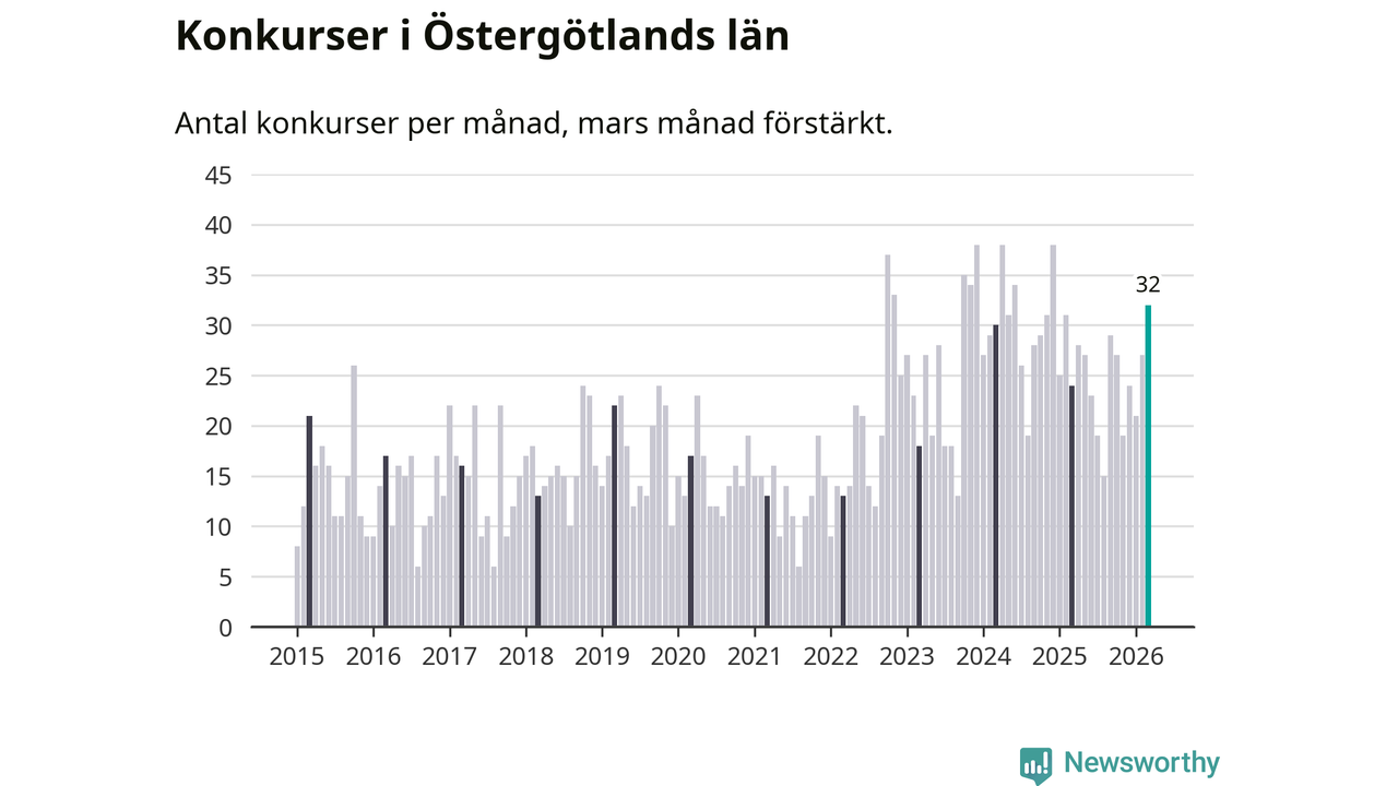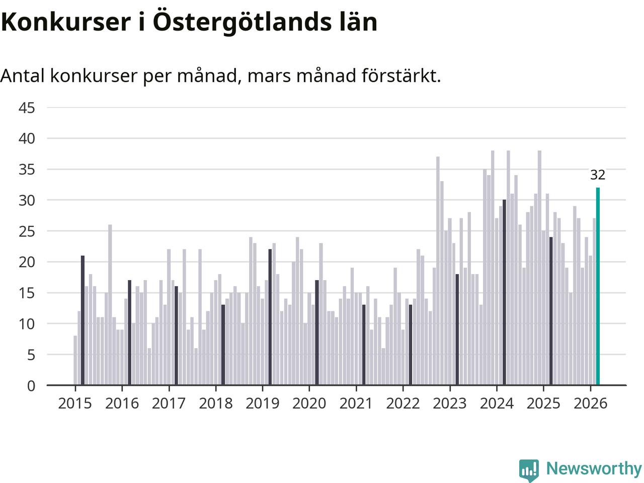 Under mars månad gick 32 bolag med säte i Östergötland i konkurs. Det är fler än normalt för den här tiden på året sett till de senaste elva åren. I fjol noterades 24 konkurser under mars.