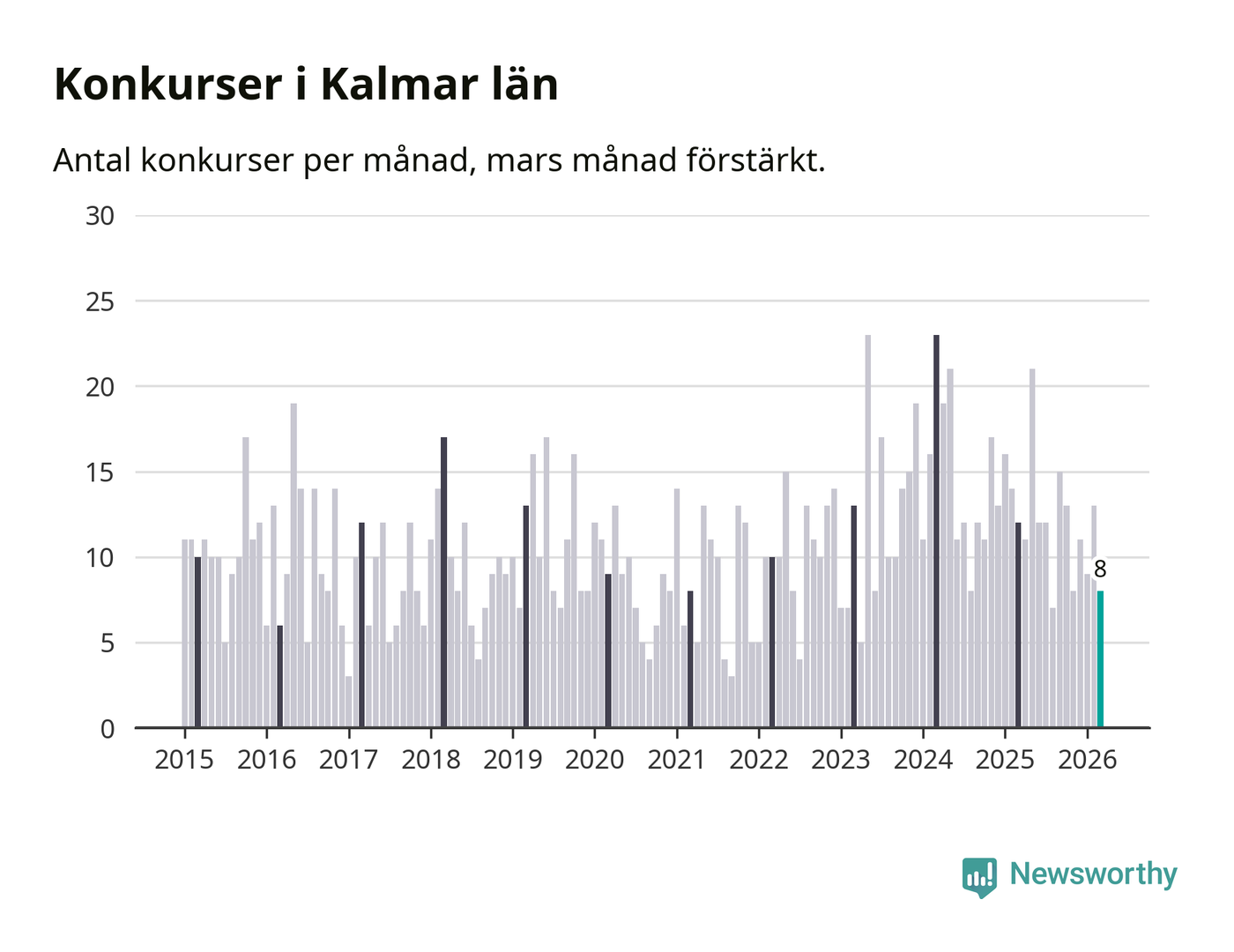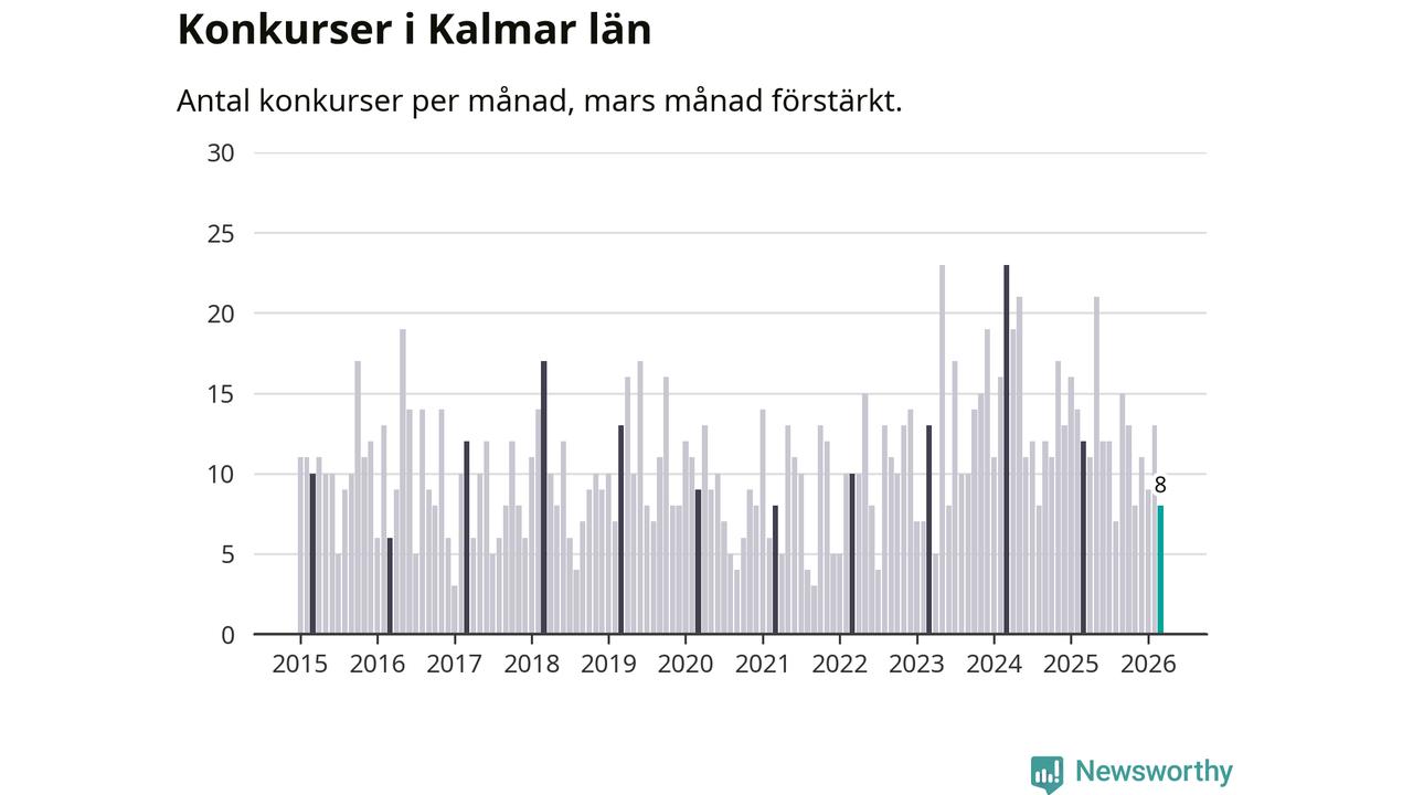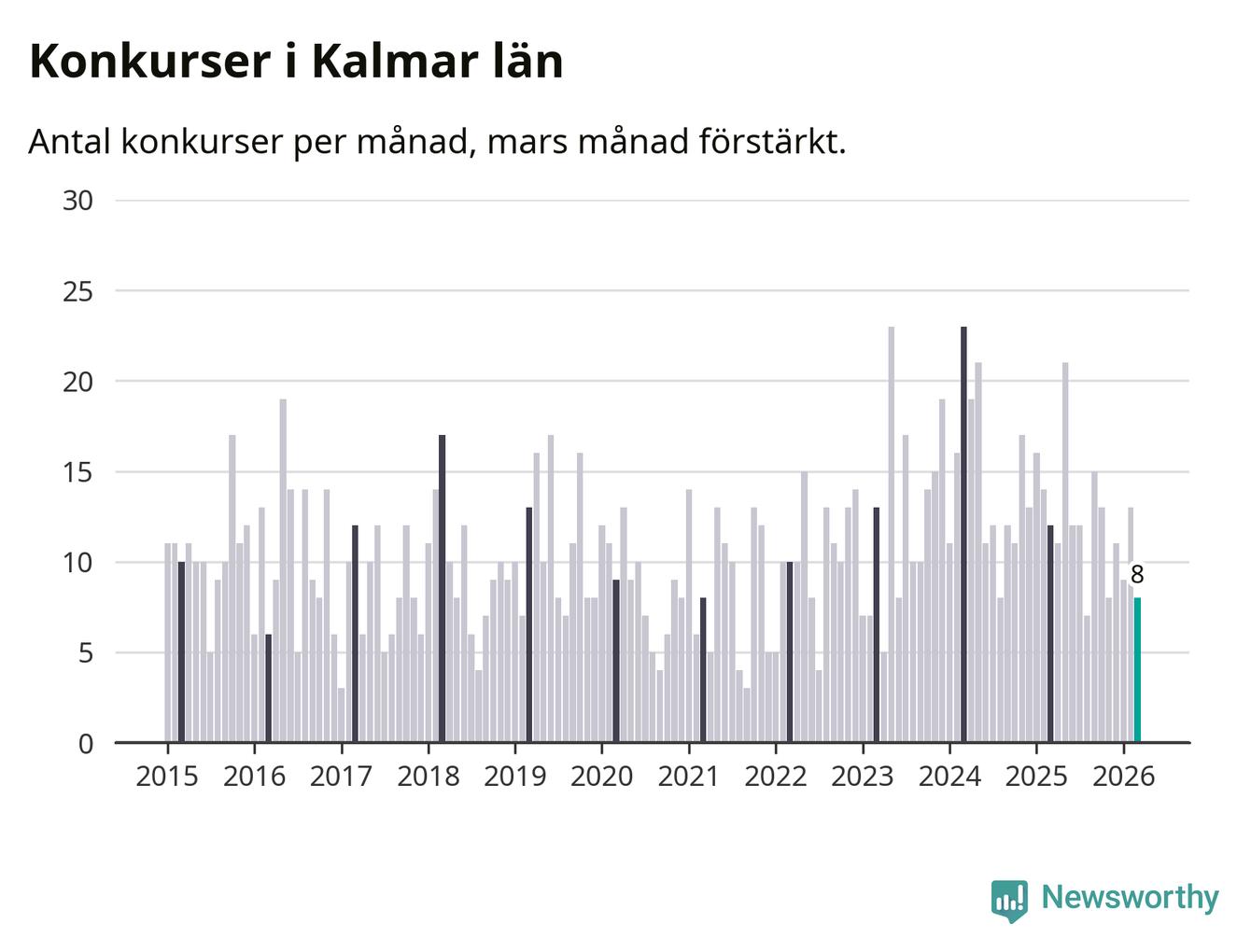 Under mars månad gick åtta bolag med säte i Kalmar län i konkurs. Det är en tämligen normal nivå för den här tiden på året. I fjol noterades tolv konkurser under mars.