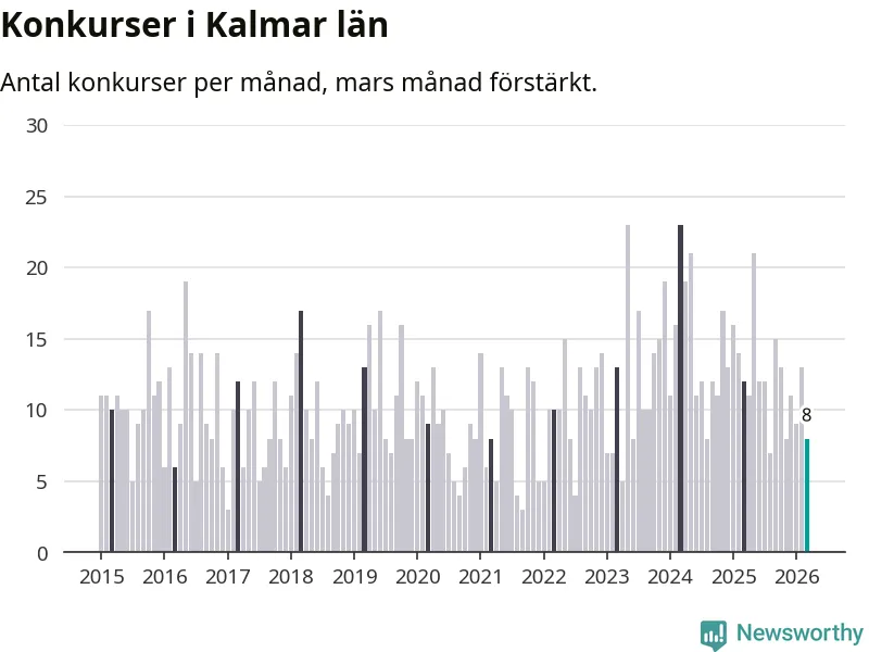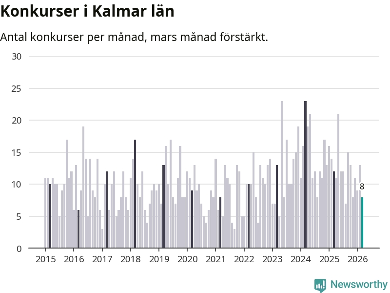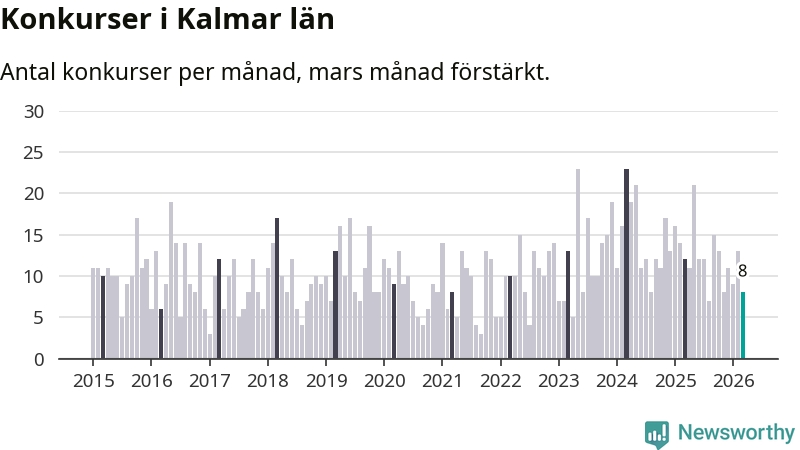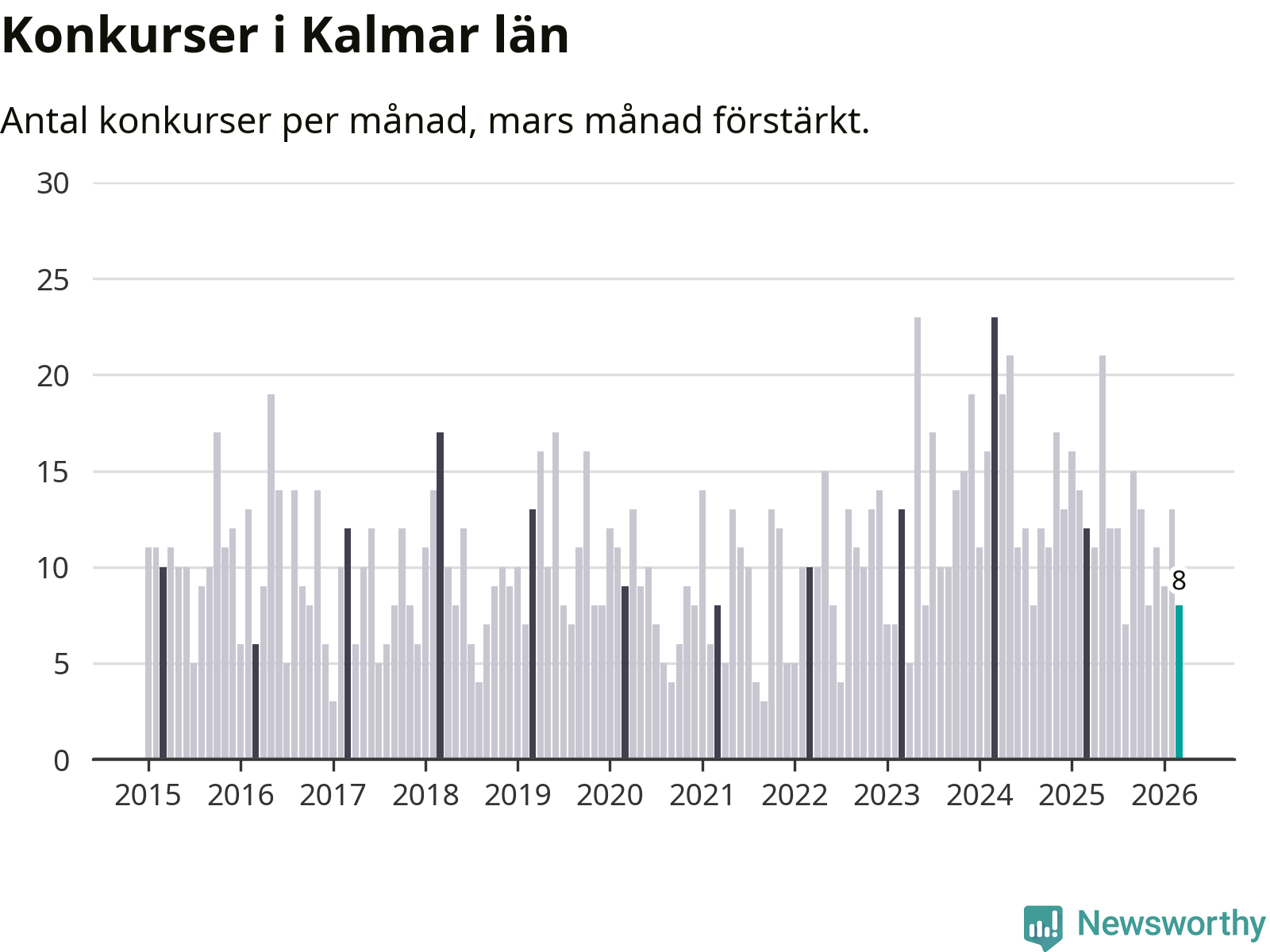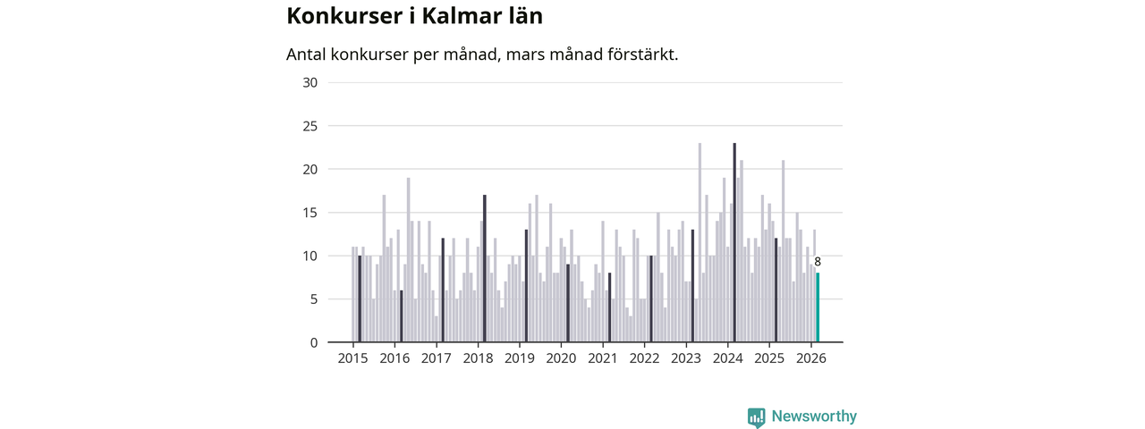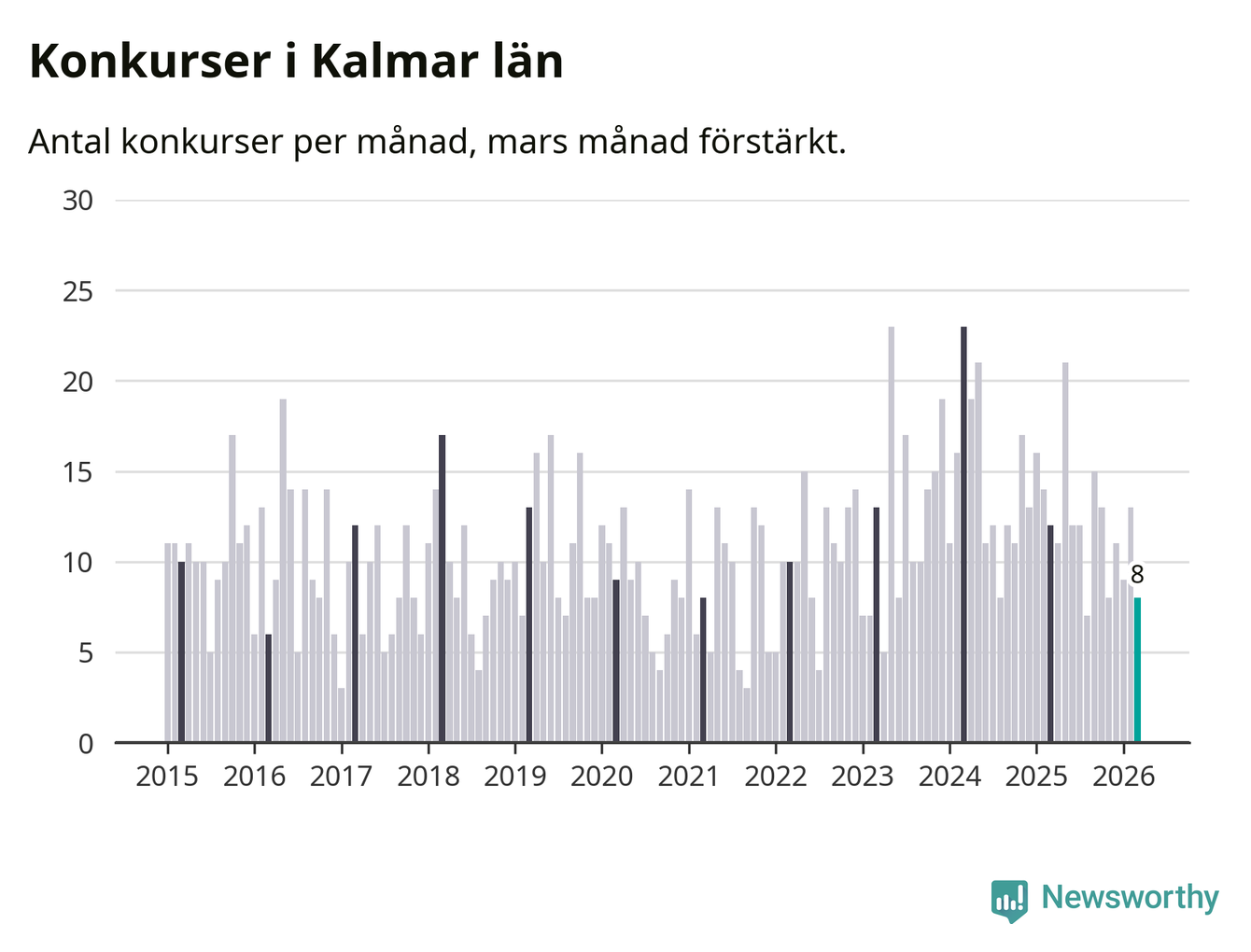 Under mars månad gick åtta bolag med säte i Kalmar län i konkurs. Det är en tämligen normal nivå för den här tiden på året. I fjol noterades tolv konkurser under mars.