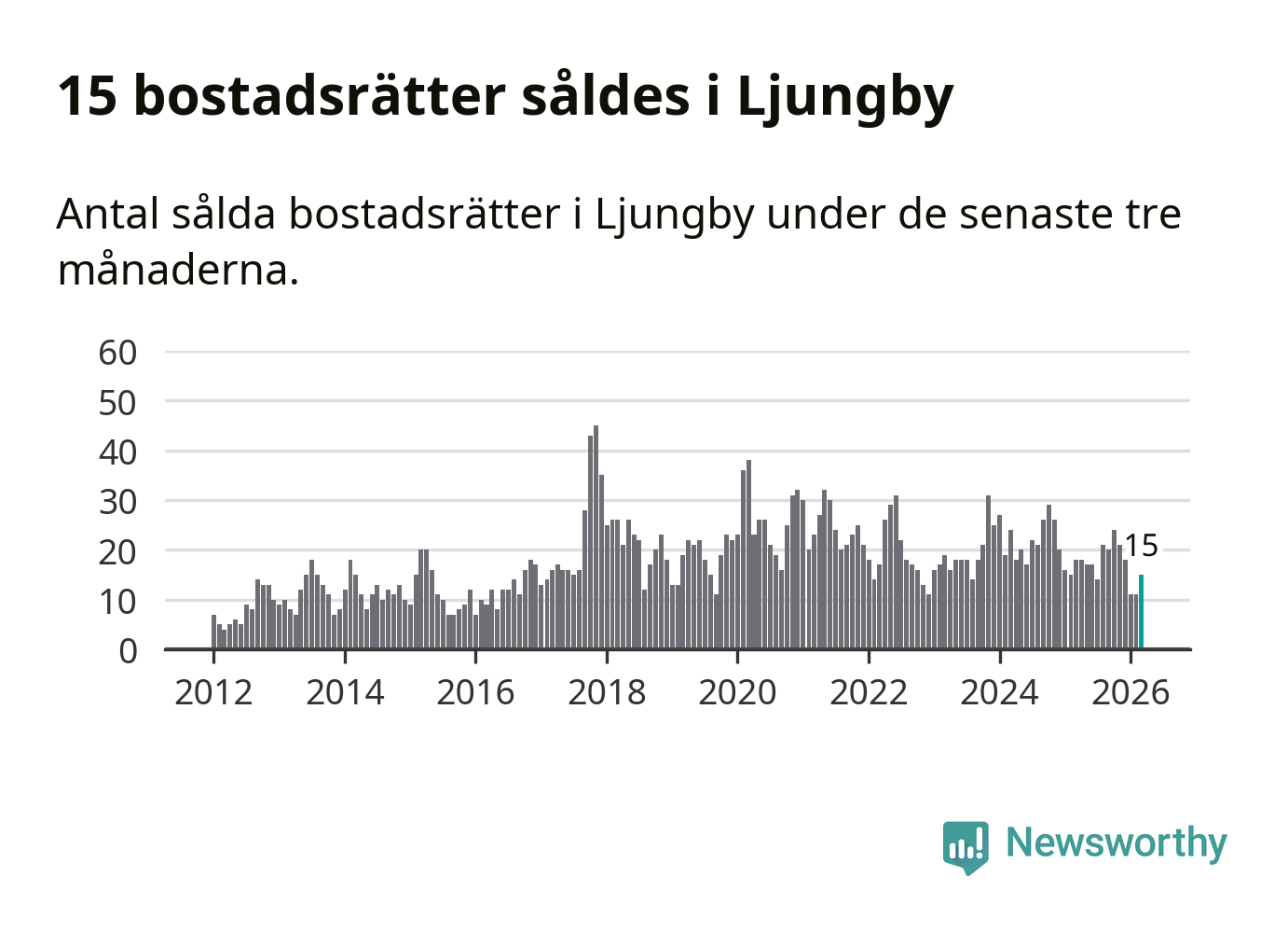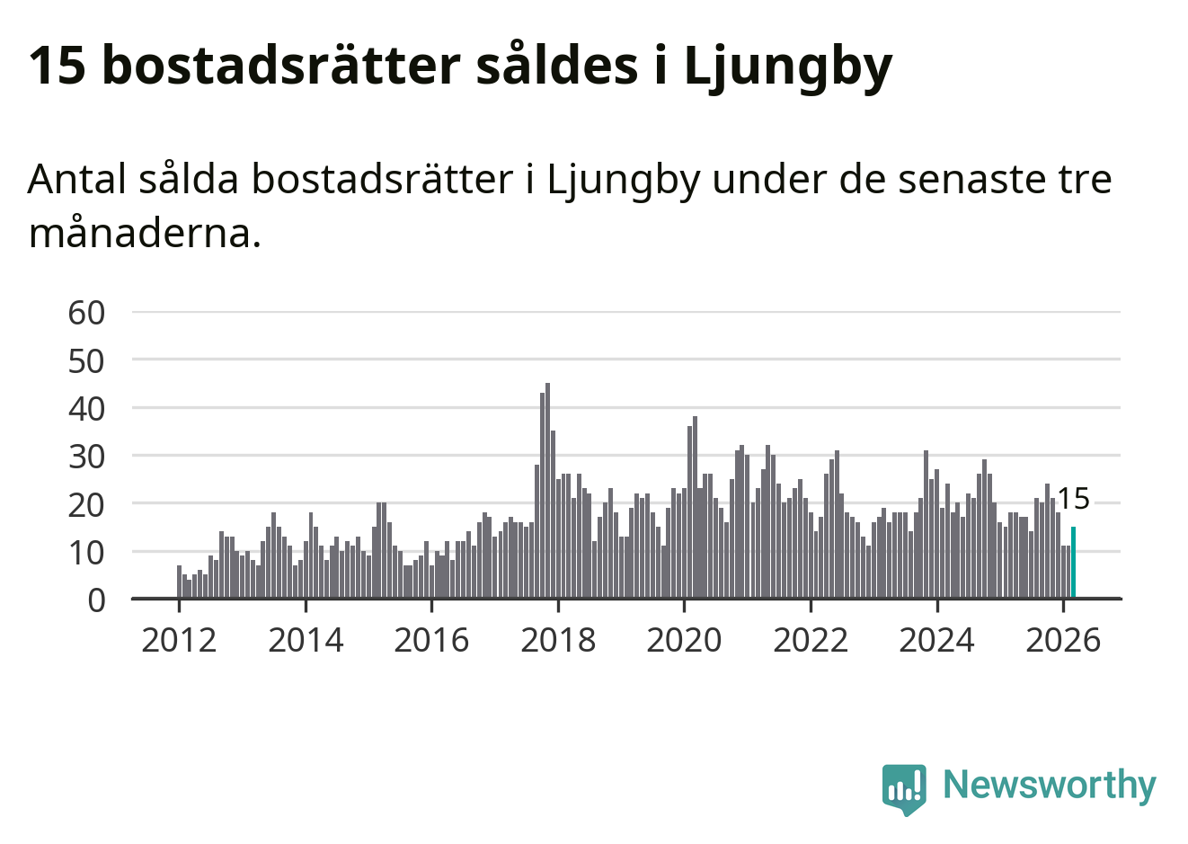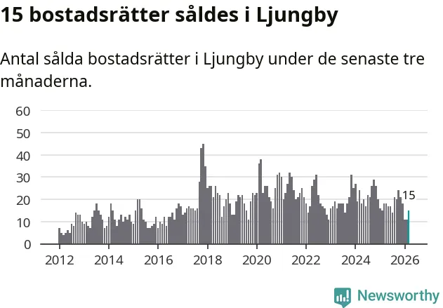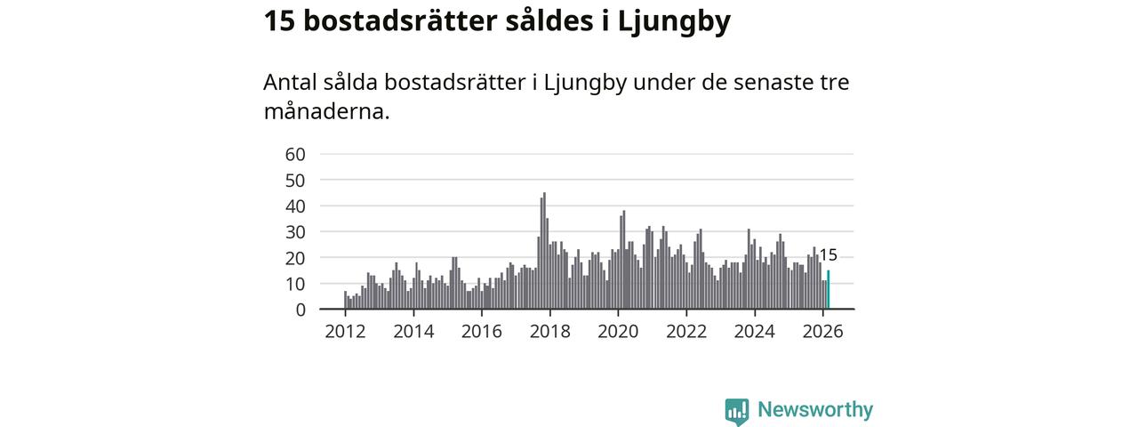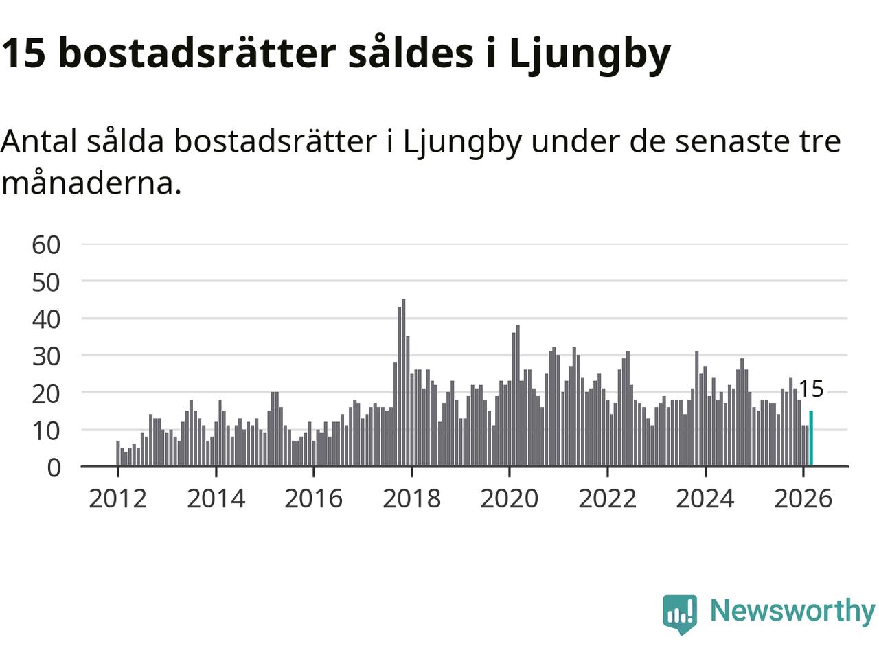 Mellan januari och mars gjordes sammanlagt 15 affärer med bostadsrätter i Ljungby kommun. Det kan jämföras med 18 vid motsvarande tid i fjol.