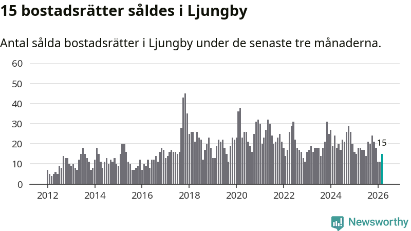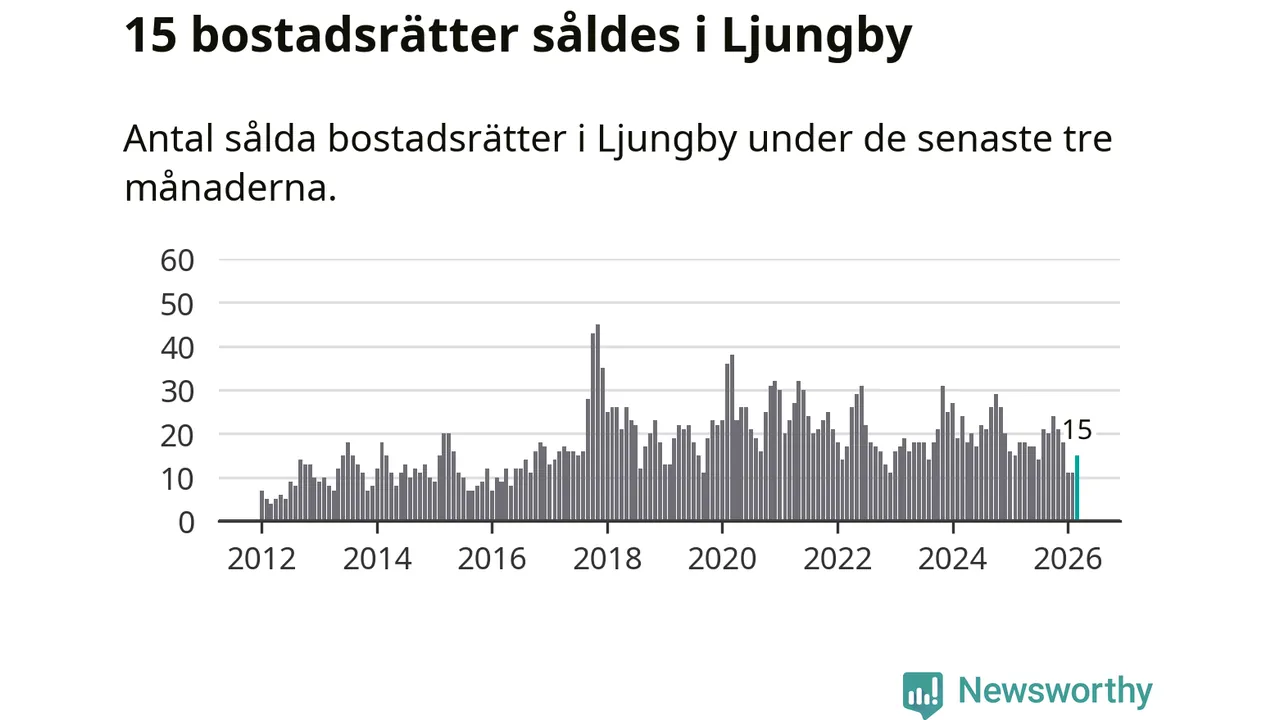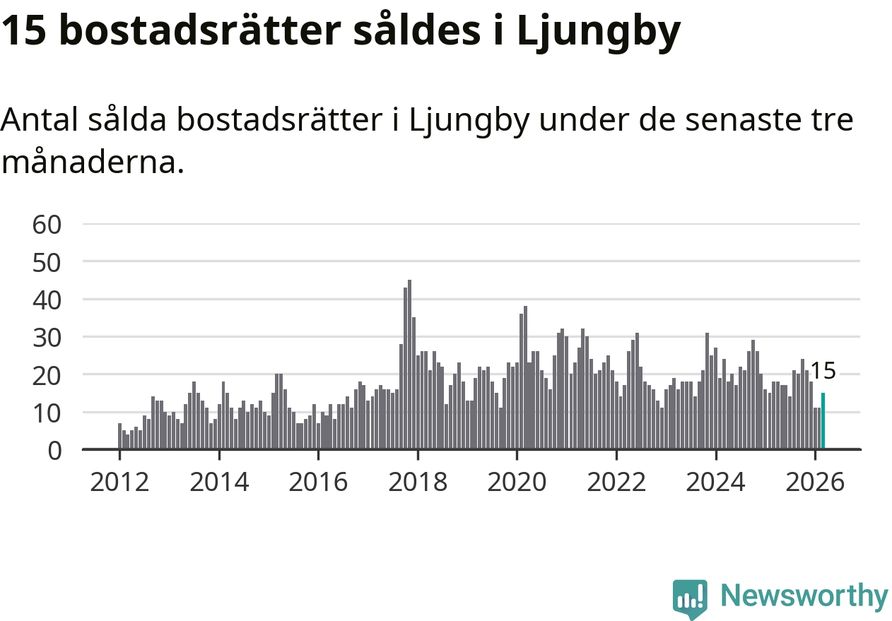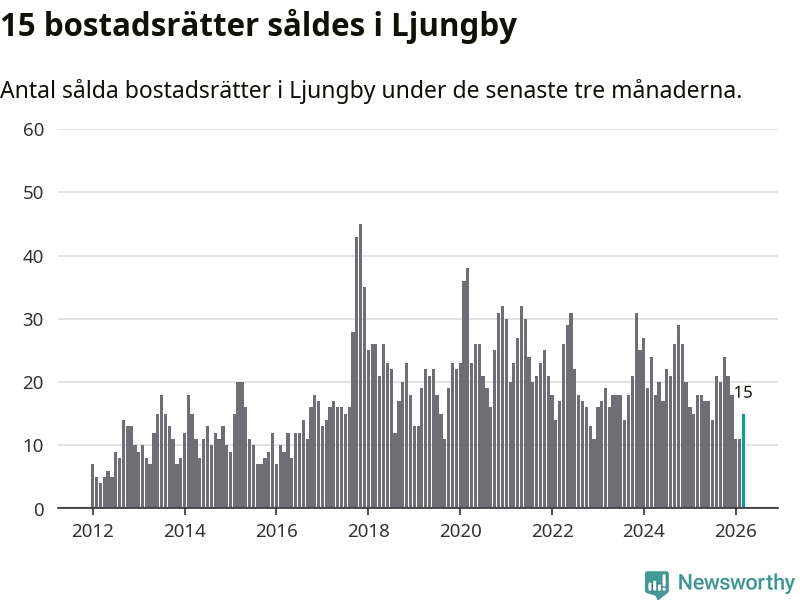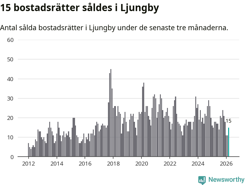 Mellan januari och mars gjordes sammanlagt 15 affärer med bostadsrätter i Ljungby kommun. Det kan jämföras med 18 vid motsvarande tid i fjol.
