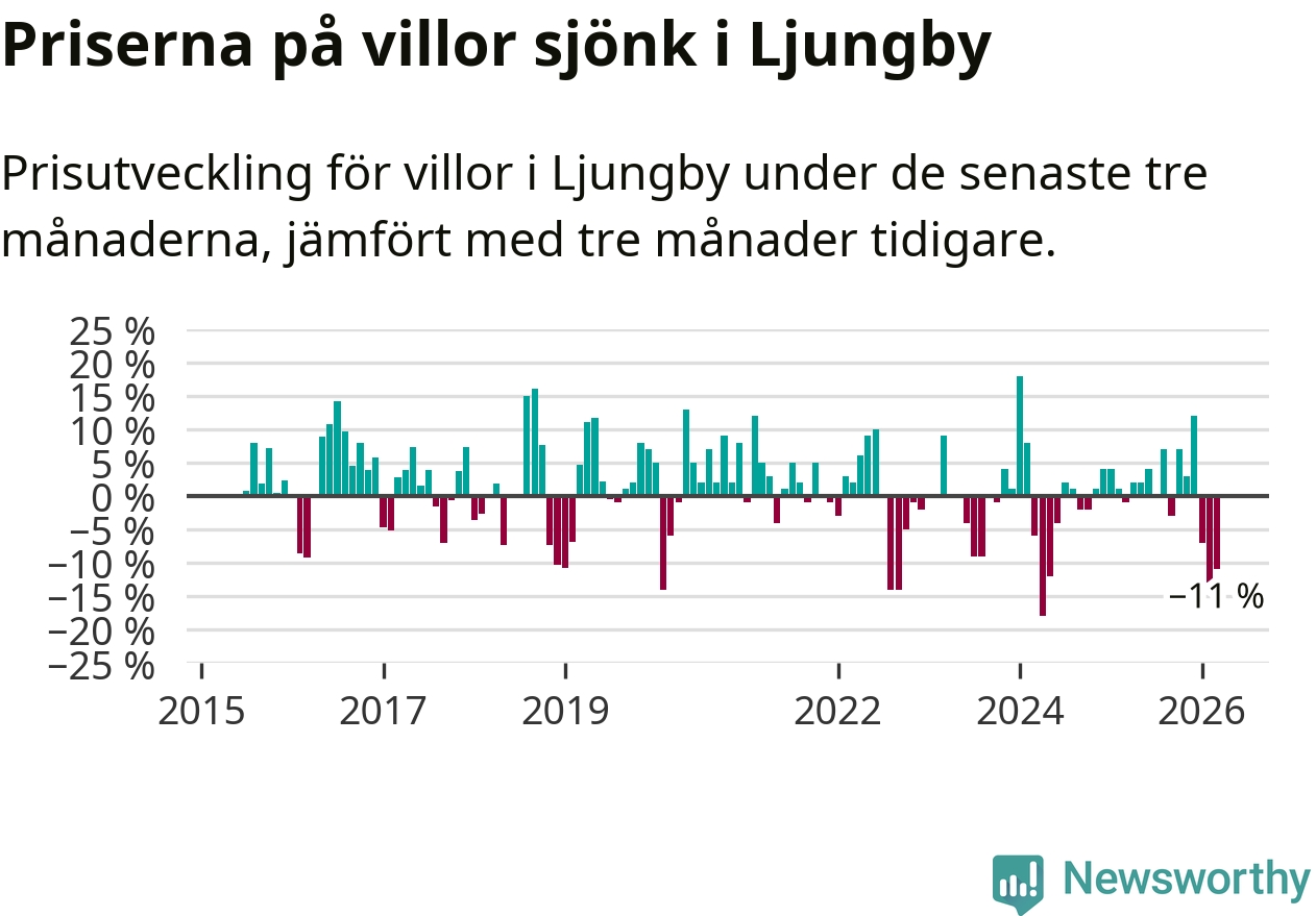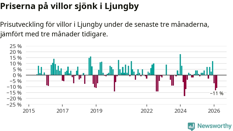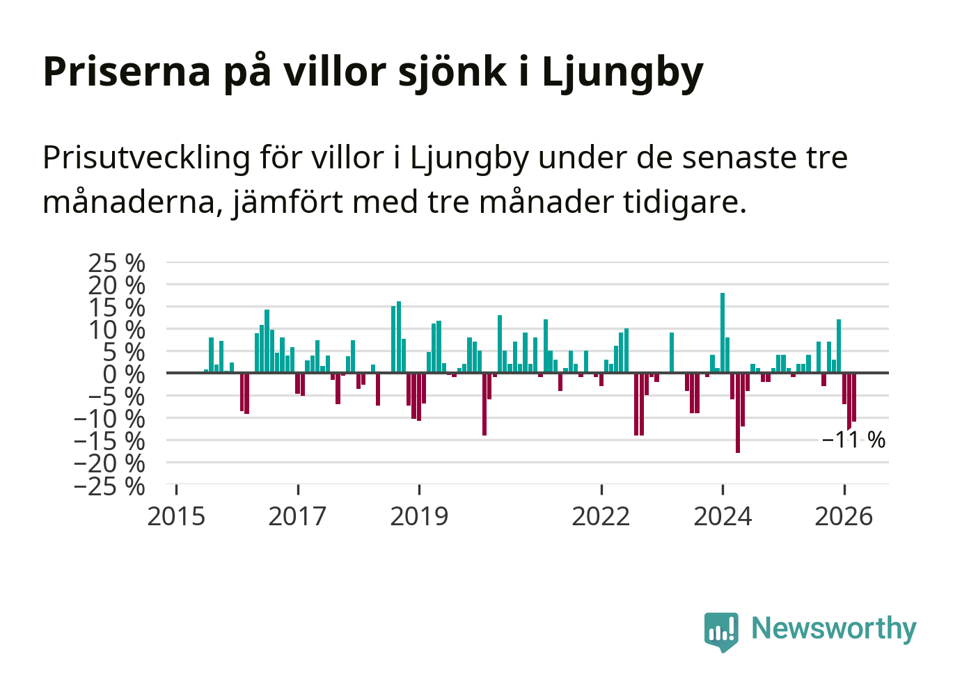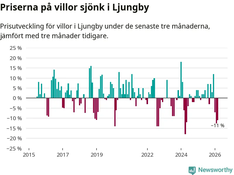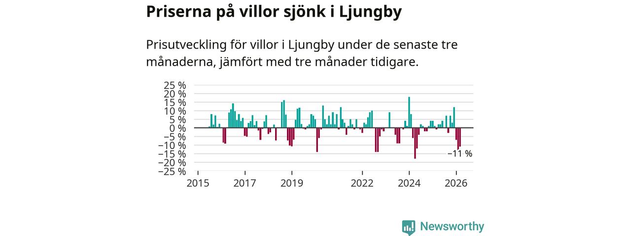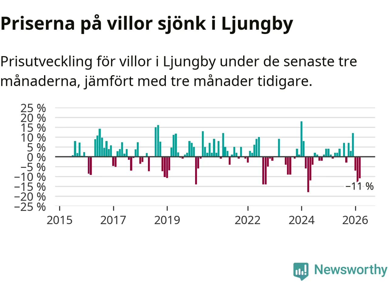 Villapriserna sjönk mellan januari och mars med 11 procent i Ljungby kommun. Det är en betydande nedgång jämfört med det gångna året då priserna i snitt stått stilla.