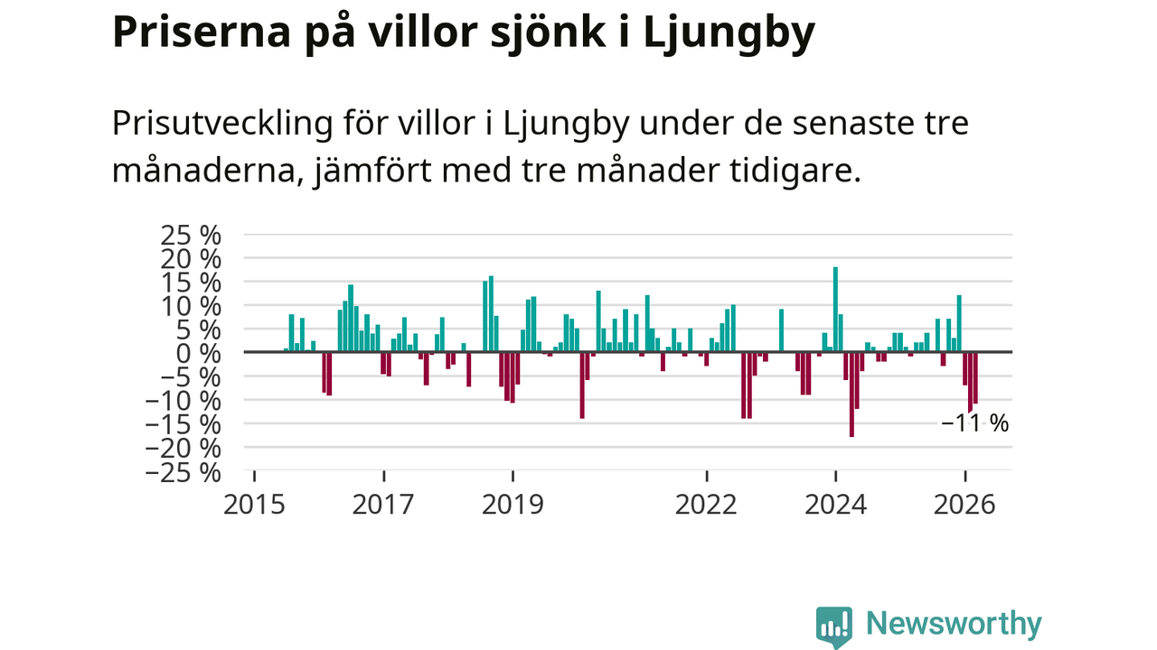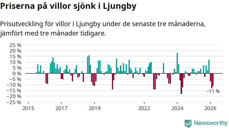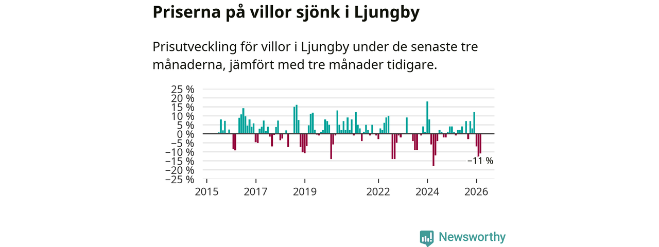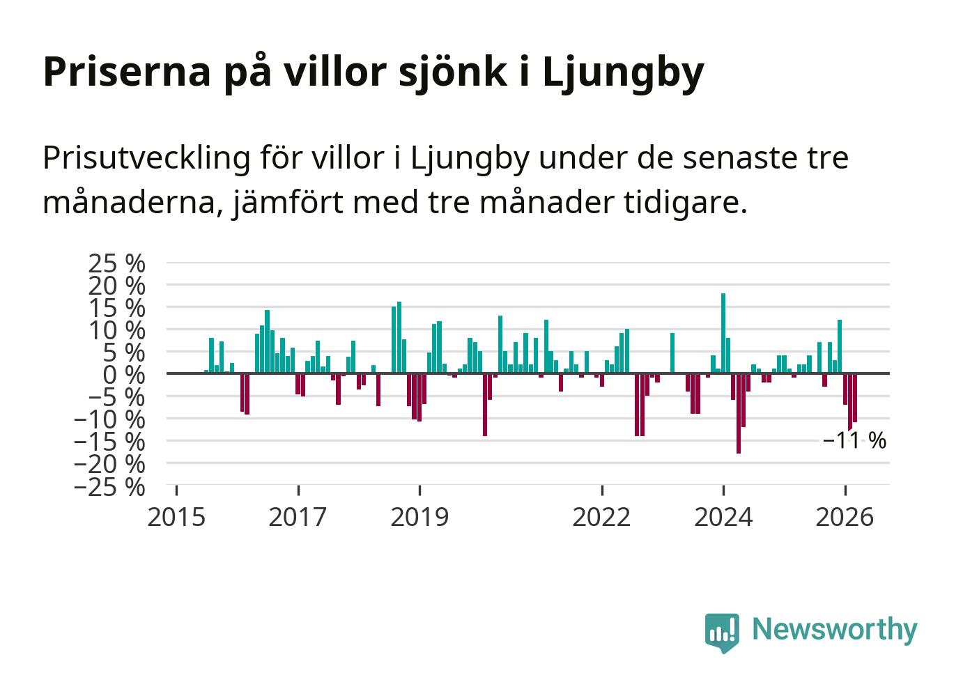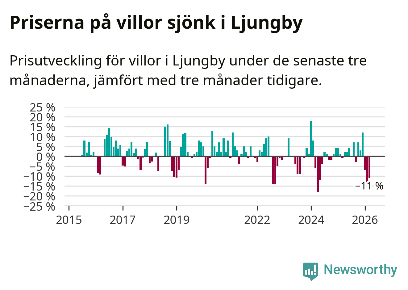 Villapriserna sjönk mellan januari och mars med 11 procent i Ljungby kommun. Det är en betydande nedgång jämfört med det gångna året då priserna i snitt stått stilla.