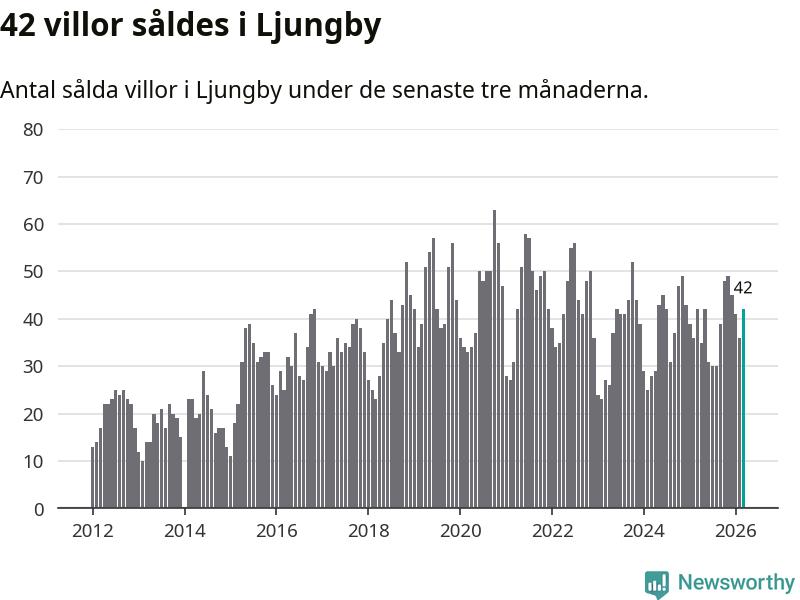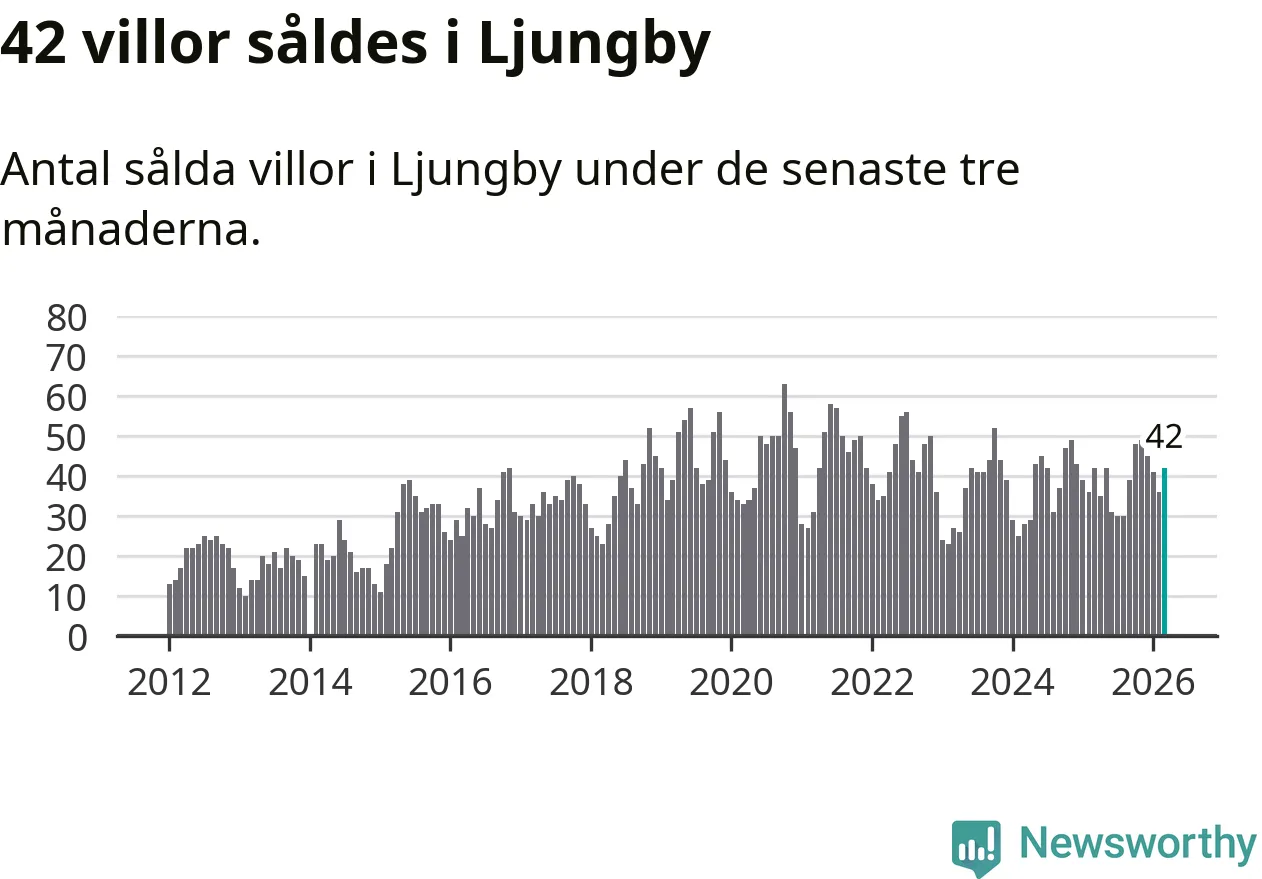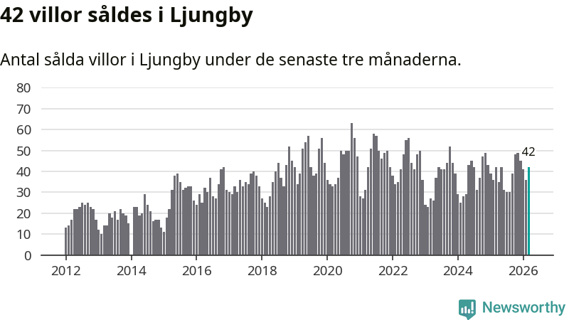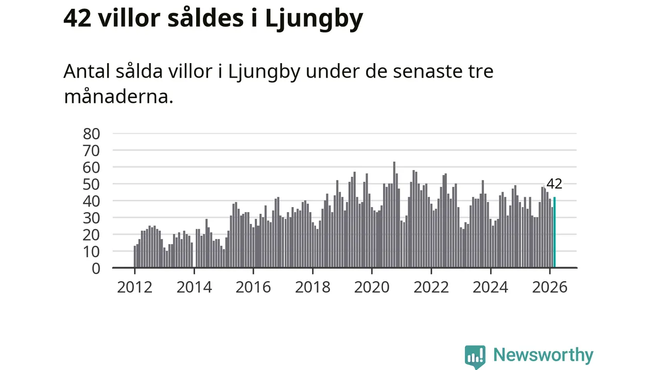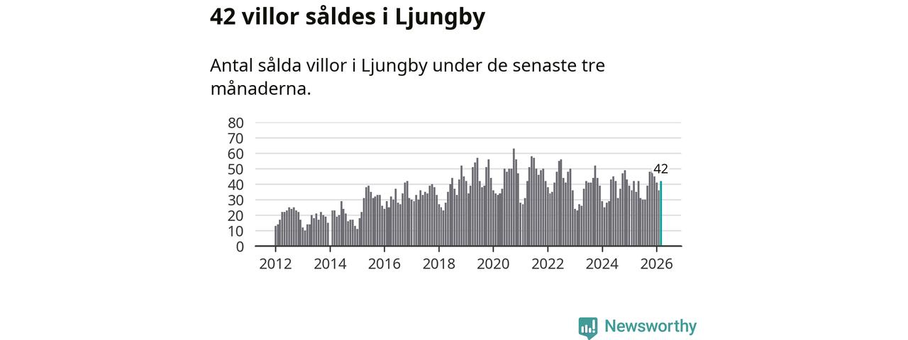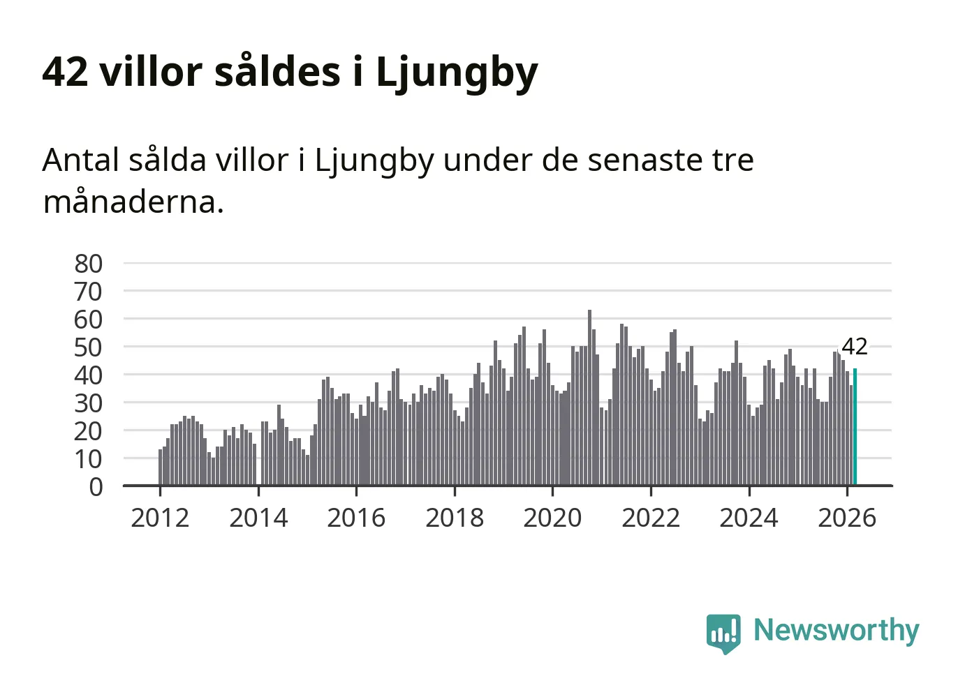 Sammanlagt såldes 42 villor i Ljungby kommun mellan januari och mars till ett genomsnittligt pris på 1,8 miljoner kronor. I fjol gjordes 42 affärer vid den här tiden på året.