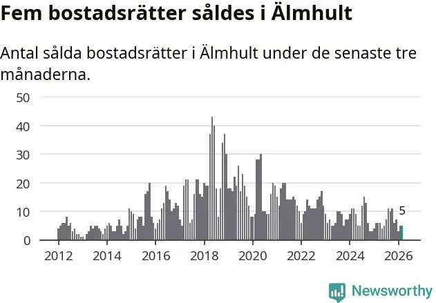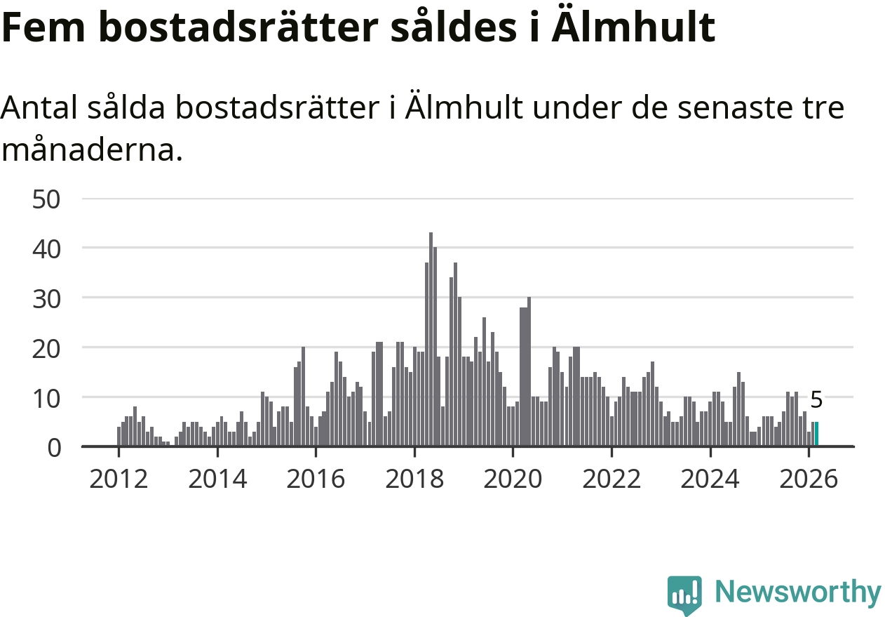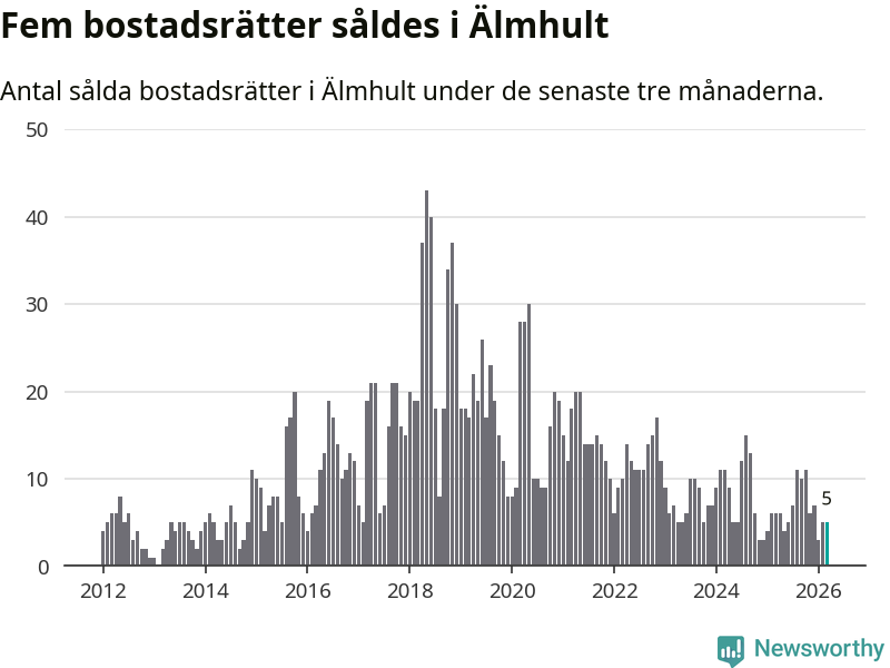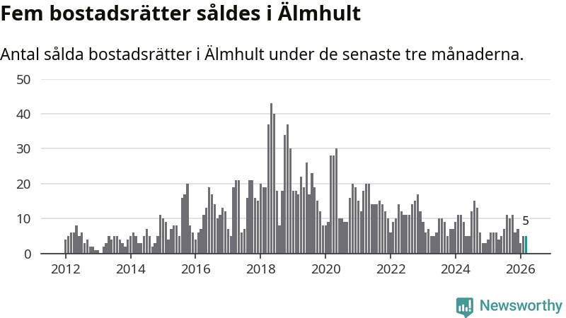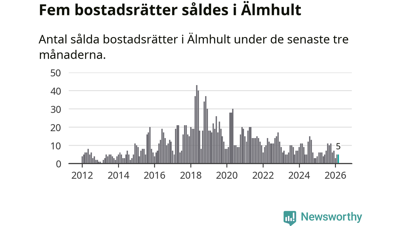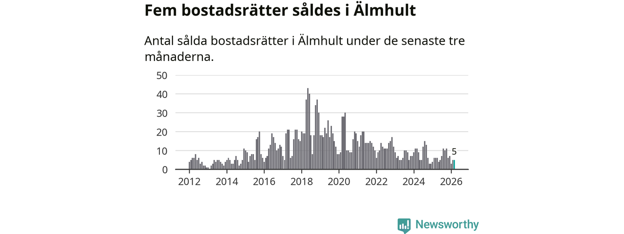 Mellan januari och mars gjordes sammanlagt fem affärer med bostadsrätter i Älmhults kommun. Det kan jämföras med sex vid motsvarande tid i fjol.