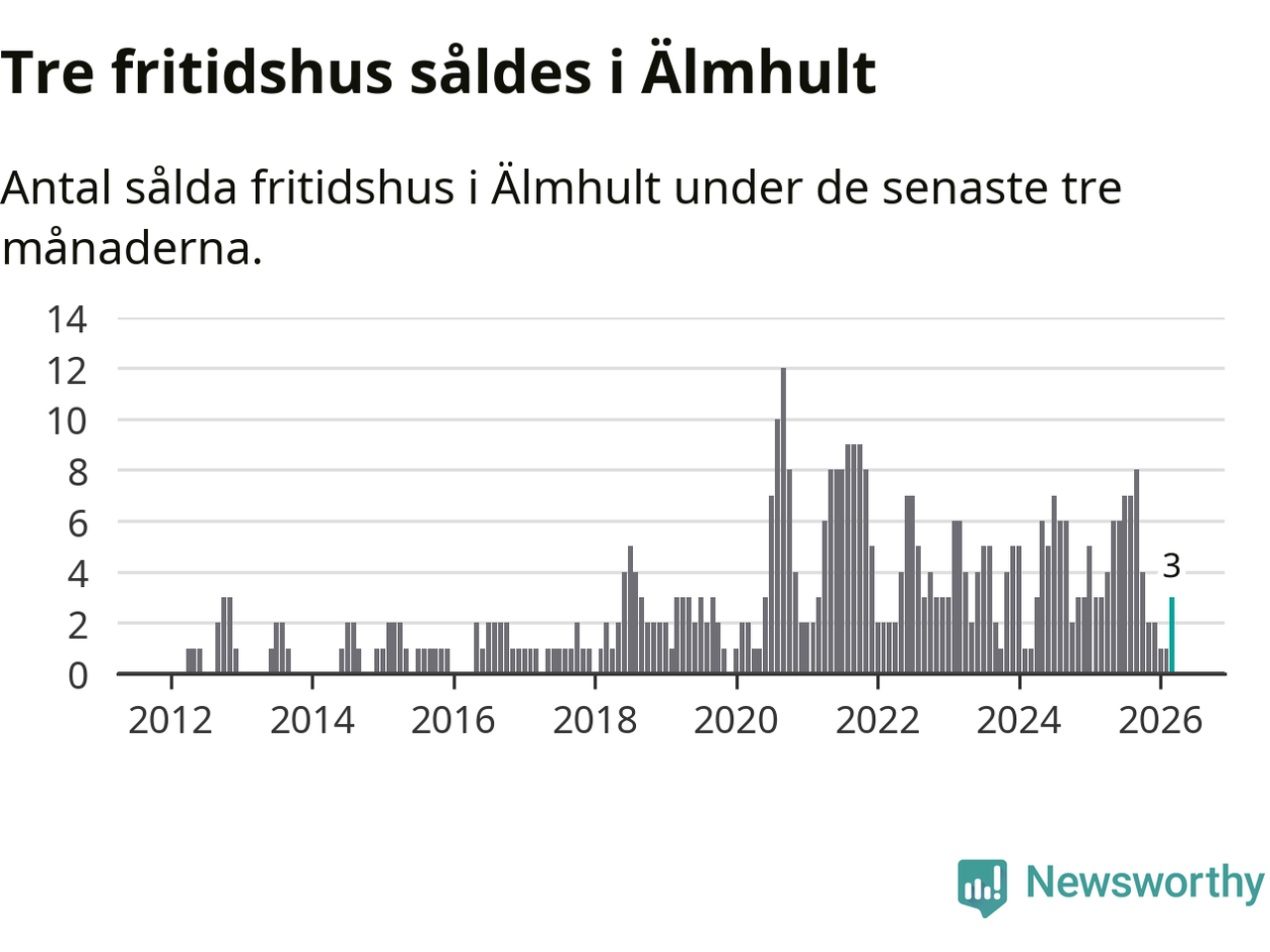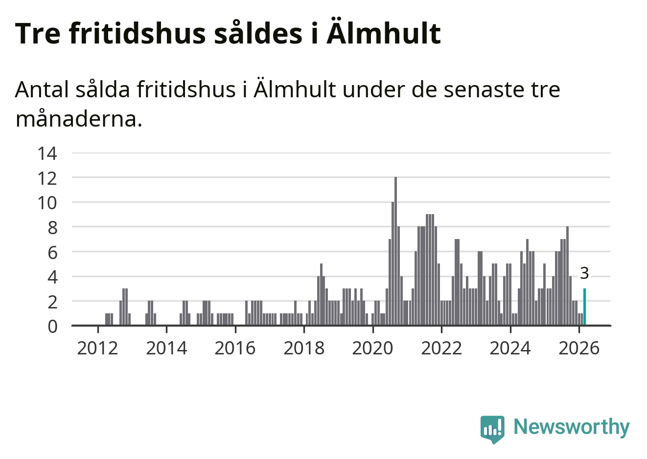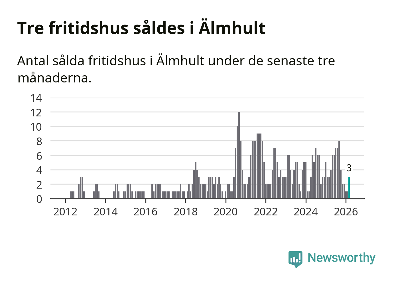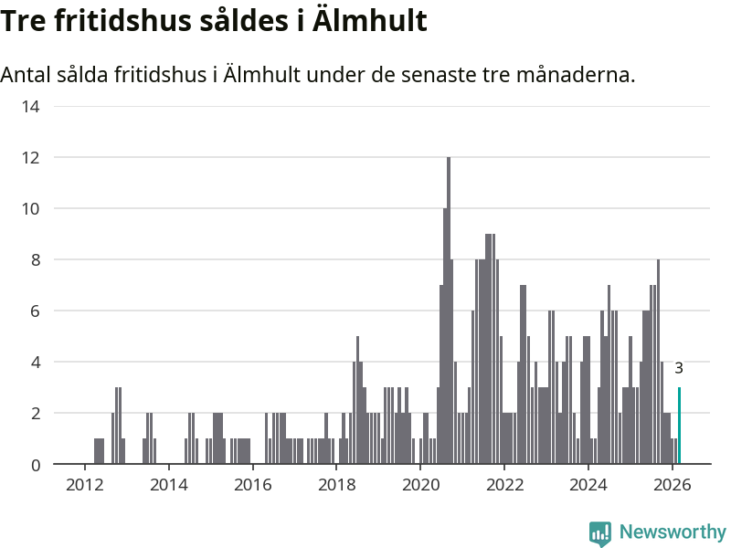 Mellan januari och mars gjordes sammanlagt tre affärer med fritidshus i Älmhults kommun. Det är lika många affärer som vid motsvarande tid i fjol.